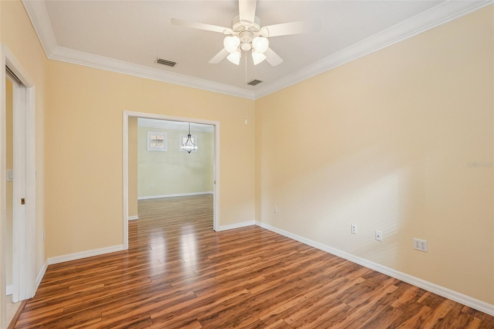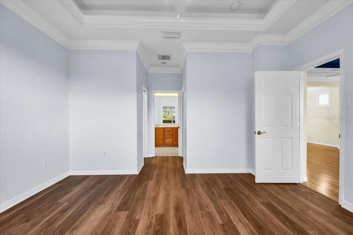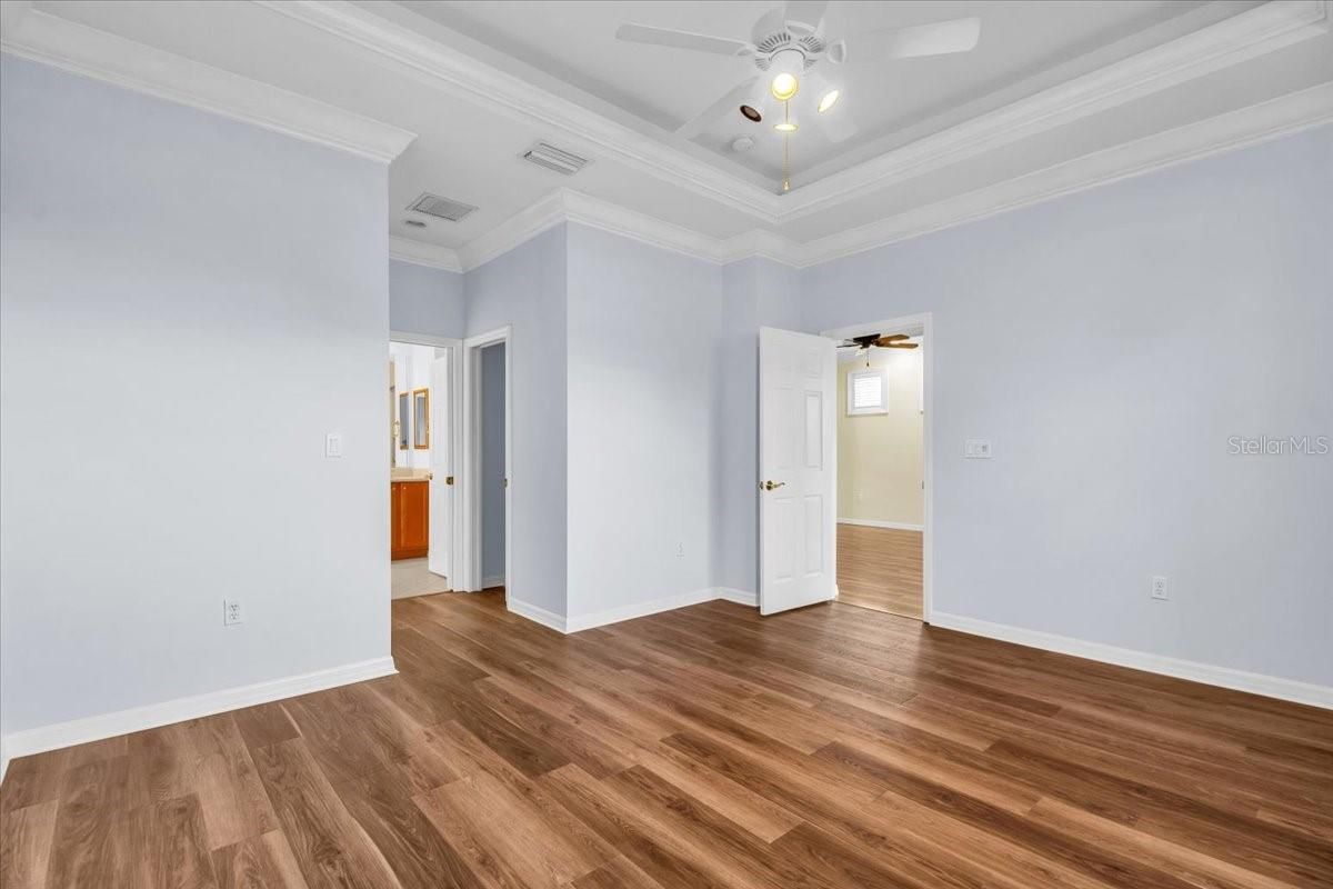 - Ceiling Fan(s), Crown Molding, High Ceilings, Living/Dining Room, Open Floorplan, Main Level Primary, Solid Surface Counters, Walk-In Closet(s)