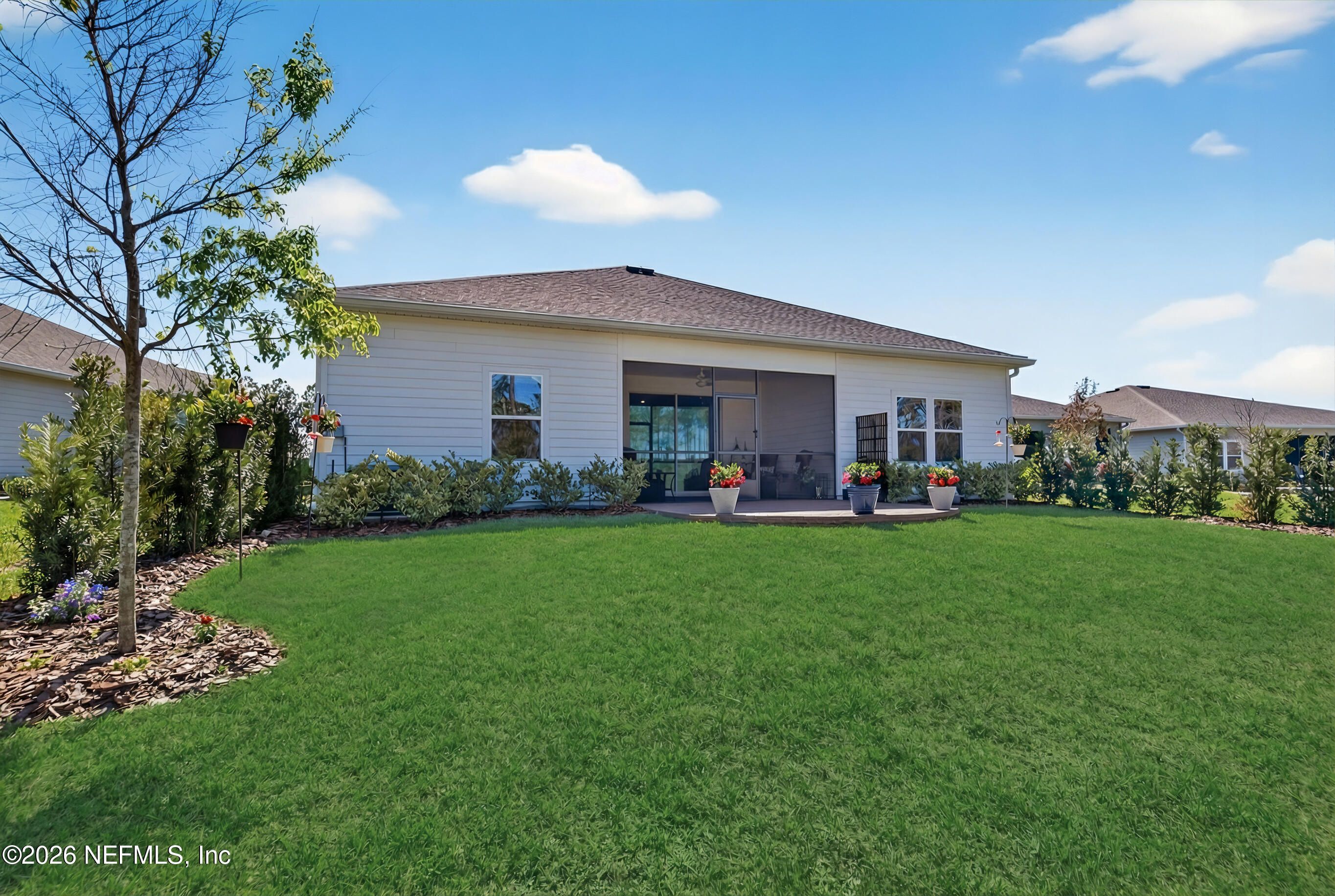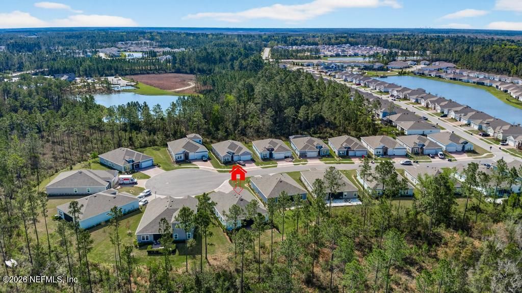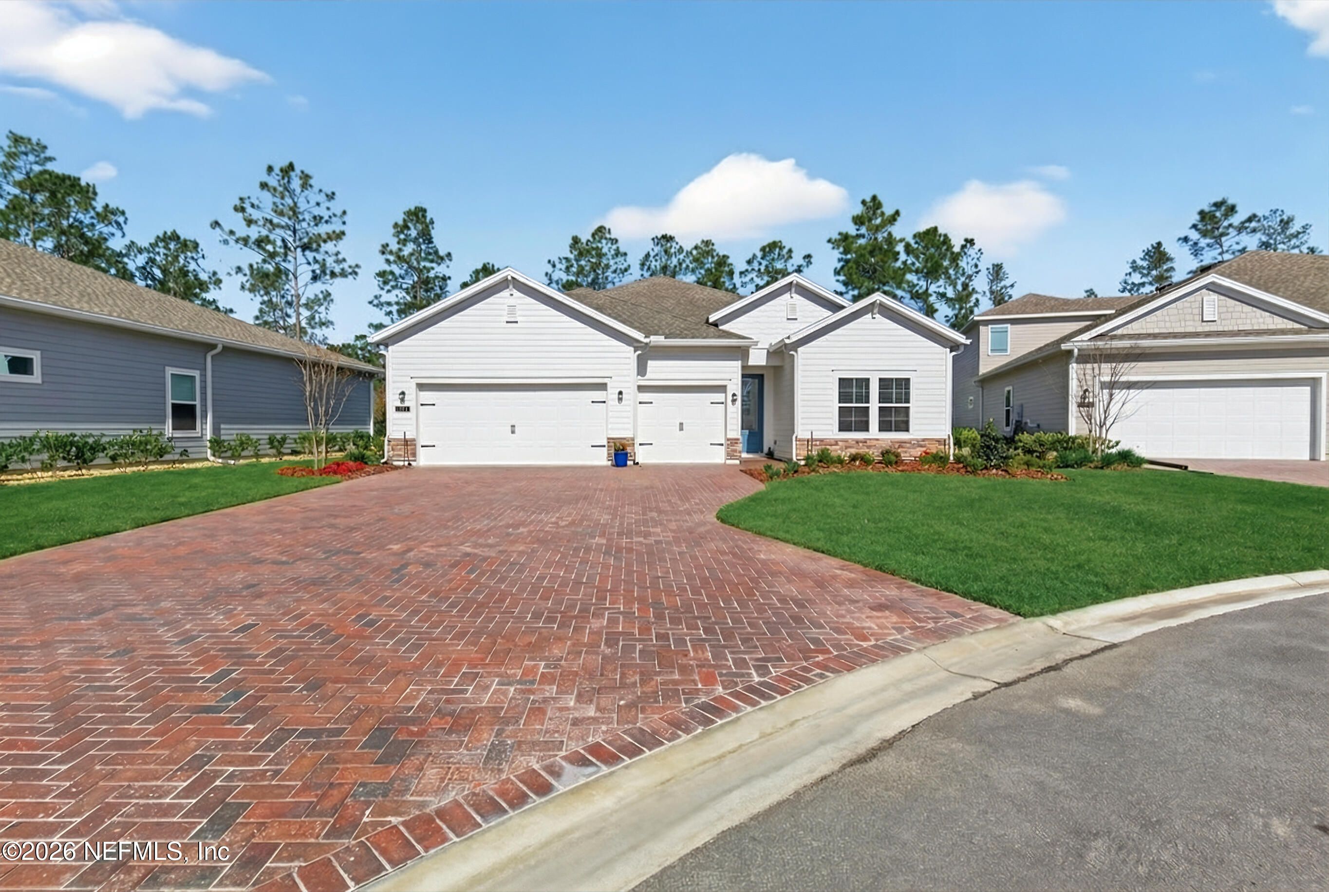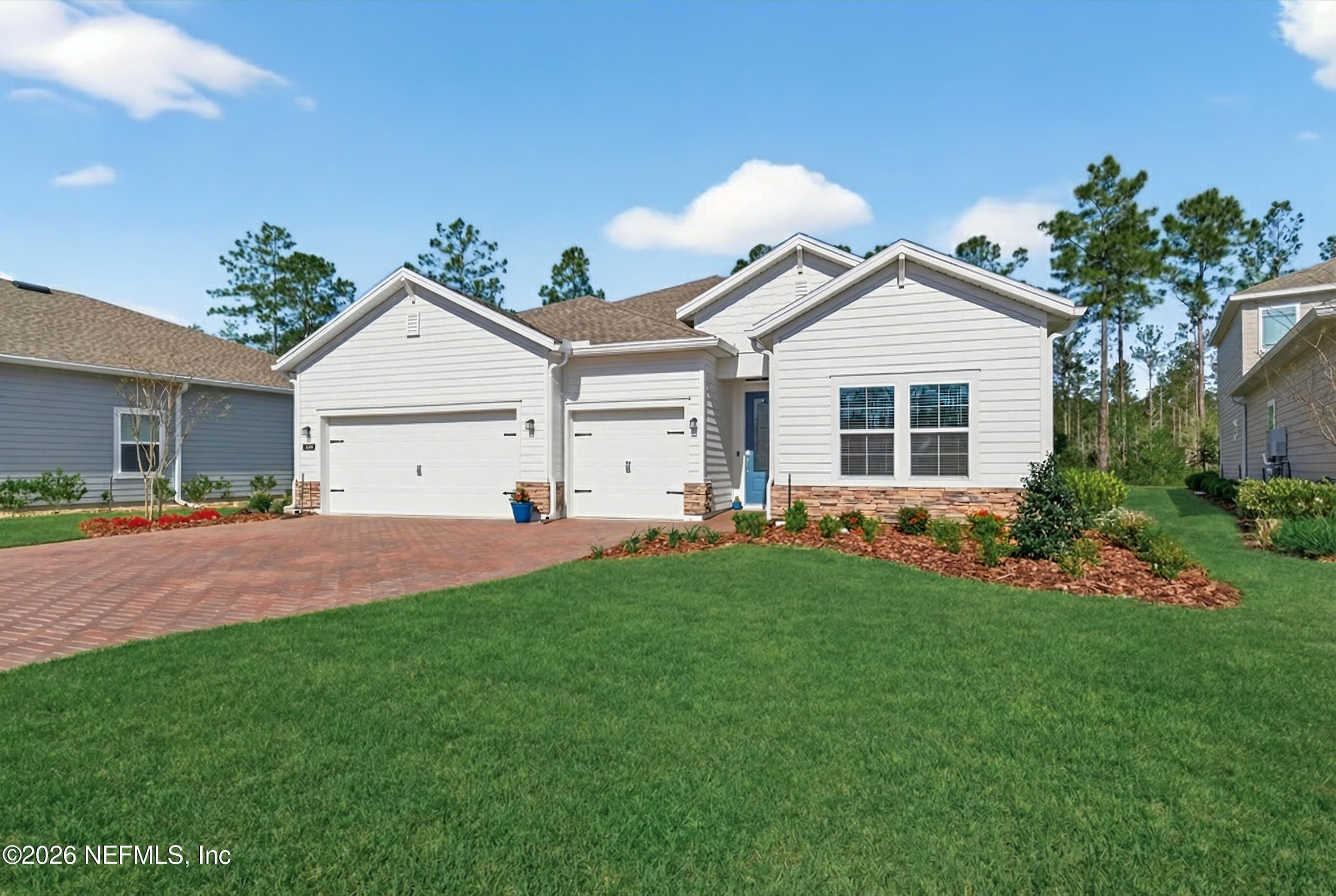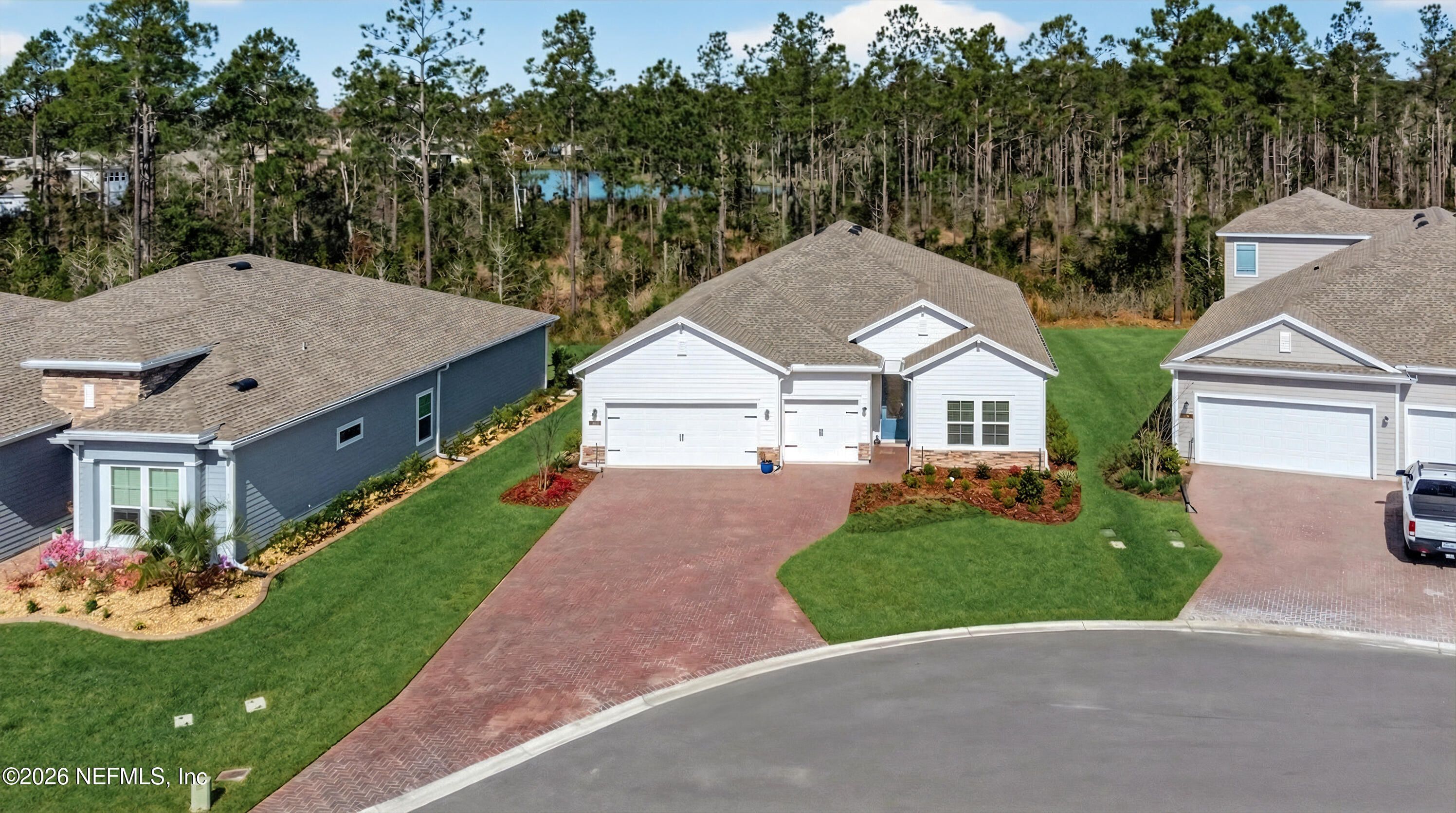 Beautifully maintained, like-new home in the Tributary Lakeside 55+ community featuring the popular Tivoli floor plan. This home offers 4 bedrooms, 3 full bathrooms, and an oversized 3-car garage with approximately 2,288 sq ft of living space. Spacious kitchen includes a large center island with bar seating, stainless steel appliances, single-basin sink, gas range, white cabinetry, quartz countertops, and breakfast nook. Open-concept layout with family room located just off the kitchen, ideal for entertaining. Split floor plan with three bedrooms and two full bathrooms on one side of the home. Primary suite features a large walk-in closet and en-suite bath with walk-in (California-style) shower, dual vanities, and ample storage. Oversized 3-car garage includes durable shark-coated floors. Located on a cul-de-sac with wooded views and shrubbery on both sides for added privacy. Screened lanai provides comfortable outdoor living space. Tributary Lakeside is a gated 55+ community offering a private clubhouse, heated pool, fitness center, pickleball courts, and billiards room. Residents also have access to Tributary's main amenities, including recreational areas, dog park, and playground. Conveniently located near Fernandina Beach, Jacksonville, and Jacksonville International Airport.