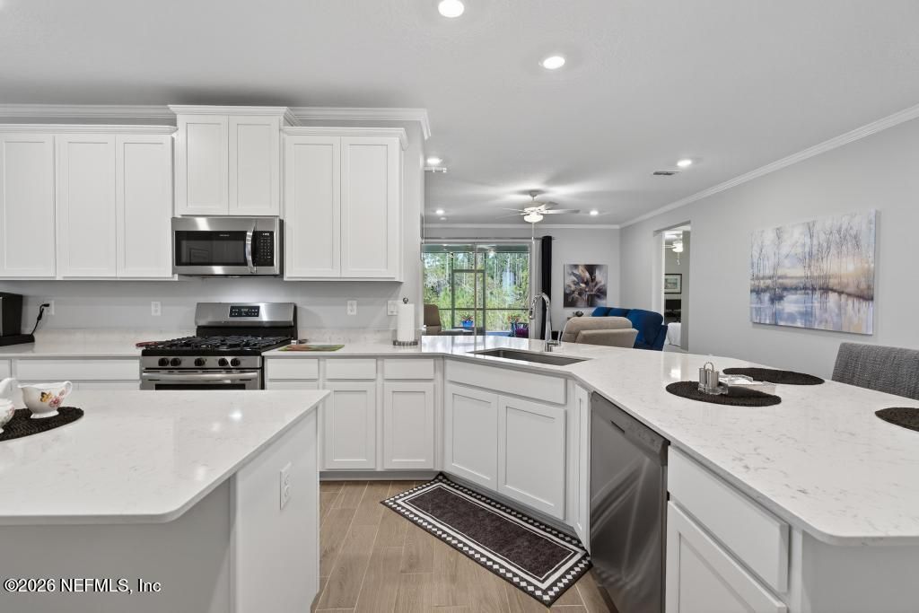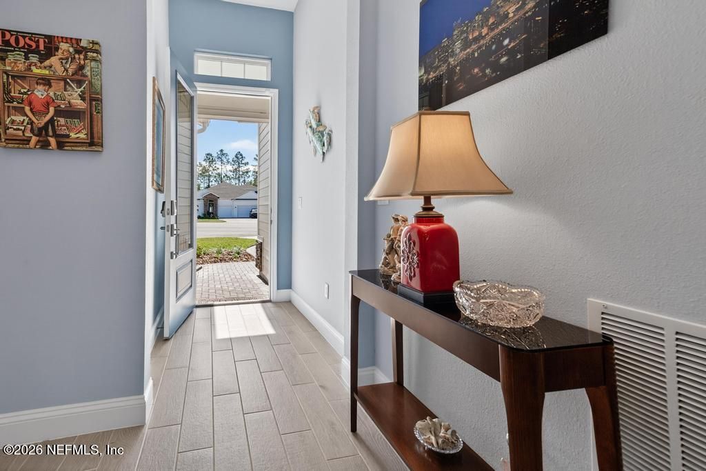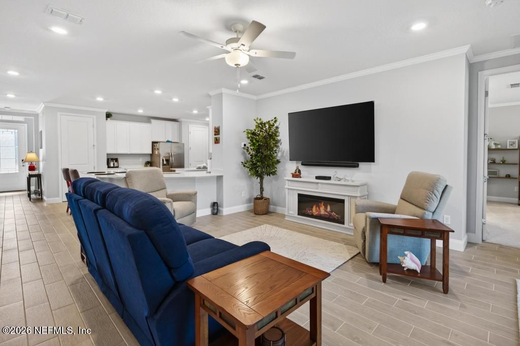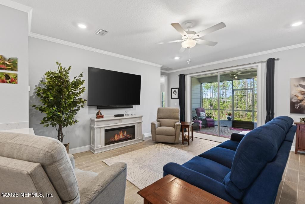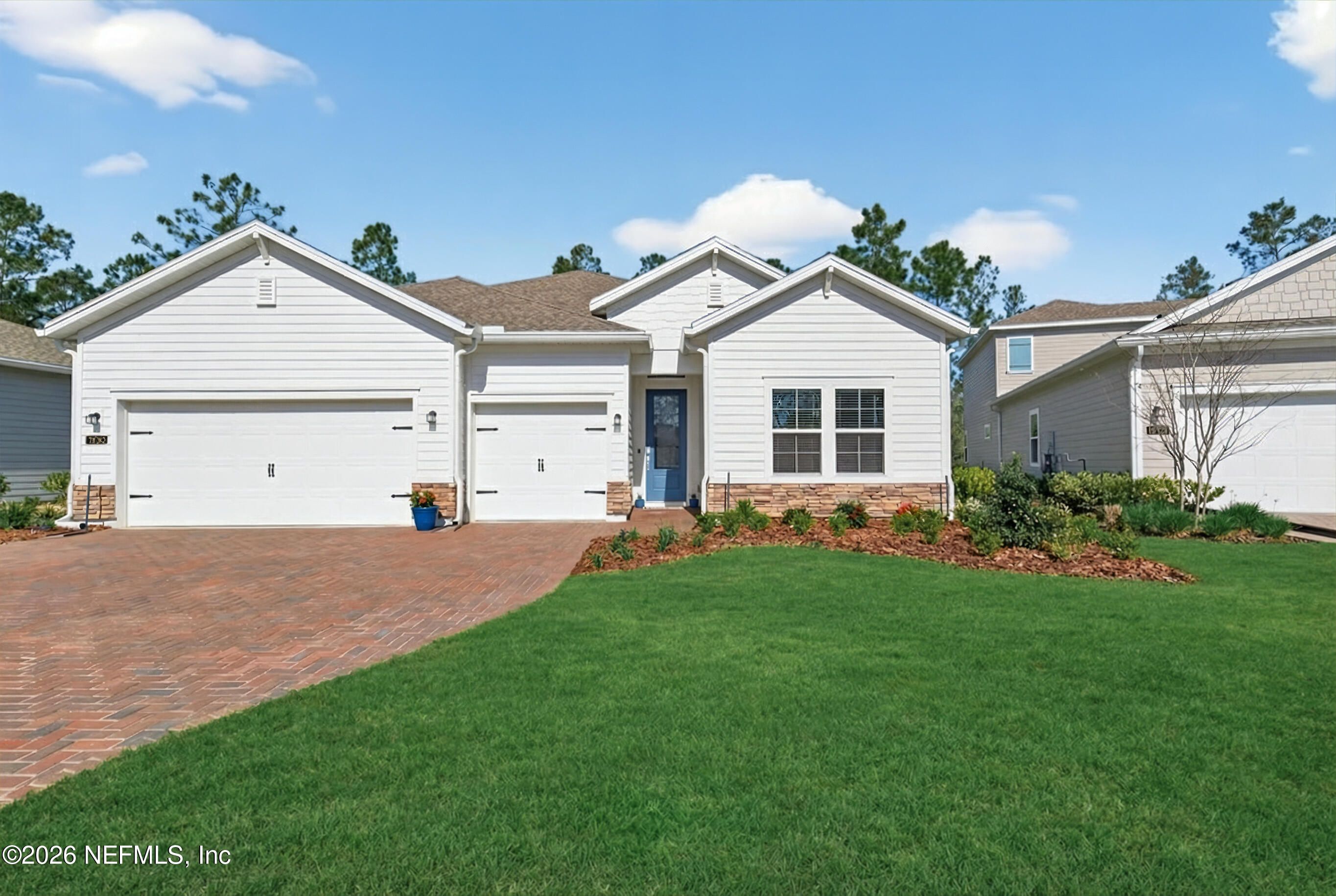 Beautifully maintained, like-new home in the Tributary Lakeside 55+ community featuring the popular Tivoli floor plan. This home offers 4 bedrooms, 3 full bathrooms, and an oversized 3-car garage with approximately 2,288 sq ft of living space. Spacious kitchen includes a large center island with bar seating, stainless steel appliances, single-basin sink, gas range, white cabinetry, quartz countertops, and breakfast nook. Open-concept layout with family room located just off the kitchen, ideal for entertaining. Split floor plan with three bedrooms and two full bathrooms on one side of the home. Primary suite features a large walk-in closet and en-suite bath with walk-in (California-style) shower, dual vanities, and ample storage. Oversized 3-car garage includes durable shark-coated floors. Located on a cul-de-sac with wooded views and shrubbery on both sides for added privacy. Screened lanai provides comfortable outdoor living space. Tributary Lakeside is a gated 55+ community offering a private clubhouse, heated pool, fitness center, pickleball courts, and billiards room. Residents also have access to Tributary's main amenities, including recreational areas, dog park, and playground. Conveniently located near Fernandina Beach, Jacksonville, and Jacksonville International Airport.