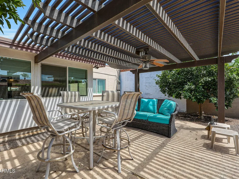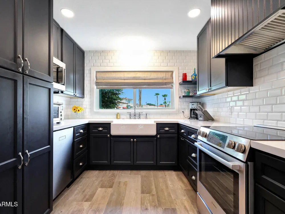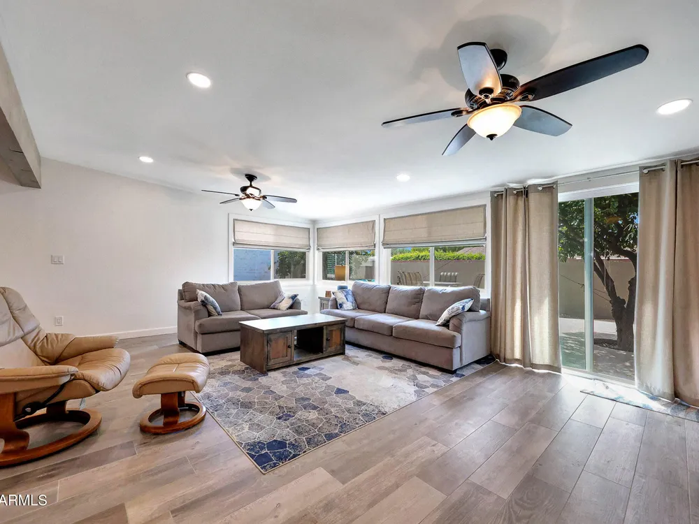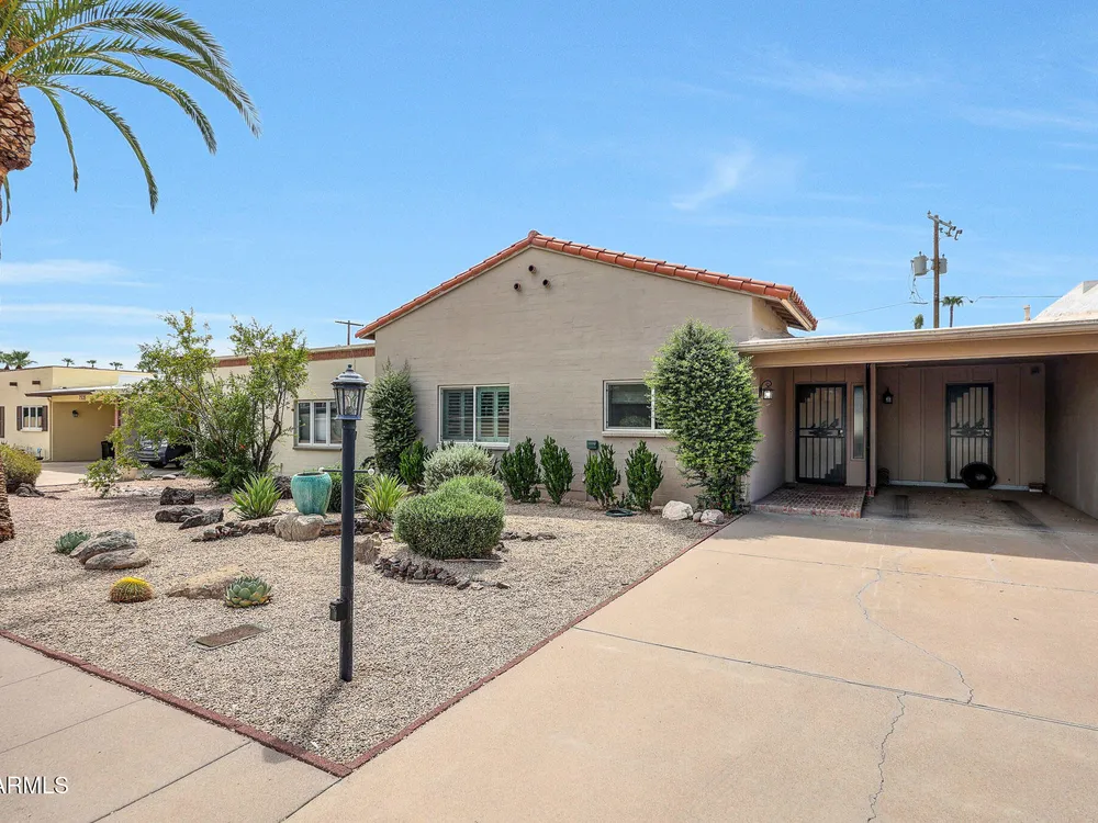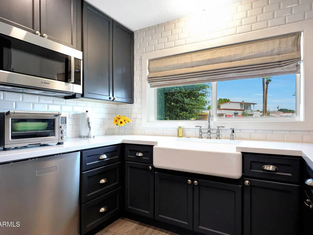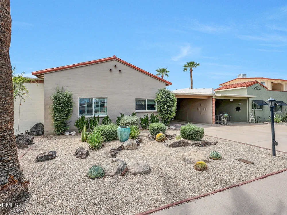 This extensively remodeled home in Villa Monterey is now offered for sale! Completely redone from the ground up by the current residents. The gorgeous kitchen features professionally designed cabinets with quartz counters, Farmhouse sink, backsplash and Bosch appliances! Great Room floor plan with attractive beams. You really need to see this house to appreciate it! Wait there is more! Newer dual pane windows, custom window treatments and sliding door to the spacious backyard complete with Ramada. Roof and AC new in 2022. Wood-look tile throughout with no carpet to be seen! All this in a wonderful 55+ community with low HOA fees of $920 PER YEAR. Close to everything like Scottsdale Fashion Square, Old Town Scottsdale and Chaparral Lake and Park. Close to the free trolly that takes you all around Scottsdale.