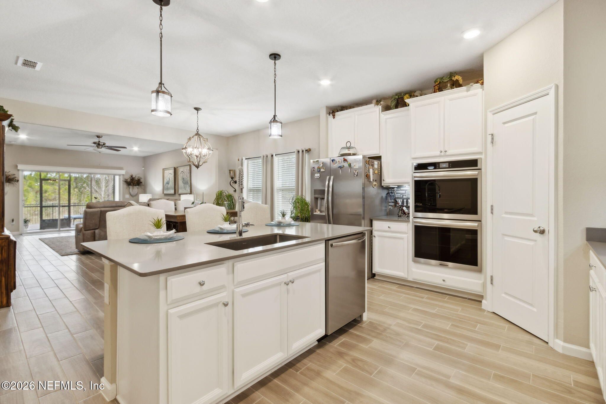 elcome to Lakeview at Tributary, a premier 55+ ACTIVE ADULT community where comfort, style, and lifestyle come together. Built in 2022, this beautifully appointed 2,126 sq ft home offers a thoughtfully designed floor plan with 3 BDRM, 2 BTH, plus OFFICE and additional DEN/FLEX space—perfect for hobbies, guests, or a home gym. Inside, you'll find WOOD-LOOK tile flooring throughout, custom shelving in the closets, upgraded light fixtures, and ABUNDANT storage including pantry shelving and extra cabinetry in the primary bathroom. The GOURMET KICHEN is a standout, featuring quartz countertops, NEW glass tile backsplash, gas cooktop, double oven, large SINGLE-BASIN sink, NEW dishwasher, and generous cabinet space—ideal for both everyday living and entertaining. The spacious laundry room includes BUILT-IN cabinets and a gas connection for a dryer. The garage is equally impressive with built-in shelving, durable SHARK garage flooring, and excellent organization. Step outside to enjoy a FULLY FENCED backyard that backs to a serene PRESERVE, offering privacy and peaceful views. Exterior highlights include GUTTERS, CURBED flower beds, PEA GRAVEL accents, and BRICK pavers on both the SCREENED LANAI and PATIOperfect for relaxing or entertaining outdoors. The home also abuts a pocket park, providing only one direct neighbor, and is conveniently located close to the community amenity center. Residents of Lakeview at Tributary enjoy access to a resort-style amenity center featuring a pool, fitness center, pickleball and bocce courts, walking trails, a dog park, and a dock. This is more than just a homeit's a lifestyle designed for active adults seeking quality, convenience, and community.
