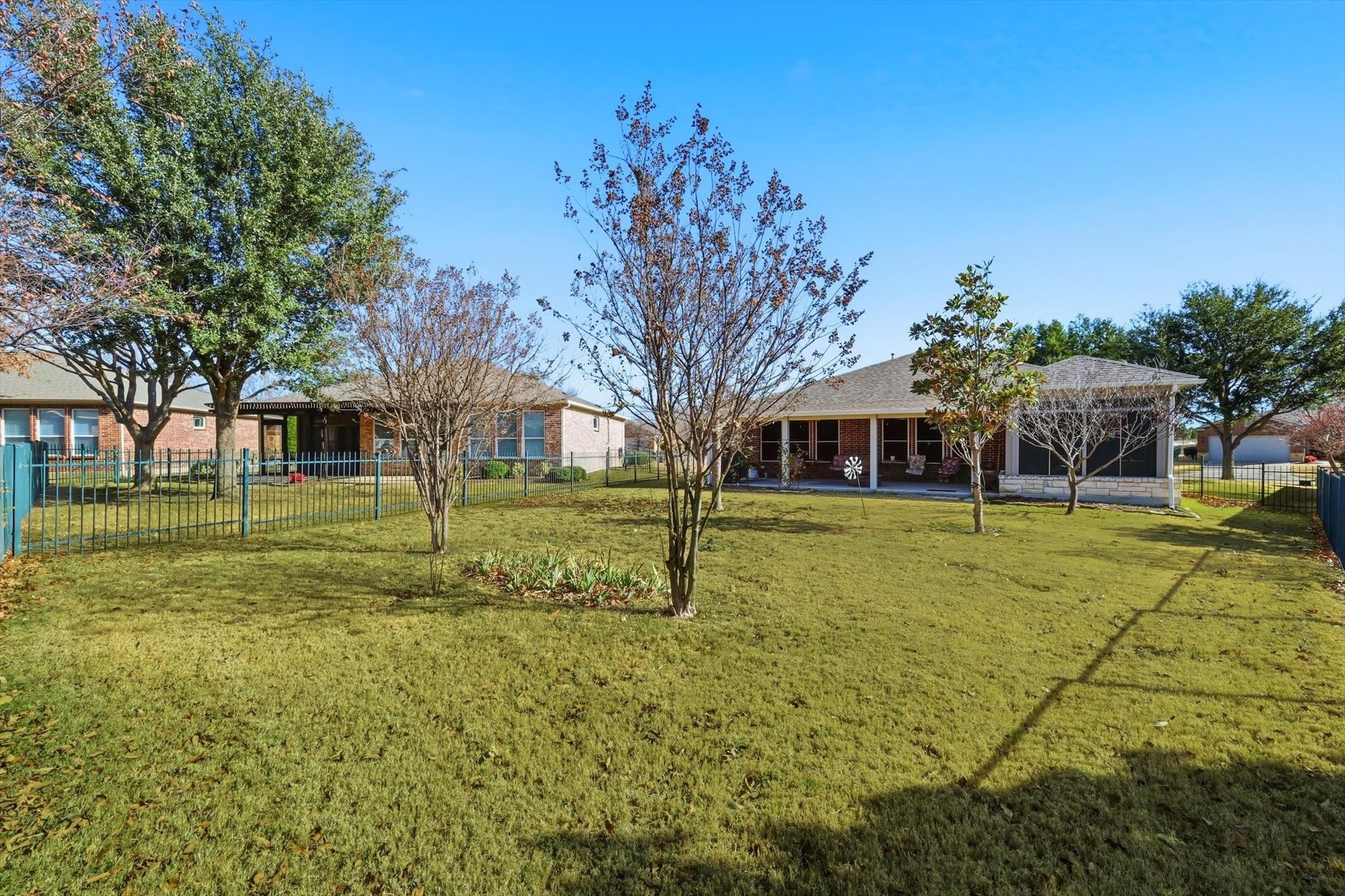 Impressive Pickett Floor Plan in the sought after 55+ community of Frisco Lakes. This open concept floor plan offers a great space for family gatherings. Gourmet kitchen with stainless steel appliances, expansive breakfast bar, beautiful granite counter and gas range makes cooking a dream. Pull out drawers in lower kitchen cabinets is a plus. Glassed in sunroom offers a wonderful view of extremely large fenced back yard with many trees for shade. Extended Patio is great for outdoor entertaining. Private Primary Suite has a wall of windows and an ensuite bathroom with garden tub and walk in shower. Guest Bedroom and Bathroom are located at front of home for privacy along with a Private Office. Large Utility Room has a sink, and extra cabinet space and storage closet. Home also has an oversized garage. Frisco Lakes has an 18 hole Championship golf course, 3 clubhouses with 3 fitness centers, indoor and outdoor pools and spas, pickleball, tennis courts, bocce ball courts, walking trails and many clubs.