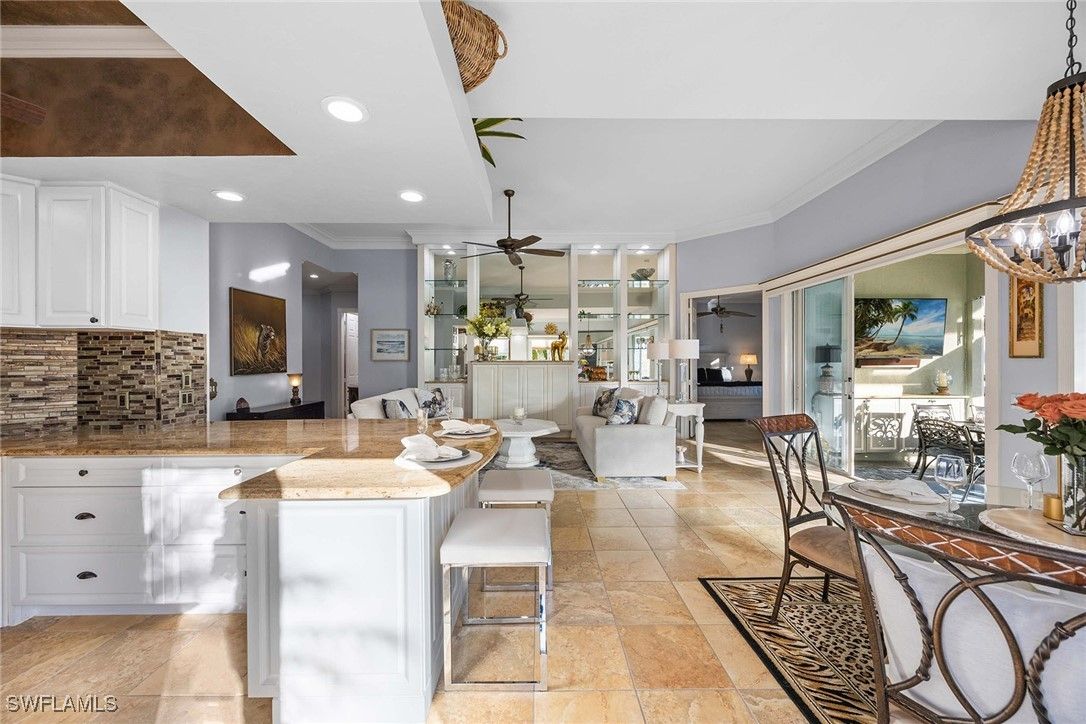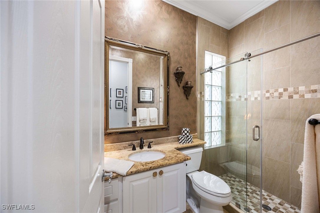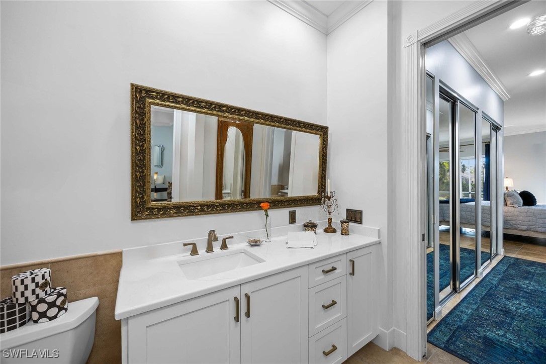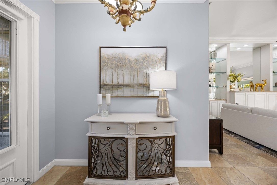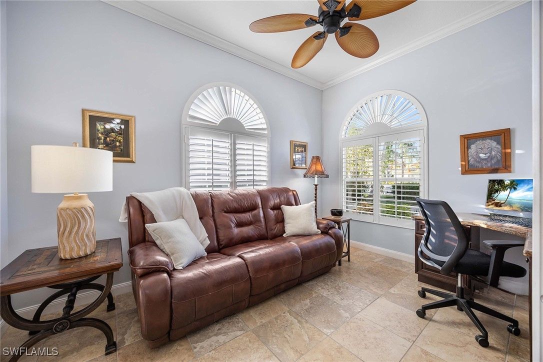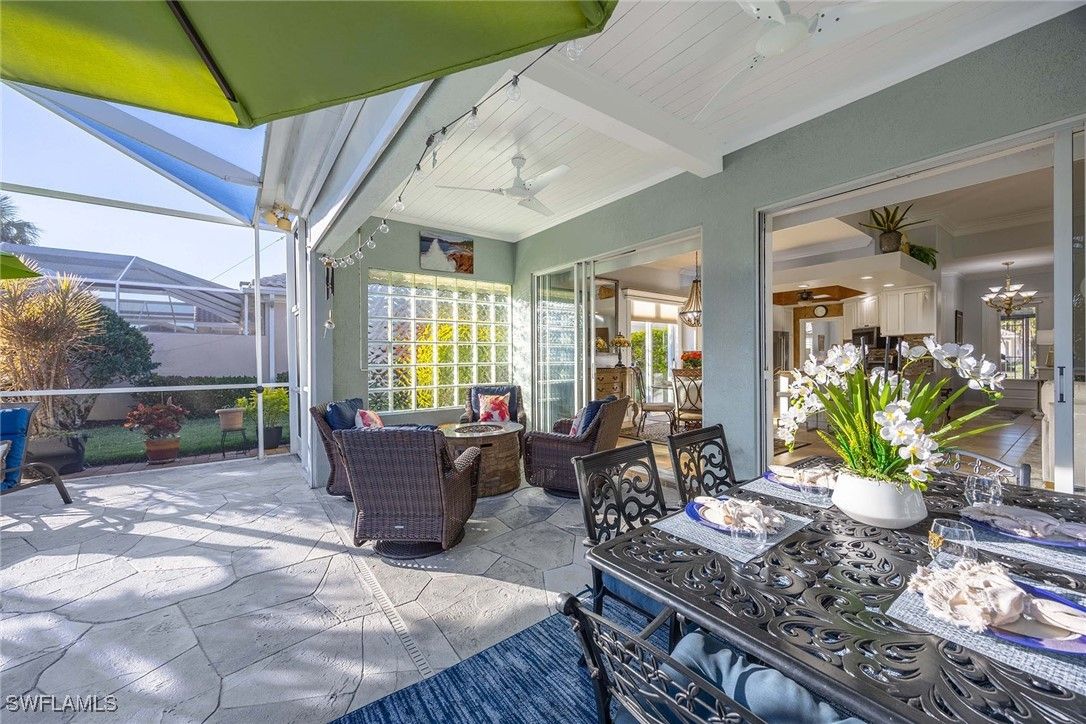 Welcome to this brilliantly modified Oakmont floor plan in the gated community of Verona Walk in Naples. Set on an oversized lot with sunny southern exposure, this residence features a custom expansion to include three full baths, an uncommon layout in this model. Designed for low-maintenance living, it offers solid poured concrete construction by DiVosta Homes and a lifestyle-rich setting just moments from world-class beaches, dining and shopping in Naples and Marco Island. The interior is freshly painted in coastal tones and showcases all porcelain tile flooring throughout. A fully remodeled kitchen features white cabinetry with pot drawers and stone countertops, while all baths have been upgraded with matching cabinetry and stone tops. The spacious lanai includes a saltwater pool with a low-maintenance keystone-finished deck, upgraded no-see-um screen enclosure, built-in cabinetry with big screen television and a custom tongue-in-groove ceiling. A hot tub sits just outside the primary suite for added relaxation. Additional upgrades include electric roll-down screens on the doors, accordion shutters on the lanai, a newer HVAC system (4.5 years old) and a water heater installed two years ago. Plantation shutters add elegance throughout the home, while built-in closet systems in all bedrooms provide practical luxury. An upgraded front-load washer and dryer add everyday convenience. Outdoor enhancements include a recent exterior repaint in a fresh coastal color palette, an attractive side-load garage elevation, expanded driveway, brick paver extension wrapping around the front, side and back of home, and a dedicated grilling patio just off the kitchen. Enjoy access to Verona Walk’s 20,000-square-foot Town Center, offering tennis and pickleball courts, resort-style and lap pools, a 24-hour fitness center, and nearly 20 miles of recreational paths connected by Venetian-style bridges. The community also features a 24-hour staffed gatehouse for the convenience of residents and guests.