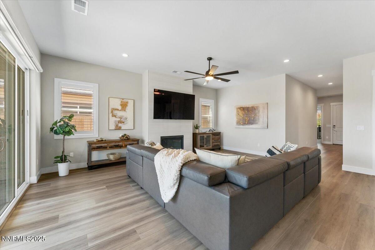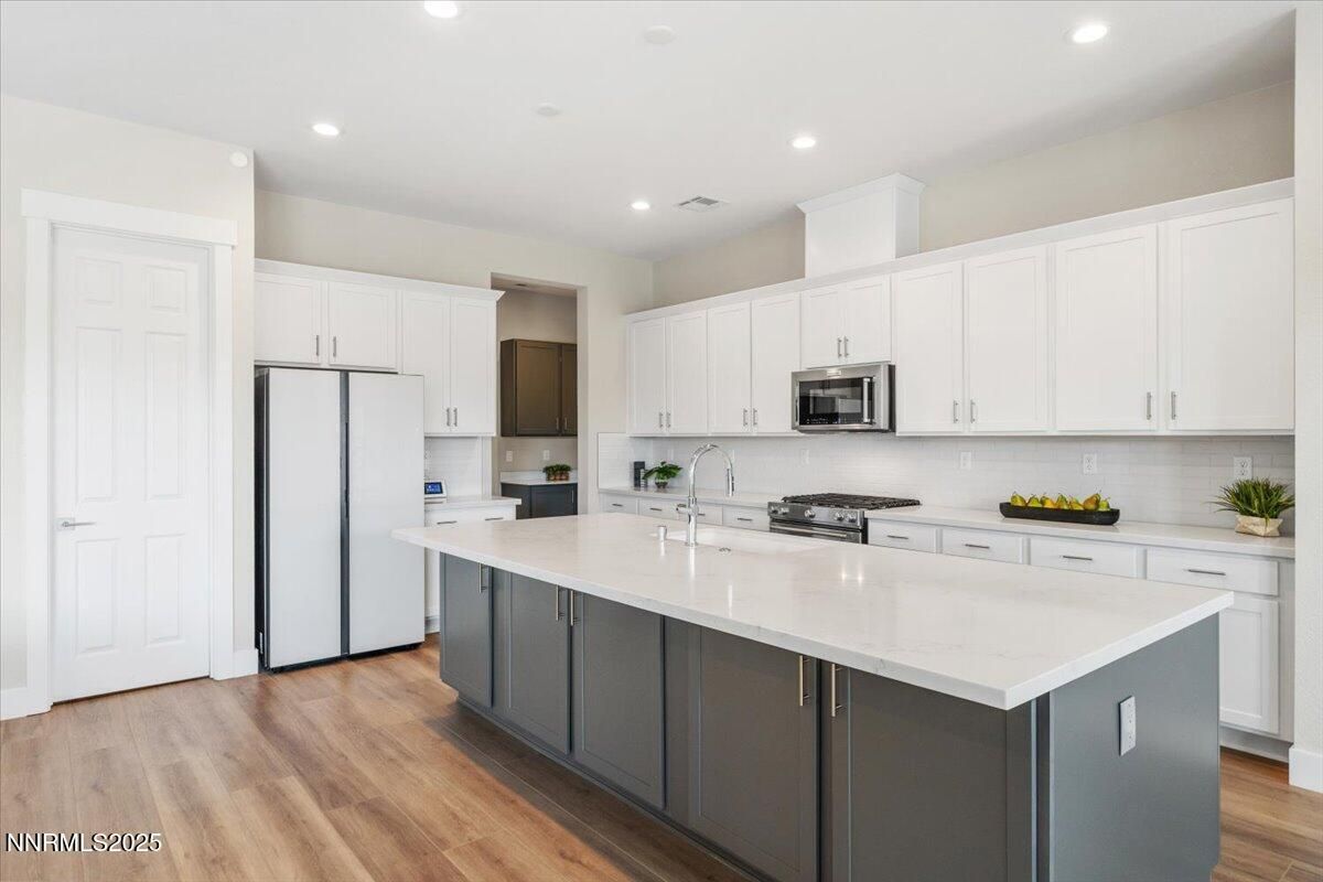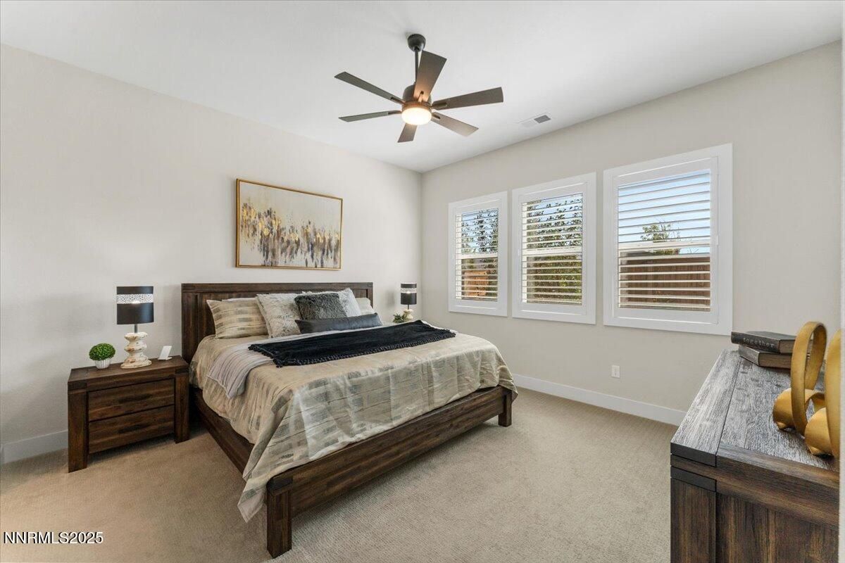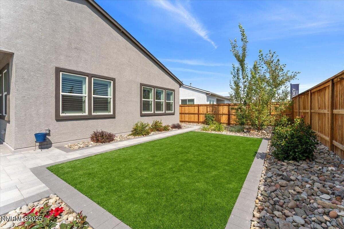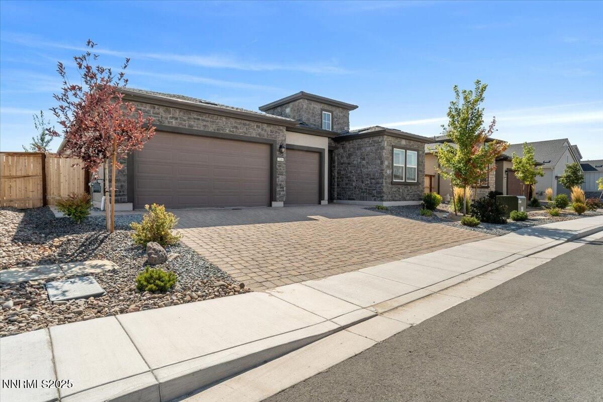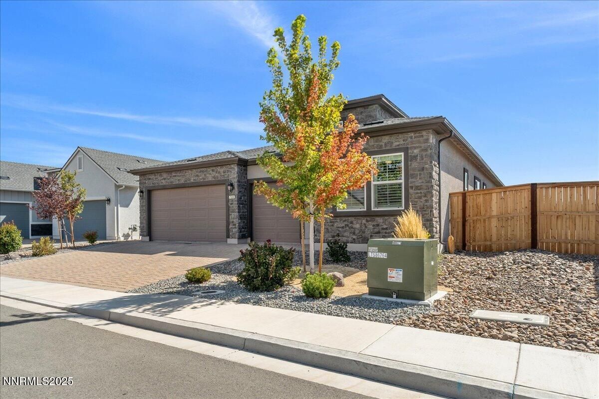 Skip the wait for new construction, avoid the time, hassle and added expense of landscaping the backyard, coordinating purchase and installation of window treatments, purchasing interior lighting fixtures, ceiling fans, security system and hiring an electrician to install. 7536 Evans Bridge is ready for you to move in and enjoy! This home is the best value out there at 310.85 per sq foot and includes extensive developer upgrades and also features additional 60K of Seller after-market upgrades (39K in professional landscaping, 11K in plantation shutters and motorized blinds, 3K for Bespoke kitchen refrigerator, 3K for ADT Security System and 4K for ceiling fans and interior light fixtures). Contemplate the appeal and functionality of the straight-drive 3-car garage design vs. tandem and 90-degree turn 3-car garage options of other listings. This Pierce floor plan combines luxury, convenience and a vibrant lifestyle. Located in Regency at Stonebrook, 55+ community in Spanish Springs. Must see, rare three bedrooms, two and a half bathrooms, with est. 2,120sf living space and three-car garage. This home offers 10-foot ceilings and luxury vinyl plank flooring throughout, creating a spacious and modern atmosphere. Bedrooms enhanced with upgraded carpet and padding, while the bathrooms feature elegant ceramic tile. Dual-pane, low-e-vinyl windows installed for energy efficiency, and an extended patio door in the great room allows for an abundance of natural light. The stylish chef-inspired kitchen designed for both functionality and entertaining features a large center island and an adjacent casual dining area for effortless gatherings. Designer cabinets with soft-closing drawers provide ample storage, complemented by a walk-in pantry. Kitchen equipped with premium KitchenAid stainless steel appliances and includes a newer Bespoke side-by-side refrigerator. The open concept layout seamlessly connects the kitchen, dining, and living areas, making it ideal for entertaining. The great room features a floor to ceiling tile gas fireplace. Over 60,000 in seller upgrades. Both front and rear landscaping are complete, and plantation shutters installed throughout for privacy and style. The great room's extended patio door includes motorized blinds. Contemporary light fixtures brighten bathroom vanities, and ceiling fans with integrated lighting are present in the bedrooms and great room. Primary suite features dual sinks, walk-in closet and spa-like walk-in shower. Spacious separate laundry room with cabinets and laundry sink. Seller purchased ADT security system included in sale. Exterior equipped with gutters, hose bibs, and BBQ gas stub for easy outdoor gatherings. Resort-style amenities include six pickleball courts, two bocce courts, state of the art clubhouse, fitness center, indoor salt water pool, community amphitheater, trail system and so much more. HOA maintains front yard and common areas.