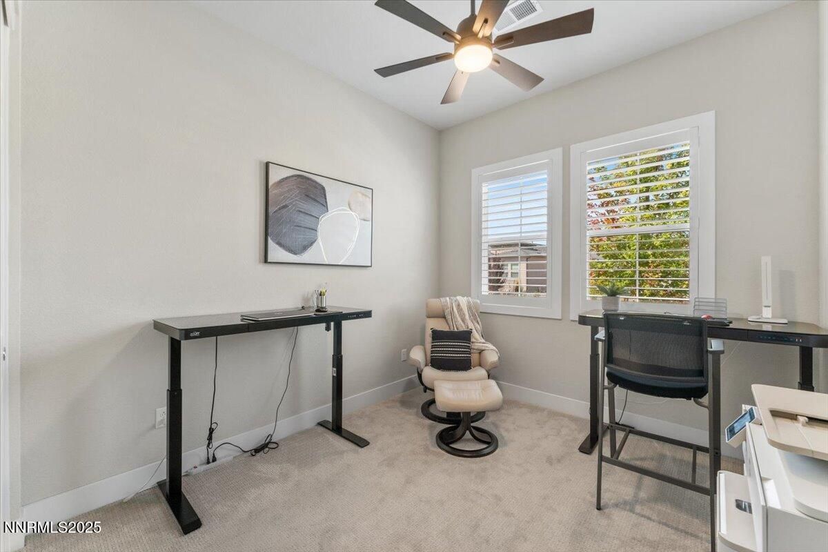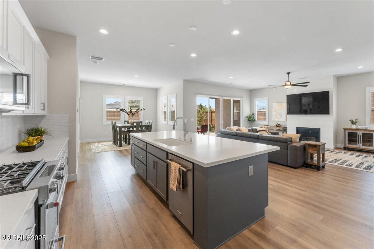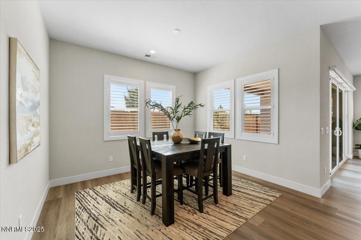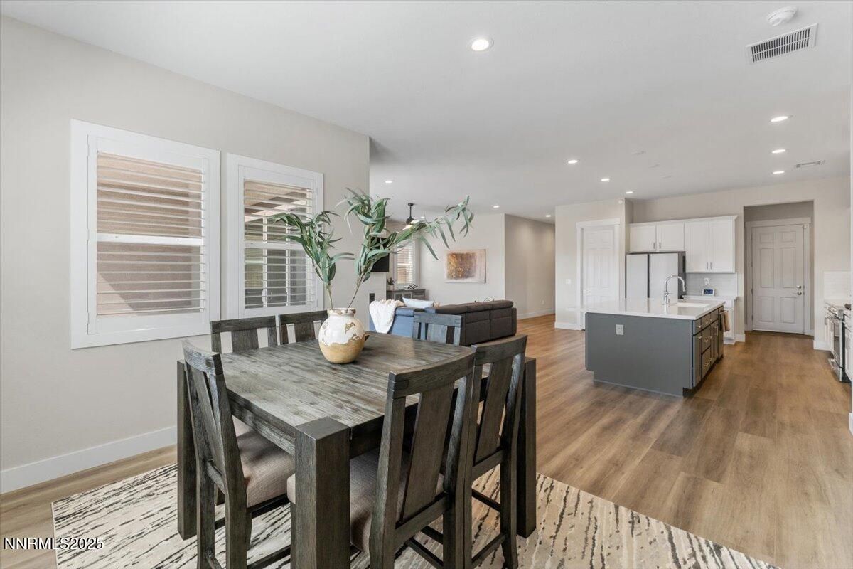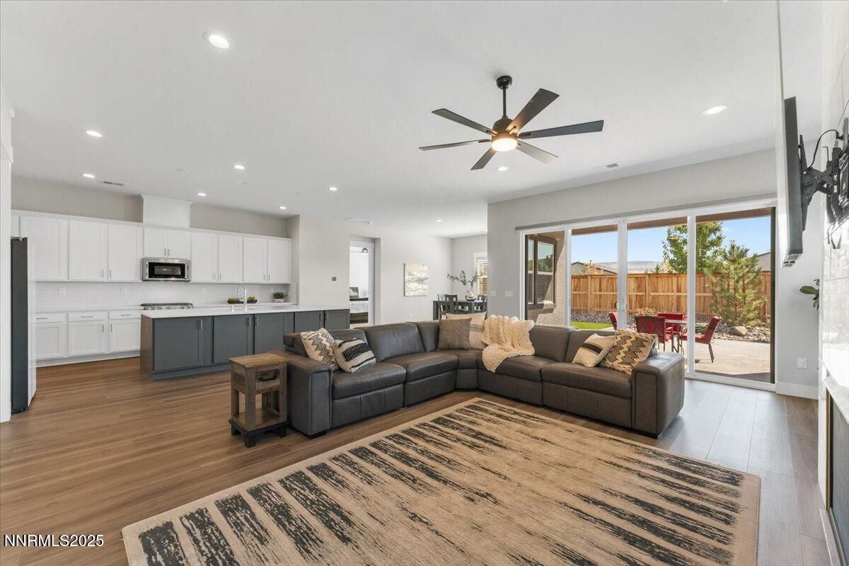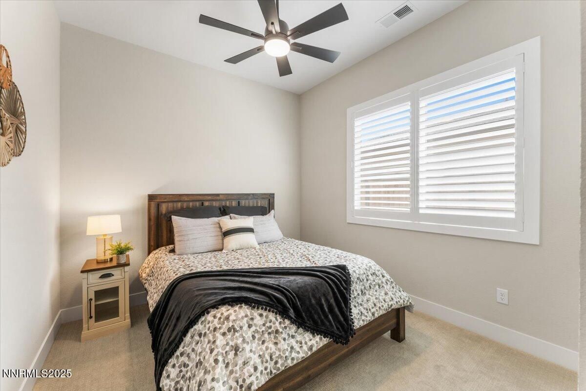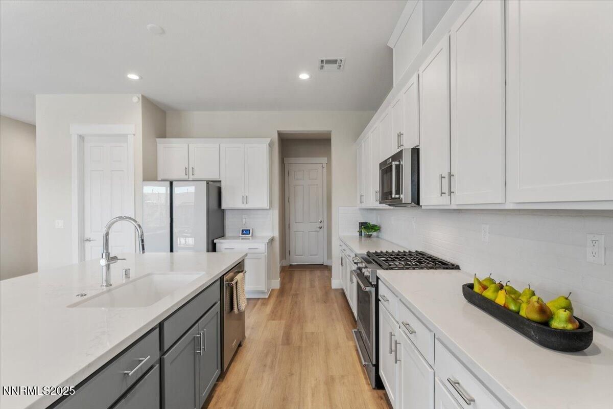 Skip the wait for new construction, avoid the time, hassle and added expense of landscaping the backyard, coordinating purchase and installation of window treatments, purchasing interior lighting fixtures, ceiling fans, security system and hiring an electrician to install. 7536 Evans Bridge is ready for you to move in and enjoy! This home is the best value out there at 310.85 per sq foot and includes extensive developer upgrades and also features additional 60K of Seller after-market upgrades (39K in professional landscaping, 11K in plantation shutters and motorized blinds, 3K for Bespoke kitchen refrigerator, 3K for ADT Security System and 4K for ceiling fans and interior light fixtures). Contemplate the appeal and functionality of the straight-drive 3-car garage design vs. tandem and 90-degree turn 3-car garage options of other listings. This Pierce floor plan combines luxury, convenience and a vibrant lifestyle. Located in Regency at Stonebrook, 55+ community in Spanish Springs. Must see, rare three bedrooms, two and a half bathrooms, with est. 2,120sf living space and three-car garage. This home offers 10-foot ceilings and luxury vinyl plank flooring throughout, creating a spacious and modern atmosphere. Bedrooms enhanced with upgraded carpet and padding, while the bathrooms feature elegant ceramic tile. Dual-pane, low-e-vinyl windows installed for energy efficiency, and an extended patio door in the great room allows for an abundance of natural light. The stylish chef-inspired kitchen designed for both functionality and entertaining features a large center island and an adjacent casual dining area for effortless gatherings. Designer cabinets with soft-closing drawers provide ample storage, complemented by a walk-in pantry. Kitchen equipped with premium KitchenAid stainless steel appliances and includes a newer Bespoke side-by-side refrigerator. The open concept layout seamlessly connects the kitchen, dining, and living areas, making it ideal for entertaining. The great room features a floor to ceiling tile gas fireplace. Over 60,000 in seller upgrades. Both front and rear landscaping are complete, and plantation shutters installed throughout for privacy and style. The great room's extended patio door includes motorized blinds. Contemporary light fixtures brighten bathroom vanities, and ceiling fans with integrated lighting are present in the bedrooms and great room. Primary suite features dual sinks, walk-in closet and spa-like walk-in shower. Spacious separate laundry room with cabinets and laundry sink. Seller purchased ADT security system included in sale. Exterior equipped with gutters, hose bibs, and BBQ gas stub for easy outdoor gatherings. Resort-style amenities include six pickleball courts, two bocce courts, state of the art clubhouse, fitness center, indoor salt water pool, community amphitheater, trail system and so much more. HOA maintains front yard and common areas.