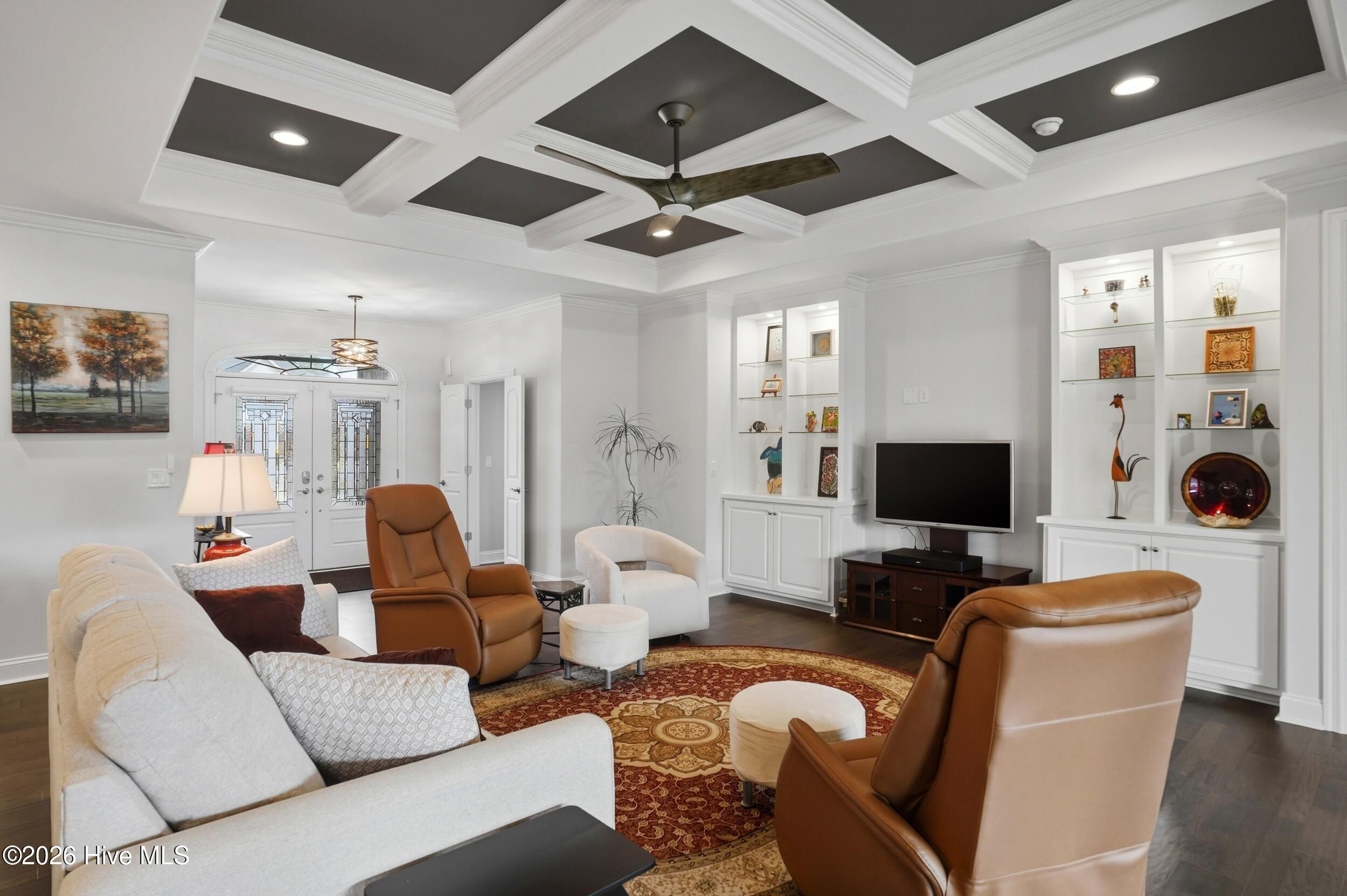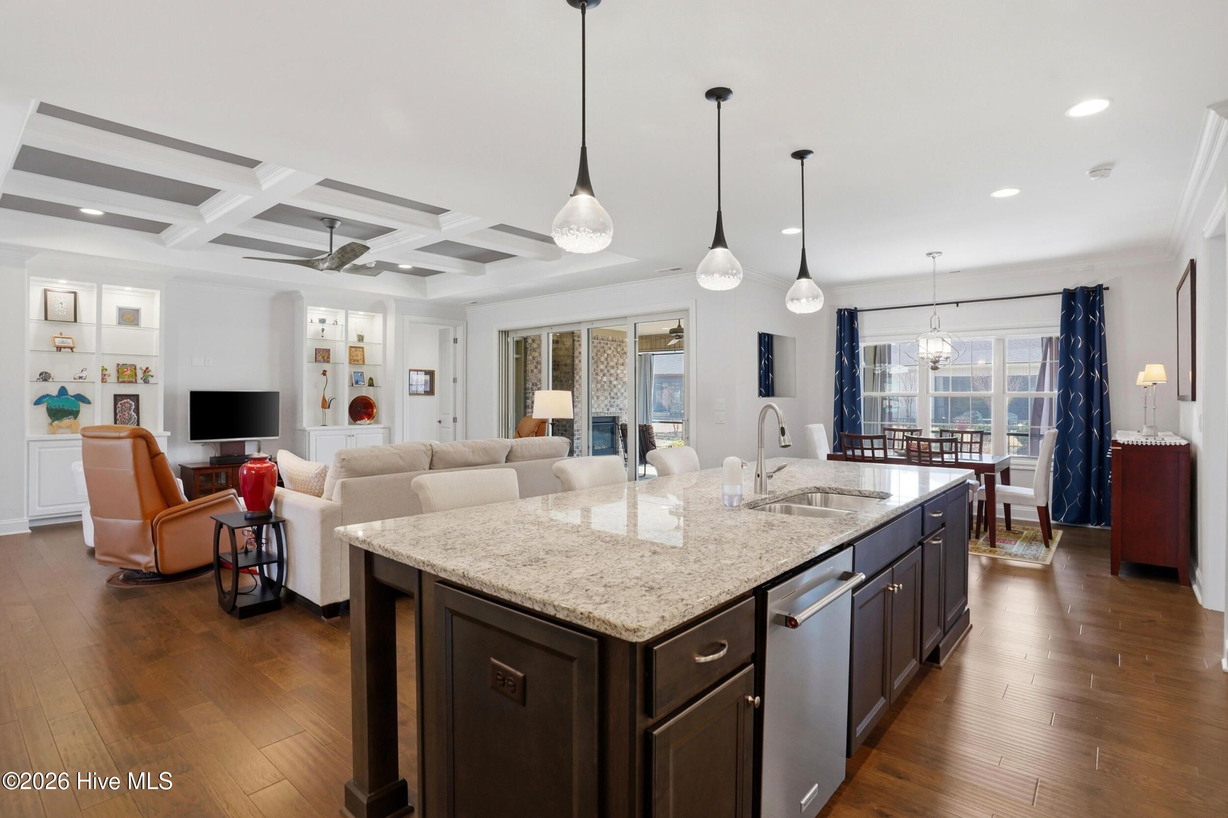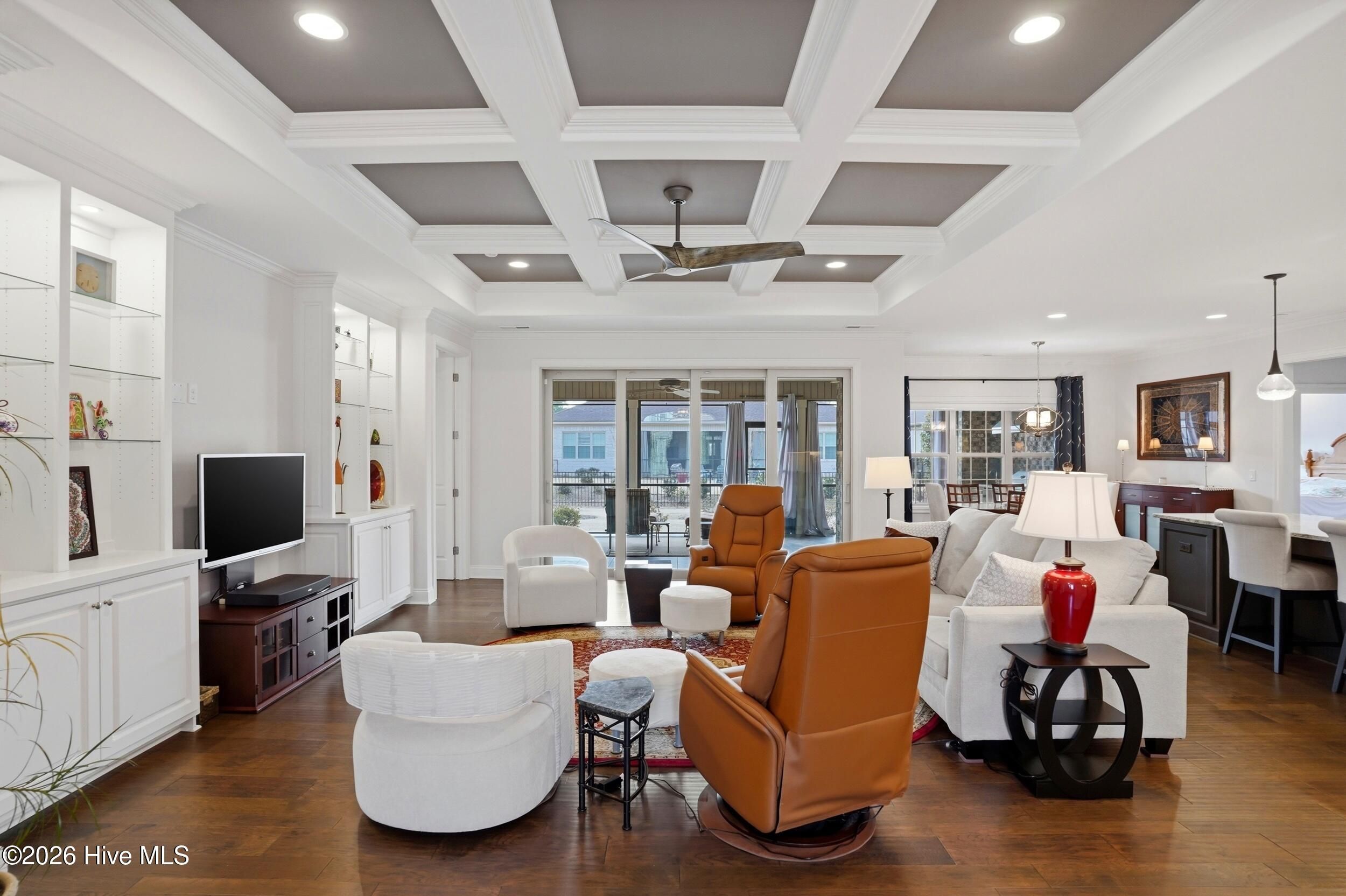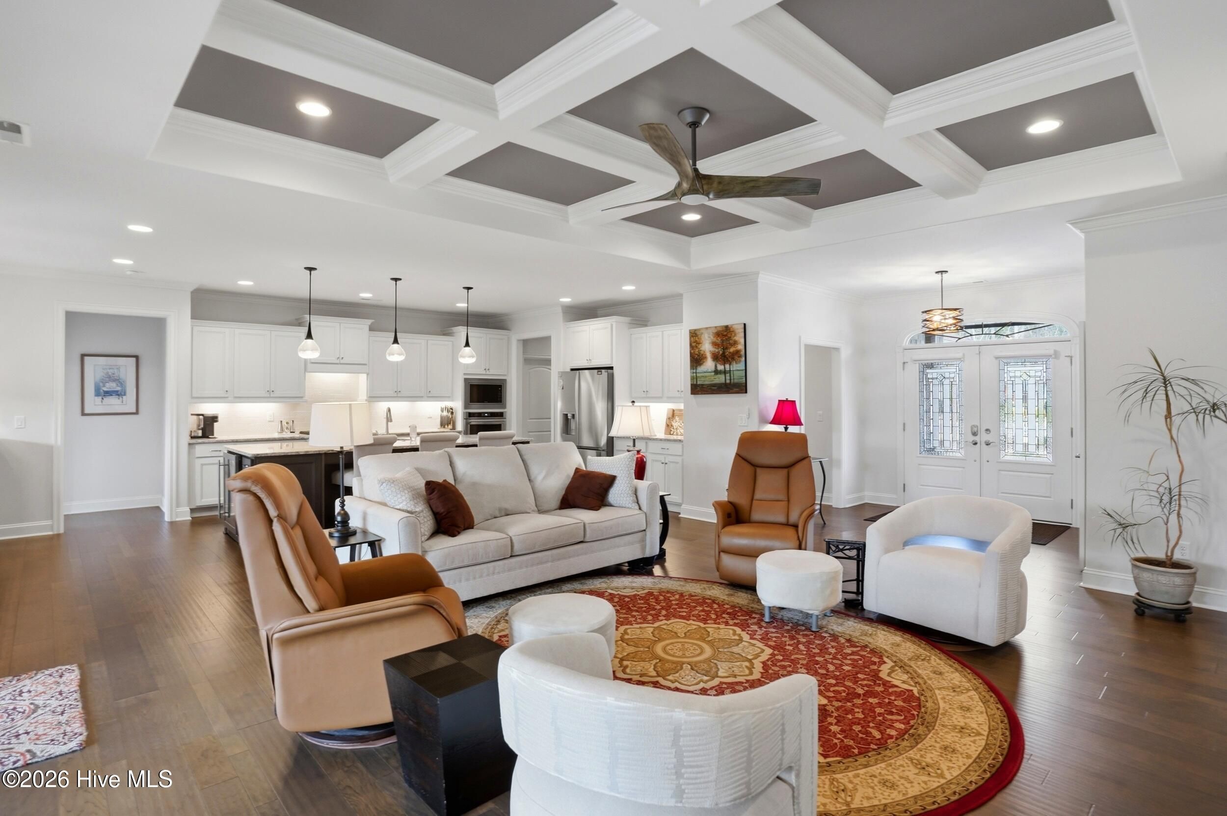 Welcome to this beautiful 2,483 sq ft home in the gated waterfront community of River Bluffs. Featuring the highly sought-after Pine Island floor plan, this thoughtfully designed home offers an open-concept layout ideal for both everyday living and entertaining. The spacious living area is highlighted by elegant coffered ceilings, abundant natural light, and seamless flow into the well-appointed kitchen complete with ample cabinetry and a large center island. Step outside to relax on the screened porch overlooking the beautifully landscaped yard--perfect for enjoying peaceful coastal evenings. This home also features a rare 3-car garage, offering plenty of space for vehicles, storage, or hobbies. Residents of River Bluffs enjoy exceptional resort-style and water-oriented amenities, including a marina, boat dock, and access to a scenic waterfront community. Additional neighborhood amenities include a clubhouse, community pool, community garden, dog park, fitness center, and miles of scenic walking and jogging trails. Ideally located just minutes from Wilmington's shopping, dining, and coastal attractions, this home offers the perfect blend of luxury, comfort, and coastal lifestyle living.