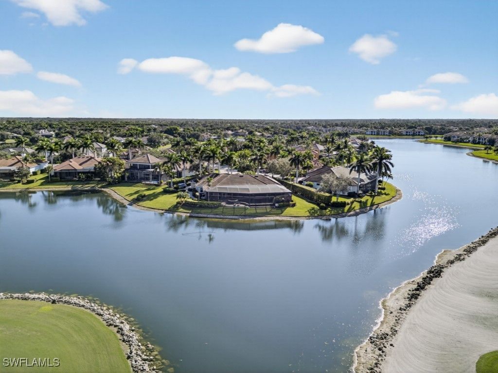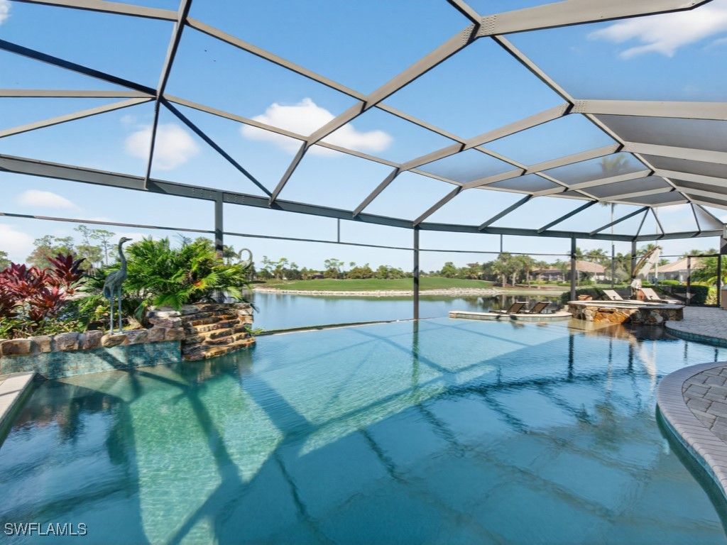 Experience one of the finest views in The Classics. Perched at the end of a quiet cul-de-sac on nearly a ½-acre homesite, this extraordinary residence showcases more than 230 feet of lake frontage overlooking the renowned Classics golf course—framed perfectly by an extra-large 45-foot infinity-edge pool. Step through the front door into a grand foyer that opens to an elegant living room with 14-foot decorative ceilings, a custom built-in entertainment center, and 15 feet of disappearing hurricane-rated sliders that capture the breathtaking panorama. A formal dining room with tall coffered ceilings and large picture windows complements the home’s spacious design. The chef’s kitchen is sure to impress with a double oven, walk-in pantry, soft-close drawers, pull-out shelving, and a generous center island. An adjacent breakfast area enjoys wide-open views of the lake and fairway. Working from home is a pleasure in the sizable office/den, complete with built-in shelving, a desk, and two closets. The serene primary suite features a tinted bay window overlooking the pool, lake, and golf course, along with direct access to the spa for evening dips. Additional highlights include two walk-in closets—one with a dedicated shoe closet—and a luxurious bath with dual vanities, a soaking tub, and an oversized shower with dual controls and five showerheads. Each guest bedroom enjoys its own private bath, offering comfort and privacy for family and visitors. The air-conditioned 3-car garage includes two enclosed storage closets and a workbench, while a whole-house generator provides peace of mind. One of the rare residences in The Classics where Players Club membership is optional, this home offers exceptional flexibility—just minutes from Naples’ famed 5th Avenue and its world-class beaches.