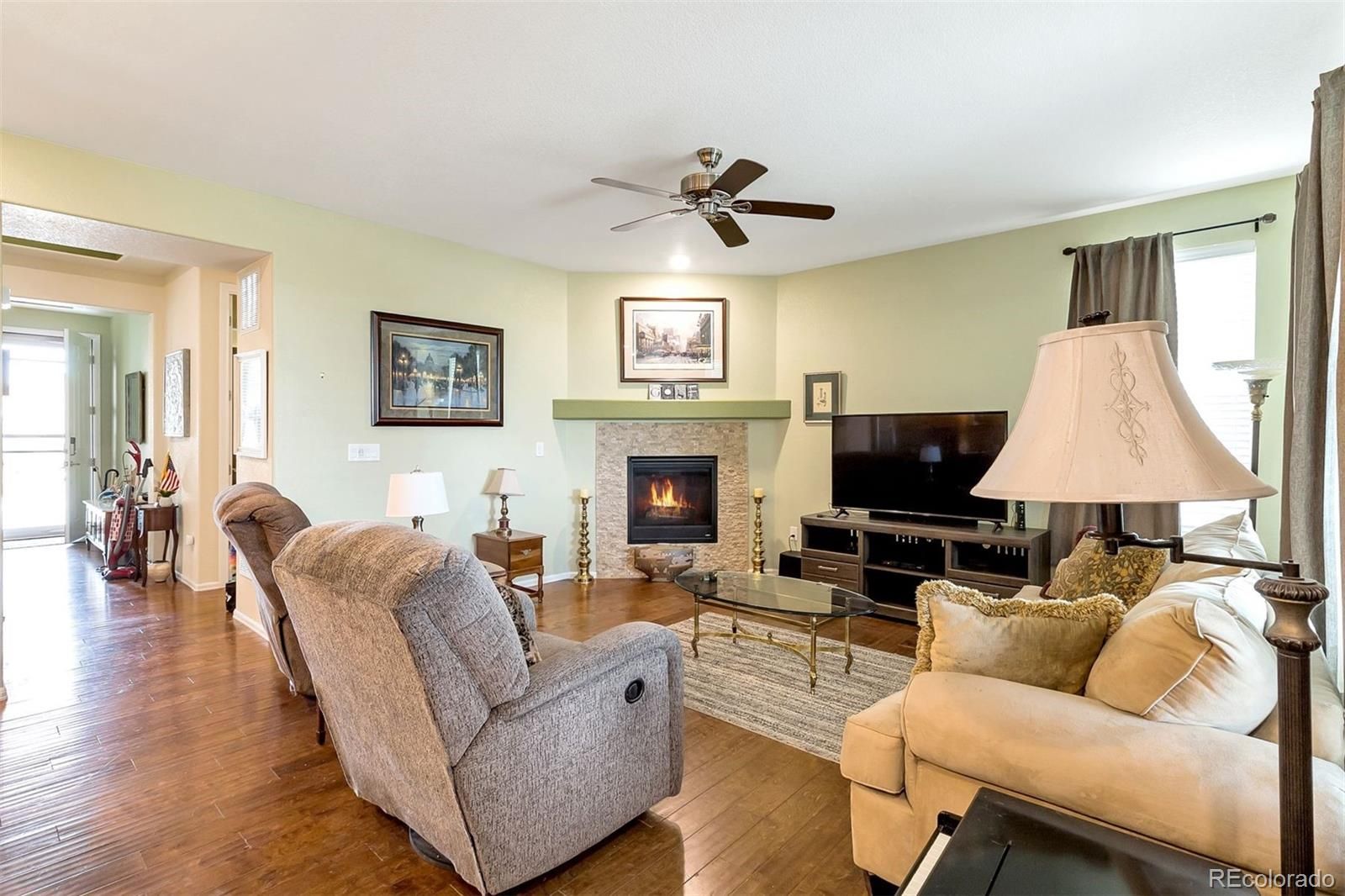 Relax and enjoy breathtaking mountain views and beautiful morning sunrises from your back patio in this sought-after 55+ Todd Creek Golf Course community. This upgraded home features a spacious, open floor plan with elegant cherry cabinets, granite countertops, stainless steel appliances, and double ovens in the kitchen. The large center island is perfect for entertaining, while the dining area easily accommodates family gatherings. All appliances are included! The open living room features a cozy gas fireplace, creating a warm and inviting space to relax. The primary suite includes a dual vanity, walk-in shower, and large walk-in closet. A second bedroom and full bath offer comfort for guests or additional living space. An oversized two-car garage provides extra room for your future golf cart or storage. The association maintains the exterior—including the roof, paint, landscaping, and snow removal—so you can truly enjoy a low-maintenance lifestyle. You’re just steps away from the clubhouse, where you can dine with friends, swim, work out in the fitness center, or enjoy a round of golf. One buyer must be 55+. Motivated seller—move in and start living the relaxed Todd Creek lifestyle today!