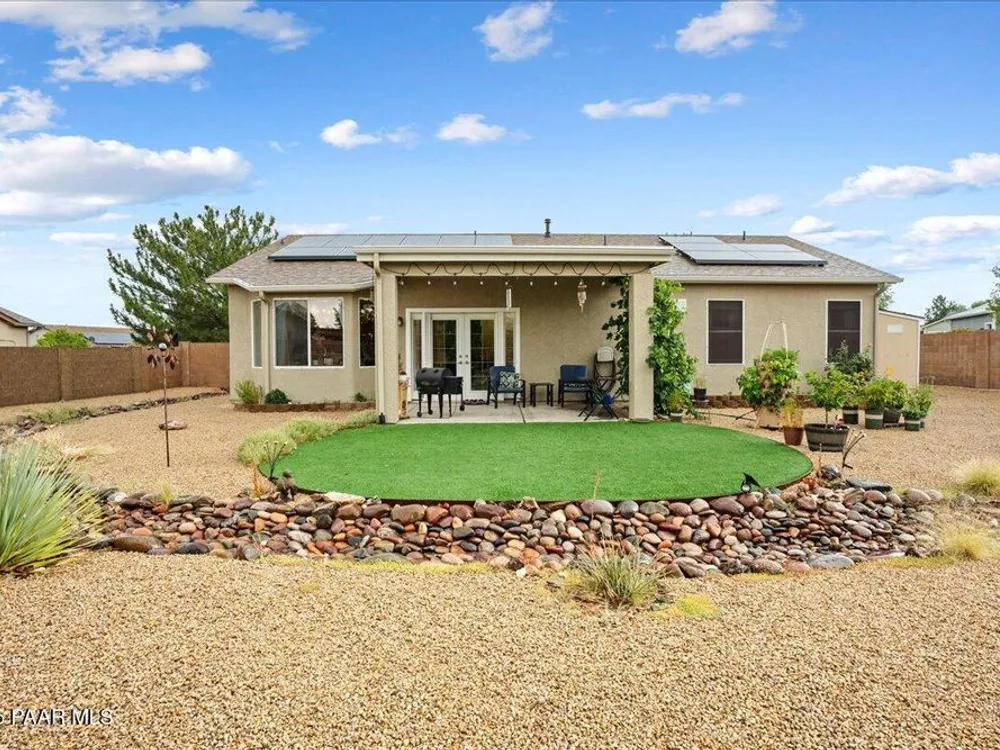 Tucked on a quiet street of newer homes, this immaculate move in ready 3BR/2BA single-level residence offers level entry and wheelchair accessibility in a desirable site-built-only community. Enjoy a clubhouse, pool, sidewalks, and proximity to top restaurants. Inside, find quartz counters with warm copper tones, custom tile backsplash, newer stainless appliances, and an eat-at bar. New wood flooring, newer bedroom carpet, and tile in dining/kitchen enhance the space. French doors open to a shaded covered patio with a new roof and oversized privacy-fenced yard with low-maintenance landscaping. Features include a walk-in jetted tub, new HVAC and 2-car garage and leased solar that reduced the hot July bill to just $13! Don't miss this one!