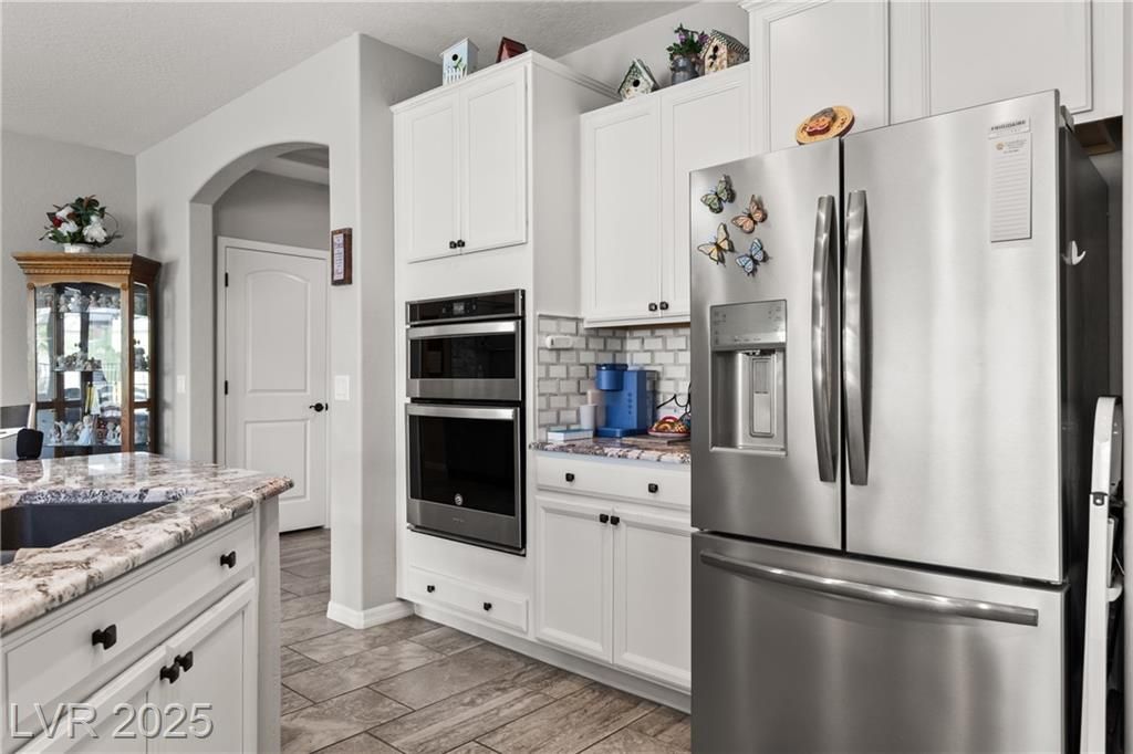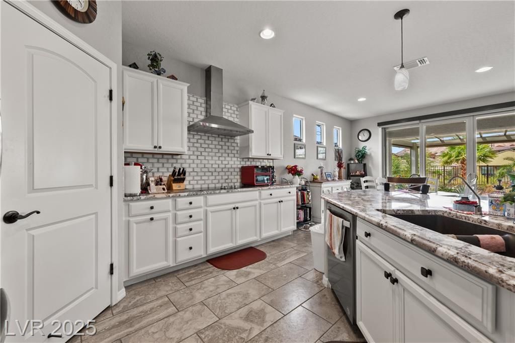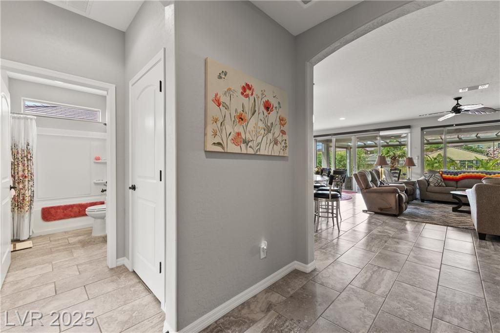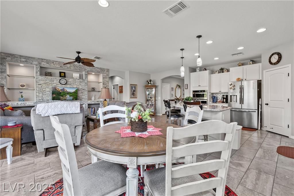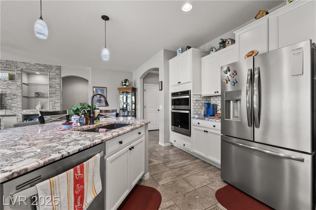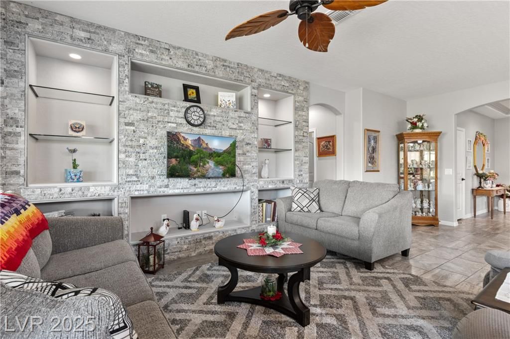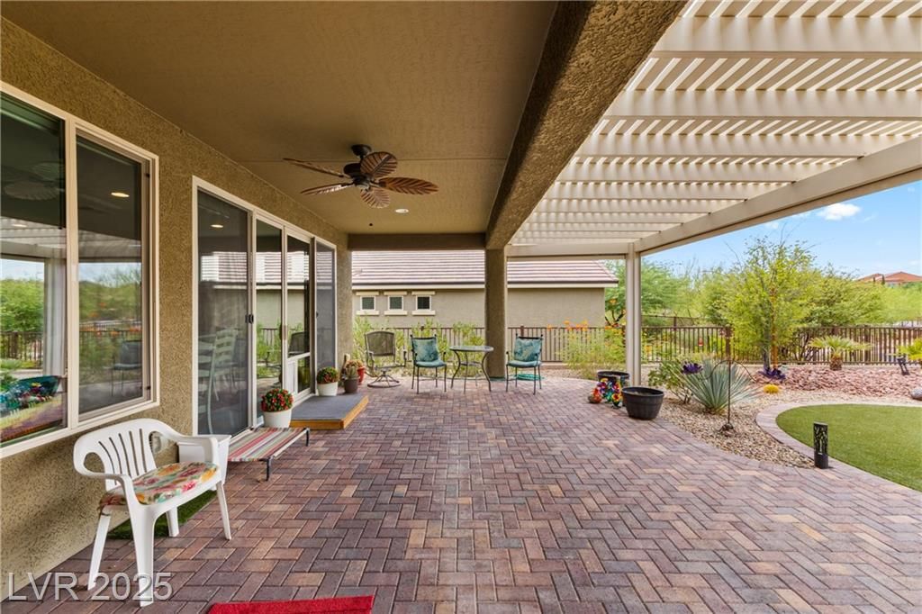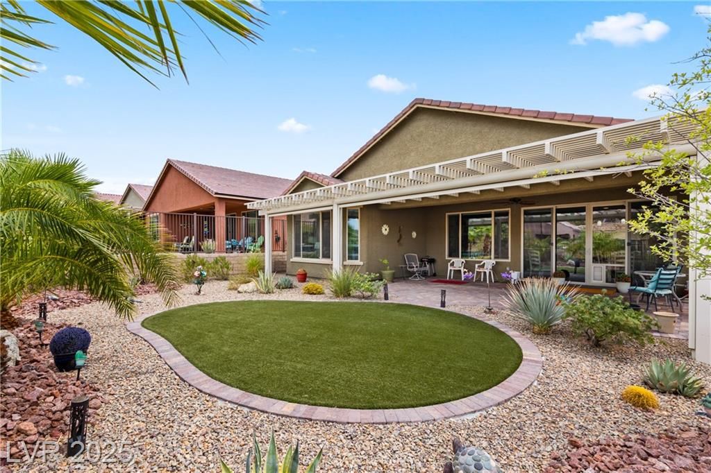 A paver driveway leads you to the fully fenced property, with synthetic grass in both the front and backyard for easy maintenance. The backyard is perfect for entertaining, featuring a paver patio with an extended pergola covering. Inside, tile floors flow throughout the main living areas, with soft carpet in the bedrooms. The living room's entertainment wall is a showpiece, adorned with a stone face and elegant glass shelving. The kitchen is a chef's dream, showcasing bright white cabinetry with stainless hardware, granite countertops , stainless steel appliances-including a cooktop with a sleek vent hood-and a gorgeous island with pendant lighting.This home blends low-maintenance living with high-end finishes, all within a vibrant 55+ community. Sun City Amenities include access to the Pioneer Center, complete with 18 hole putting course, sports courts, fitness center with walking track and indoor and outdoor pools and hot tubs. Golf course privileges are also included for residents