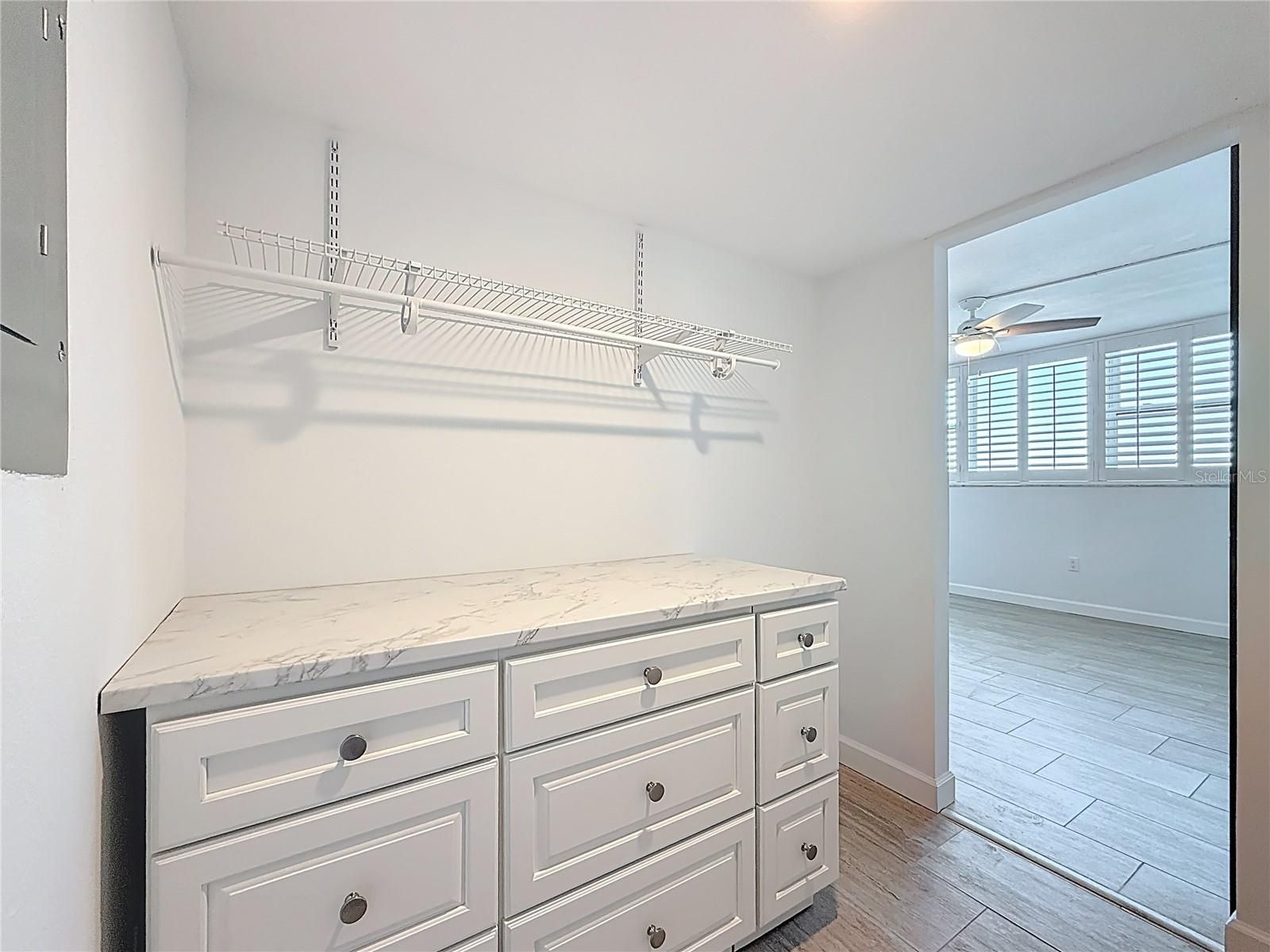 - Accessibility Features, Built-in Features, Ceiling Fan(s), Kitchen/Family Room Combo, Living/Dining Room, Open Floorplan, Main Level Primary, Solid Surface Counters, Solid-Wood Cabinets, Split Bedrooms, Stone Counters, Thermostat, Walk-In Closet(s), Window Treatments