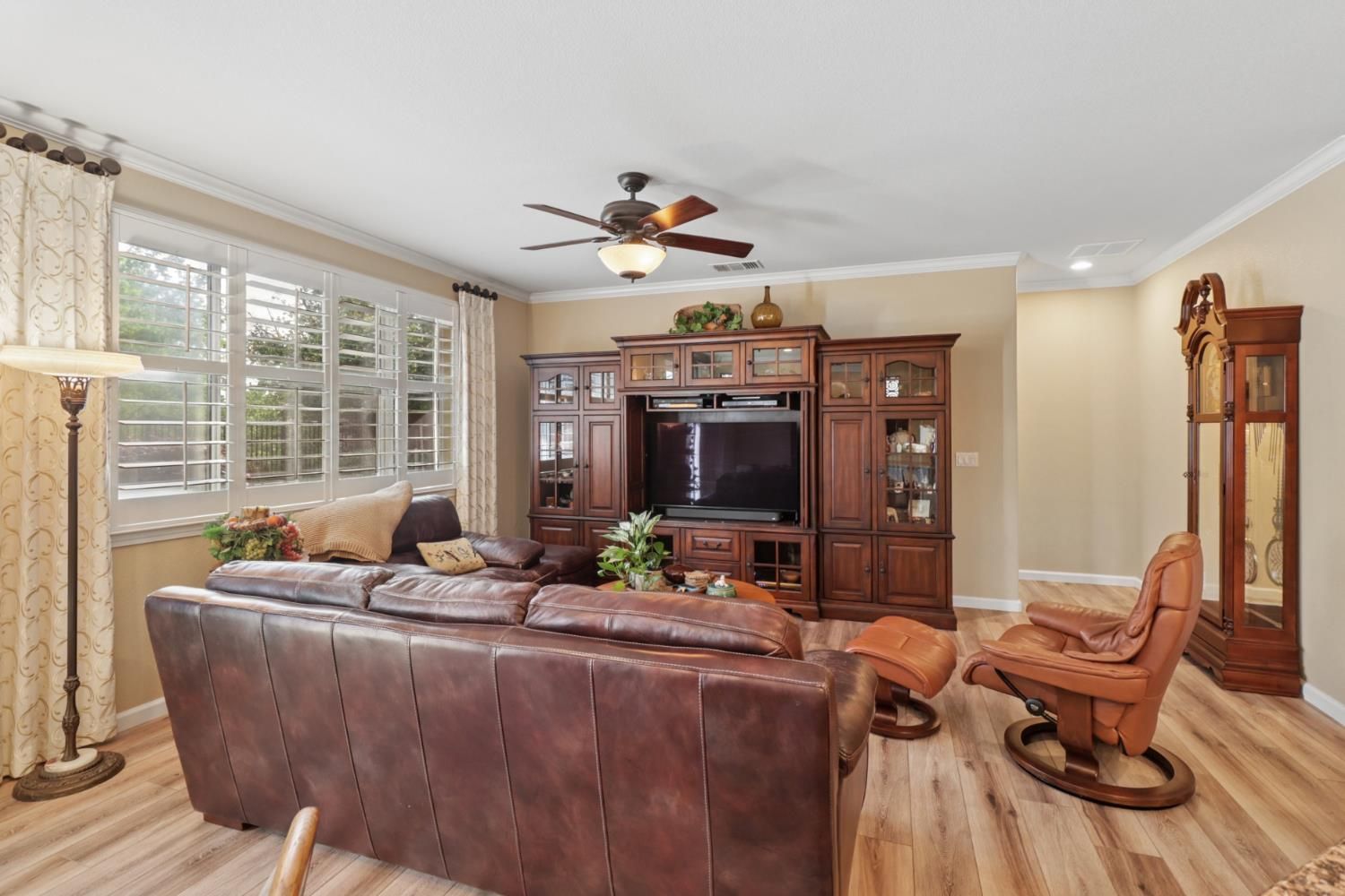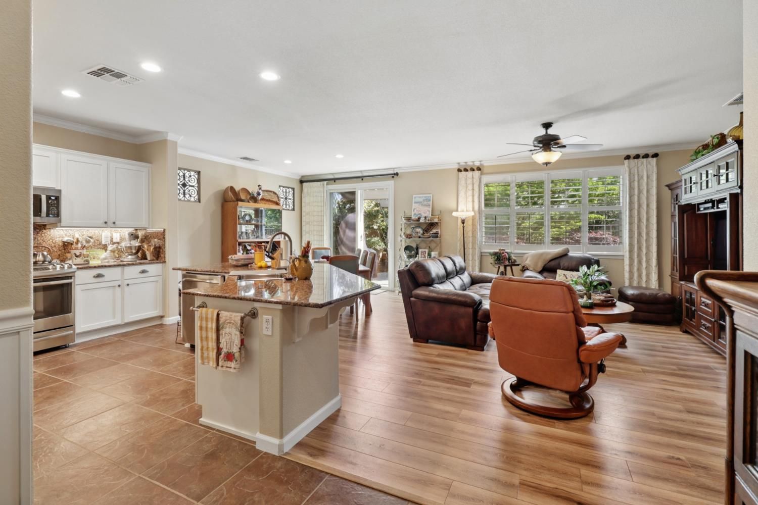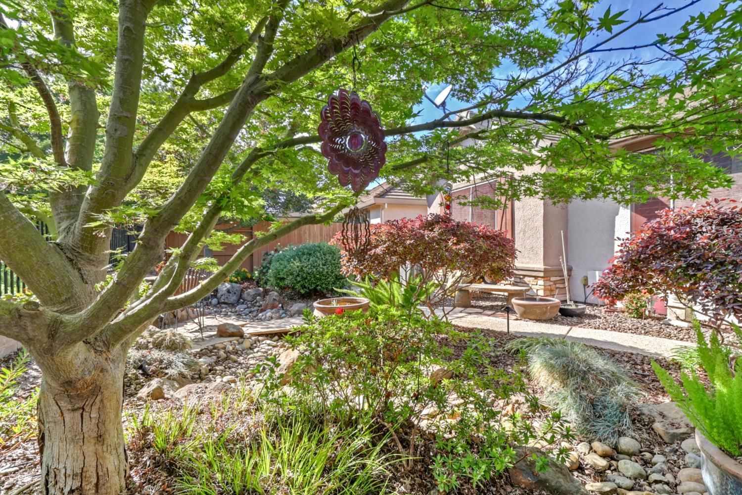 Tons of upgrades in this 3 bedroom Maggie model in Glenbrook by Del Webb, Elk Grove's premier 55+ community!! Enter into tile floors, wainscotting & crown molding throughout. 2 bedrooms upfront, both with ceiling fans/lights & shutter window coverings. Guest bath has shower over tub with tile accents at top of shower walls. Tile floors. Large open kitchen with island, granite counter tops, granite back splash, Upgraded white cabinets, stainless steel GE Profile gas stove/oven, microwave & dishwasher. Pantry closet. Kitchen open to great room with ceiling fan/light that also can blow off heat in the winter. Laminate wood floors in great room & dining area. Shutters on window to backyard. Protective screen doors on front door & back slider. Large primary bedroom with shutter for window. Dual sinks with white cabinets in Primary bathroom, big shower stall, walk-in closet with plenty of room. Back yard has very private covered patio with ceiling fan, light & pull down shade. Cement walk way to side gate. Lots of flowers, plants, tree's & dry creek bed. No neighbors behind you!! HVAC & Water heater roughly 5 years old! 2 car attached garage with opener. Lots of storage in garage.
