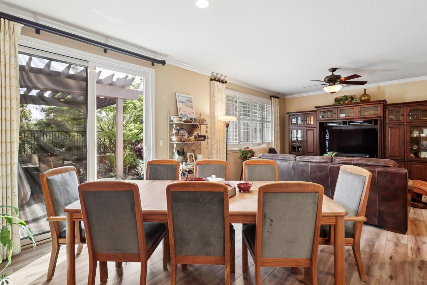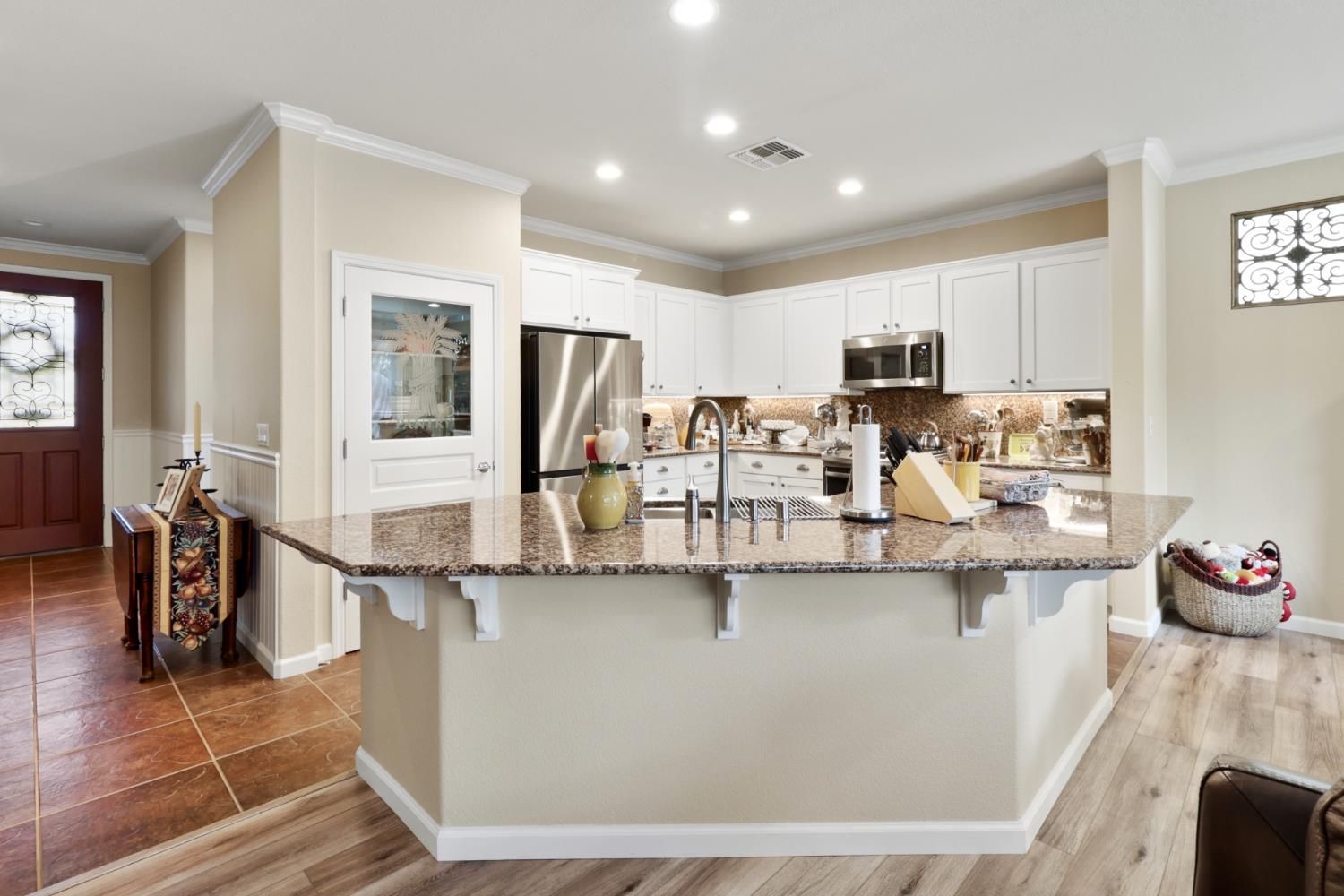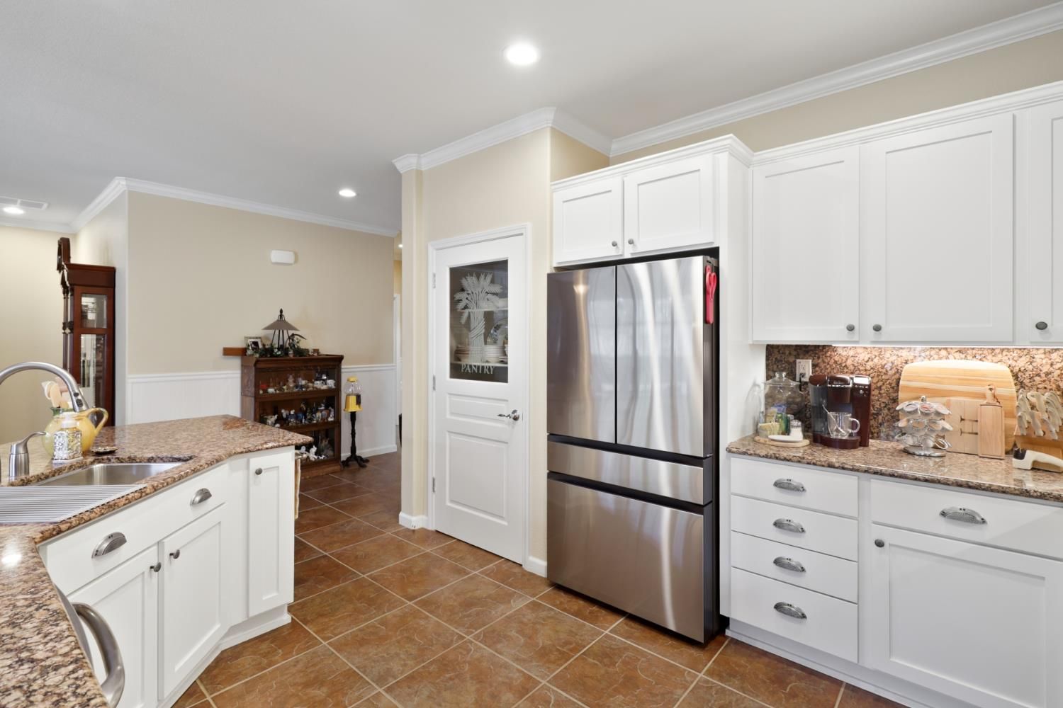 Tons of upgrades in this 3 bedroom Maggie model in Glenbrook by Del Webb, Elk Grove's premier 55+ community!! Enter into tile floors, wainscotting & crown molding throughout. 2 bedrooms upfront, both with ceiling fans/lights & shutter window coverings. Guest bath has shower over tub with tile accents at top of shower walls. Tile floors. Large open kitchen with island, granite counter tops, granite back splash, Upgraded white cabinets, stainless steel GE Profile gas stove/oven, microwave & dishwasher. Pantry closet. Kitchen open to great room with ceiling fan/light that also can blow off heat in the winter. Laminate wood floors in great room & dining area. Shutters on window to backyard. Protective screen doors on front door & back slider. Large primary bedroom with shutter for window. Dual sinks with white cabinets in Primary bathroom, big shower stall, walk-in closet with plenty of room. Back yard has very private covered patio with ceiling fan, light & pull down shade. Cement walk way to side gate. Lots of flowers, plants, tree's & dry creek bed. No neighbors behind you!! HVAC & Water heater roughly 5 years old! 2 car attached garage with opener. Lots of storage in garage.