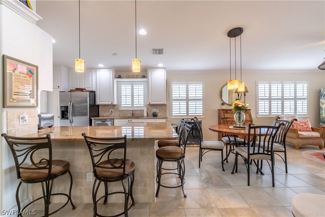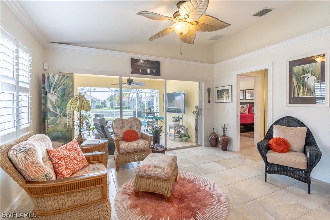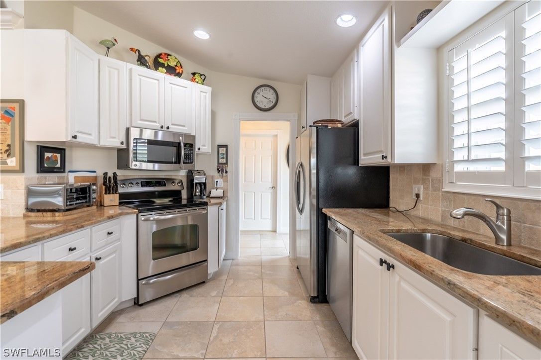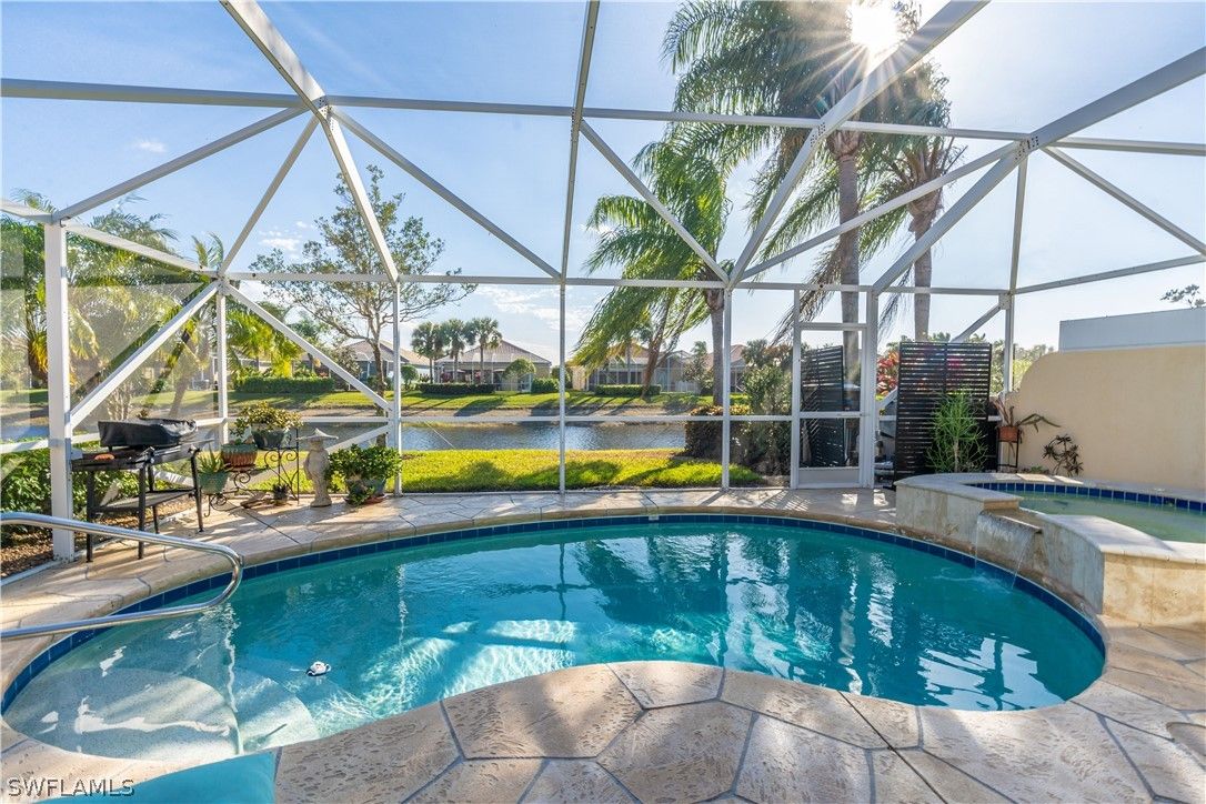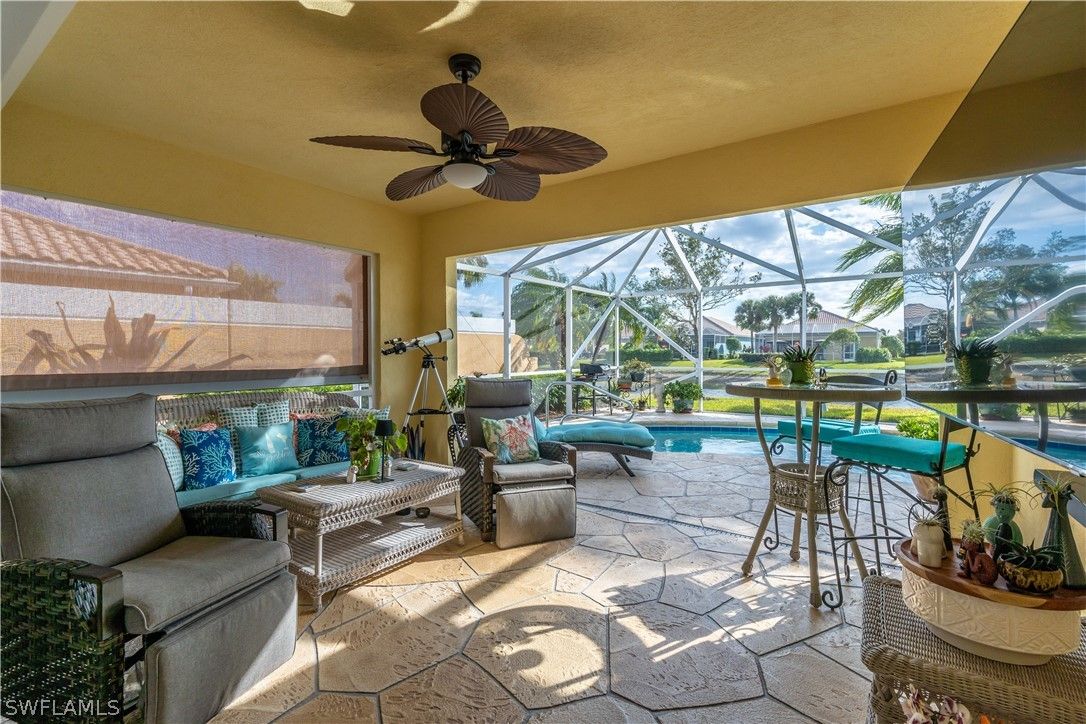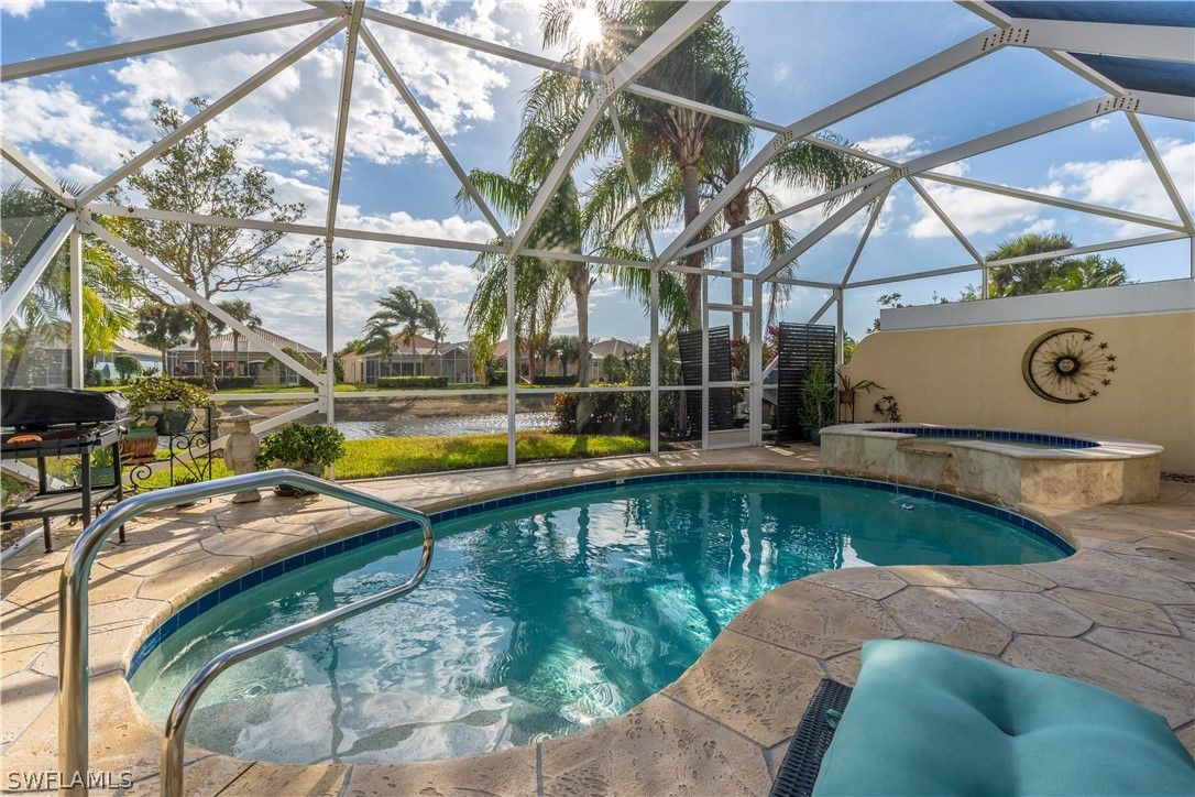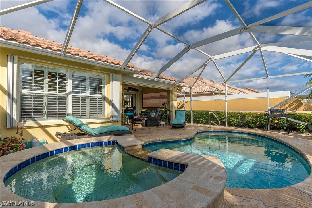 If you are looking for a meticulously maintained Florida escape, this home is for you! Updated and move in ready, this attached two bedrooms/two bath with den, villa is located in the gated resort community of VeronaWalk in bustling East Naples. A split bedroom floorplan offers privacy when entertaining overnight guests. Vaulted ceilings in the main living area are wrapped in crown molding. Freshly painted in neutral tones, a shiplap featured wall unit, plantation shutters, modern ceiling fans and lighting fixtures add flair. No carpet here. Flooring is tile or laminate. The centrally located kitchen boasts abundant cabinetry, rich granite counters, stainless appliances (including a deep basin sink), and stone backsplash/breakfast bar surround. Both baths have granite topped vanities with modern fixtures. From your two-car garage, you enter your full laundry room with more storage, granite counters and a wash sink. A covered, stamped concrete lanai adjoins an enclosed pool cage housing an inviting kidney shaped pool/spa with waterfall feature. From here, a deep lawn leads to the quiet water’s edge flowing by the rear of the unit. This home is storm protected with accordion shutters on all windows and electric models shielding the lanai. A new, contemporary glass front door and exterior lighting present a fresh face to the home. Enjoy Naples living with ease in this tropical retreat.
