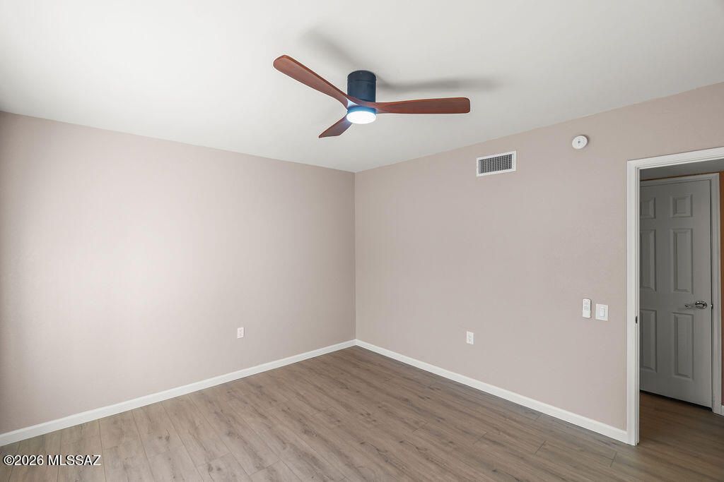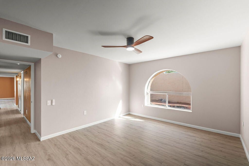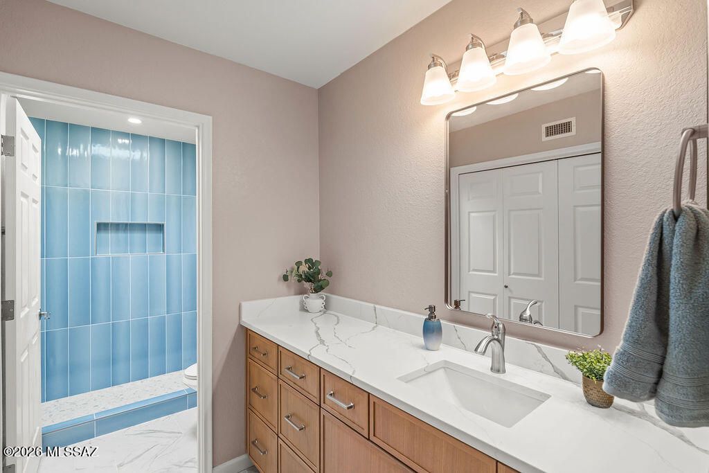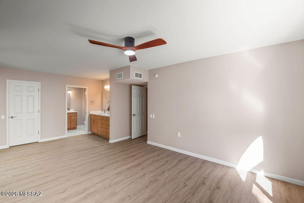 Discover this beautifully renovated townhome in the highly coveted Esperanza Estates, where modern upgrades meet effortless desert living. With 2,111 square feet of thoughtfully refreshed space, this home offers comfort, style, and an inviting flow throughout. Step inside to find fresh interior paint, a brand‑new kitchen with all‑new cabinetry, gleaming quartz countertops, and stainless-steel appliances. The living room, dining area, and enclosed Arizona room connect seamlessly, enhanced by striking aviator‑style wood light/fan fixtures that add a touch of contemporary charm. Both bathrooms have been completely updated, featuring tiled walk‑in showers and elegant quartz‑top vanities. The spacious primary bedroom includes an additional matching vanity with