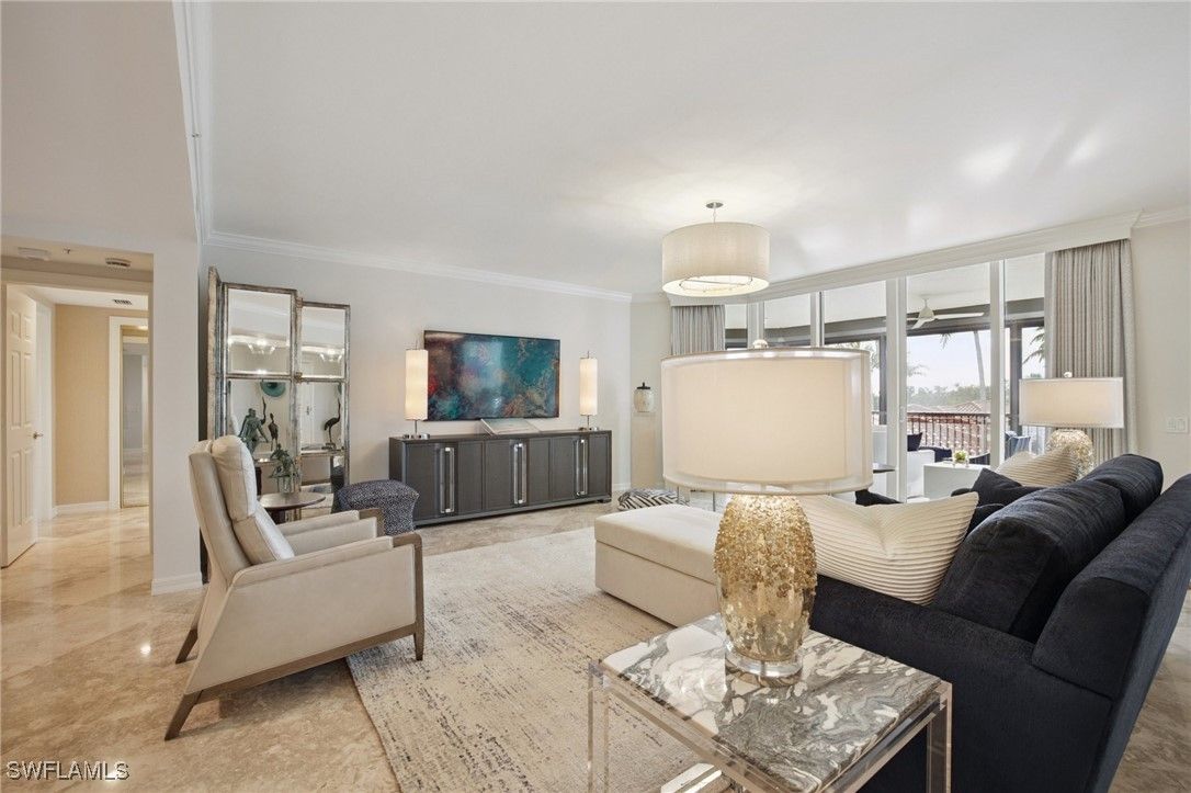 Enjoy refined resort-style living in one of Pelican Bay's most coveted residences. This exceptional condominium lives like a private single-family home, offering serene tropical views from every room. Featuring three bedrooms plus a den and three-and-a-half baths, the residence is luxuriously furnished with impeccable attention to detail. A private vestibule and gracious foyer welcome you inside, where marble flooring flows throughout the main living and primary bath areas. Additional highlights include custom-designed closets, electric storm shutters, and a spacious screened lanai ideal for indoor-outdoor living. Condo has been meticulously updated and maintained with upgraded HVAC and hot water tank. A private two-car garage provides generous storage and convenience. Pelican Bay residents enjoy an unparalleled coastal lifestyle with miles of pristine white-sand beaches, two private beachfront clubs with full-service restaurants, 18 Har-Tru tennis courts, pickleball courts, and a state-of-the-art fitness and wellness center- all moments from your door.