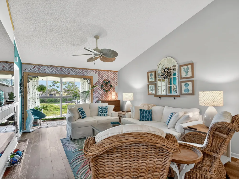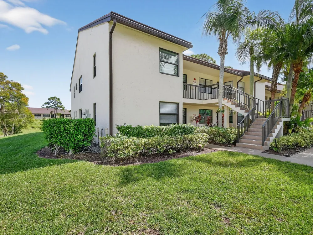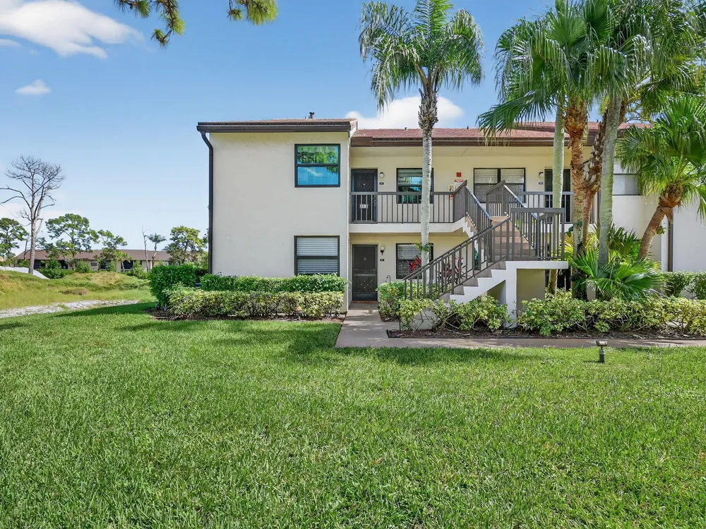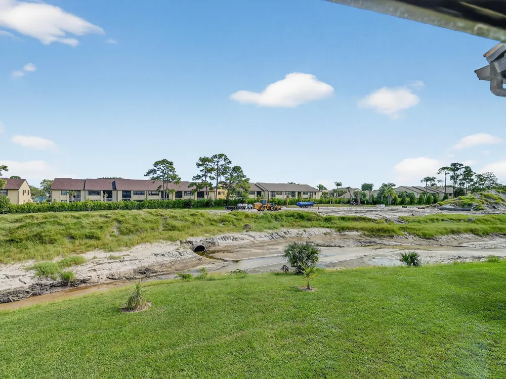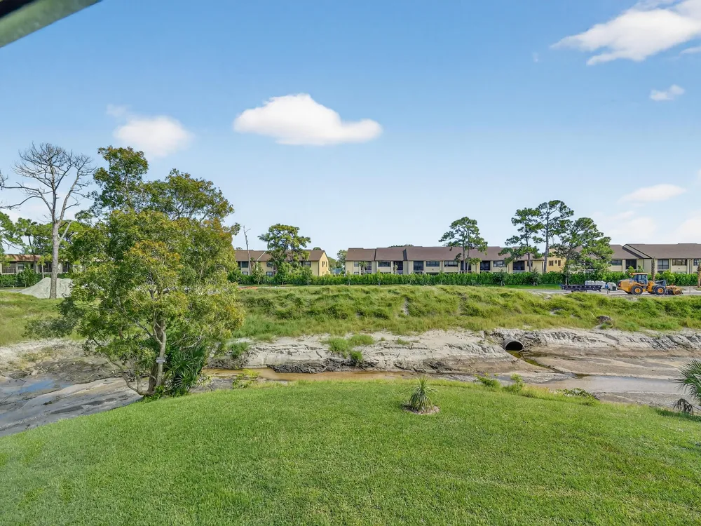 Impeccable, stunning aparment with views of water from all windows. This end unit apartment with vaulted ceilings has been beautifully updated starting with high rated impact windows. The a/c is a larger high efficiency unit, 2 yrs old. The water heater and washer and dryer are 4 years new. Bathrooms have been updated with frameless shower within 1 year. Kitchen with extensive cabinets including by bar stools. Built in firepalce with designer wood accents on wall - doors are upgraded with designer inserts. The patio area has a/c and is part of the home. The views are water and park areas. This is a 2 story building and does not have state required engineering requirements. Roof is 6 1/2 years new. This home is perfect. Close to Turnpike, shopping movie theatre.