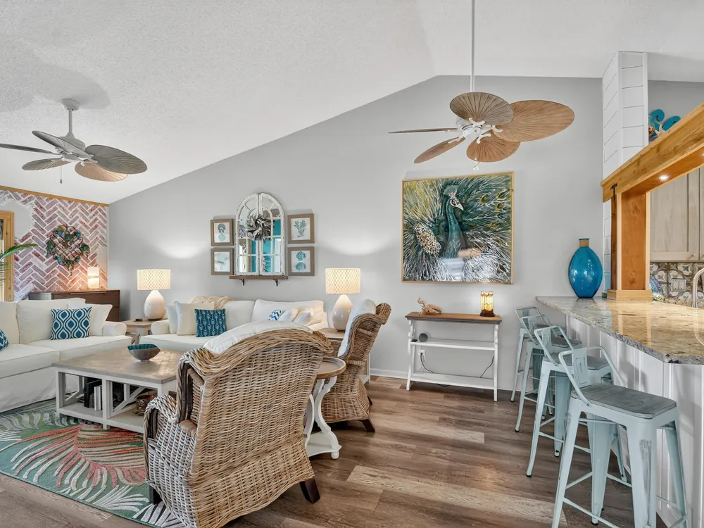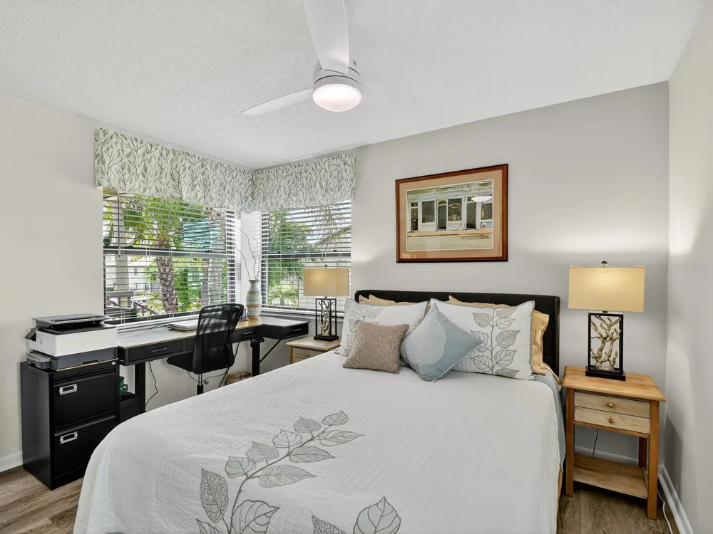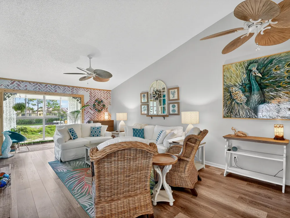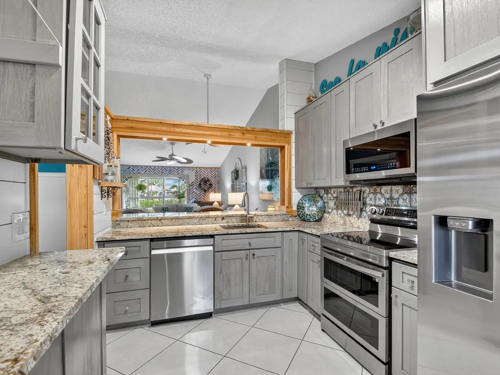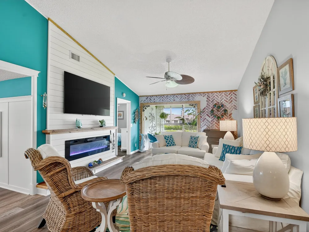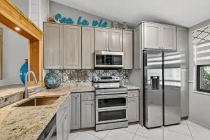 Impeccable, stunning aparment with views of water from all windows. This end unit apartment with vaulted ceilings has been beautifully updated starting with high rated impact windows. The a/c is a larger high efficiency unit, 2 yrs old. The water heater and washer and dryer are 4 years new. Bathrooms have been updated with frameless shower within 1 year. Kitchen with extensive cabinets including by bar stools. Built in firepalce with designer wood accents on wall - doors are upgraded with designer inserts. The patio area has a/c and is part of the home. The views are water and park areas. This is a 2 story building and does not have state required engineering requirements. Roof is 6 1/2 years new. This home is perfect. Close to Turnpike, shopping movie theatre.