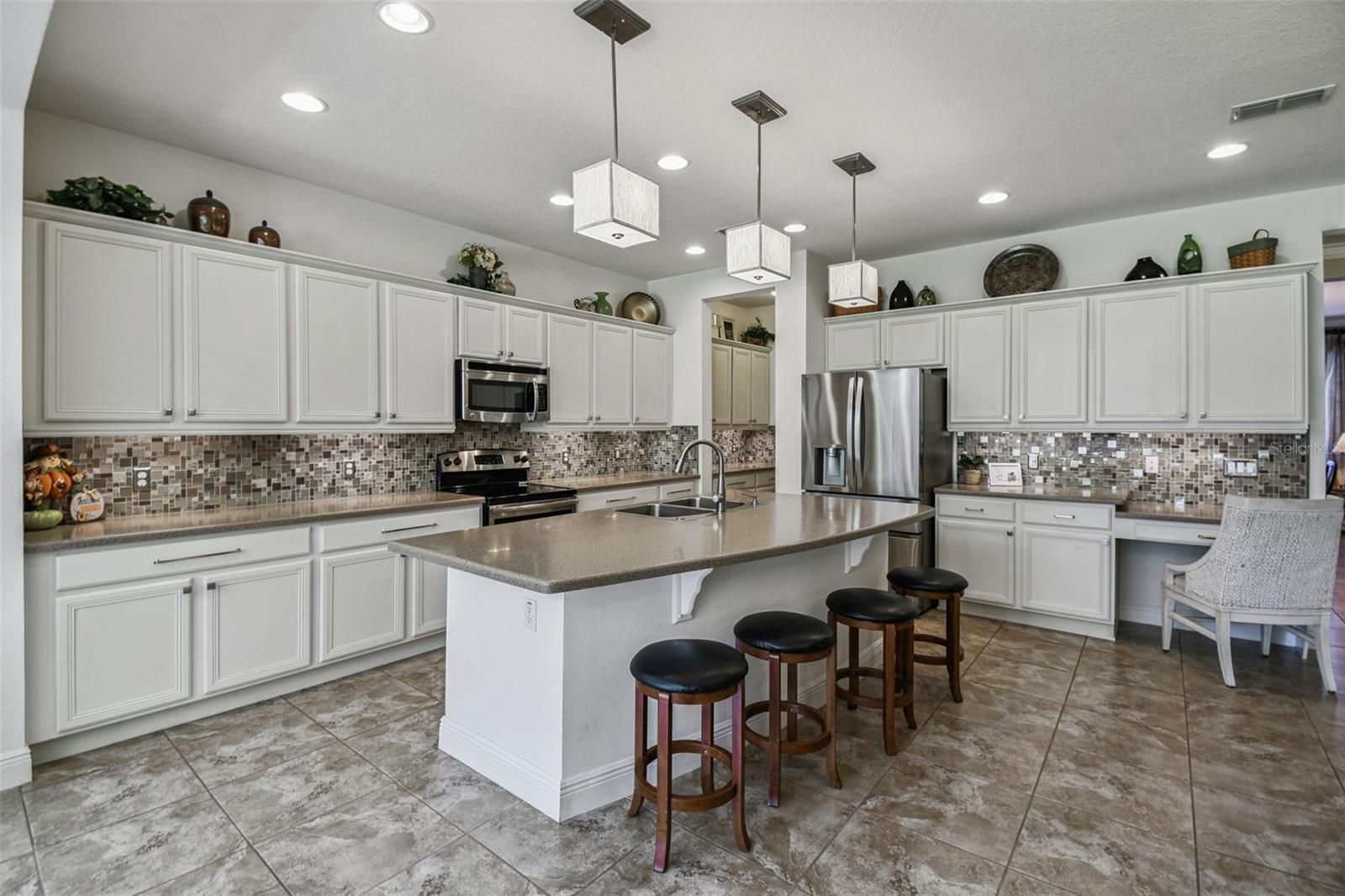 Located near The Palms Resort Amenity Center, this beautifully appointed Naples Model (2.956 Sq Ft) offers the perfect blend of comfort, style, and functionality. Designed for both everyday living and effortless entertaining, this spacious home sits on a premium corner lot with tranquil conservation views. Step into the private courtyard, an inviting outdoor retreat ideal for relaxing or gardening. Enter through the leaded glass front door into a bright and open living space featuring 18-inch ceramic tile floors throughout the main areas, custom illusion blinds, and a vaulted ceiling with a Minka ceiling fan. The Great Room, framed by custom drapes and conservation views, flows seamlessly into the Dining Room, where you’ll find an elegant chandelier, crown molding, and tailored window treatments. The living area extends into the enclosed 4-season room with a conservation view adding versatile space for year-round enjoyment. The chef’s kitchen is both stylish and functional, offering: A breakfast nook and island/bar with pendant and recessed lighting, Stainless steel appliances, including a 2024 LG 4-door Smart Refrigerator with extended warranty, Tile backsplash & under-cabinet lighting, 24 full-extension pull-out drawers, deep double sink with upgraded faucet, and Large walk-in pantry plus Butler’s pantry. The Primary Suite is an oversized retreat with luxury vinyl plank flooring, an expansive (WOW) customized walk-in closet with drawers, bench seating, and overhead storage. The en-suite bath features a walk-in shower with seat, dual sinks, wall-to-wall cabinetry with pull-outs, and custom lighting. On the opposite side of the home, the Guest Suite offers privacy with its own flexible office/sitting area with built-in shelving and a private bath featuring a walk-in shower, upgraded fixtures, and custom cabinetry with pull-outs drawers. Additional upgrades include: "Easy on the back" full extension pull-out drawers throughout the kitchen and both bathrooms. A Laundry room with custom cabinets and sink. 2-car garage with epoxy flooring, built-in shelving, overhead storage and an extra refrigerator. Also, a much desired separate golf cart garage. This exceptional home is a quick close, move-in ready and offers the ideal combination of thoughtful upgrades, spacious design, and a highly desirable location close to Solivita’s resort-style amenities. Solivita offers residents access to state of the art amenities and work out facilities, dance and aerobics studios, a business center, 14 heated swimming pools, 2 heated spas, tennis courts, pickleball courts, shuffleboard, bocce ball, billiards room, art gallery, 3 restaurants and 2 championship 18-hole golf courses, driving range and putting course. Every day offers something new to explore and enjoy! This home also features easy access to nearby shops,as well as a brand new shopping center that caters to all your needs (including Sprouts) dining, and health care, offering the perfect balance of privacy and lifestyle.