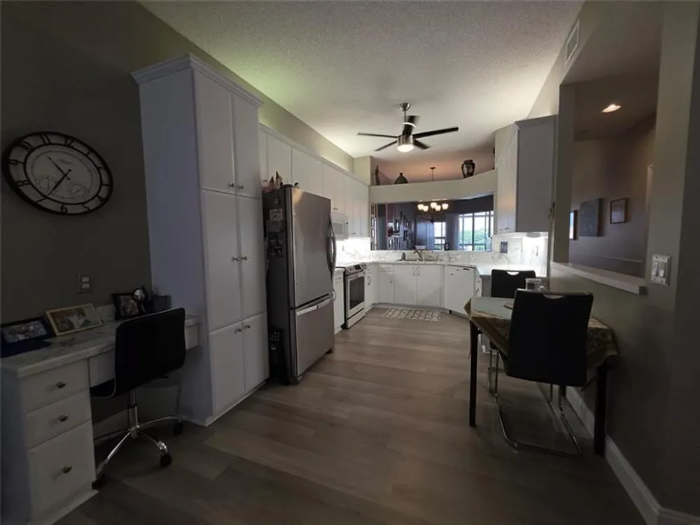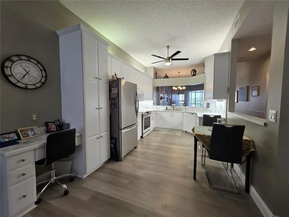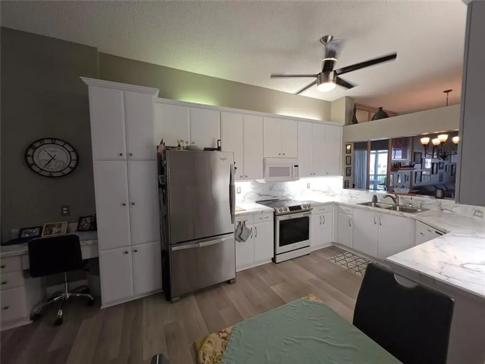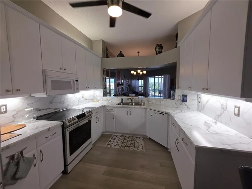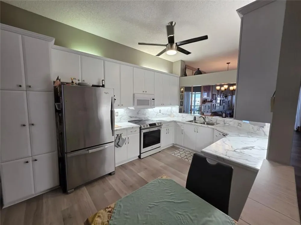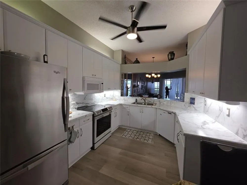 Absolutely gorgeous 2 bed, 2 bath plus large den penthouse! 10' high ceilings. Expansive water views! Large front porch entrance. Foyer leads to open floor plan with elegant split bedroom design. High end luxury vinyl flooring throughout living area. Beautifully remodeled kitchen w/ eat in area, pantry, desk area. Separate laundry room w/full size washer/dryer. Rarely available covered parking space. Granville is a double guard gated exclusive area in fabulous Kings Point! Amazing lifestyle w/ freestanding theatre, live shows, weekly movies, indoor & outdoor pools, state of the art gym. Over 50 different clubs! From Granville building F just walk across street to Granville's own lakefront clubhouse offering olympic size pool, sauna, showers, card room, tennis court and serene park area.