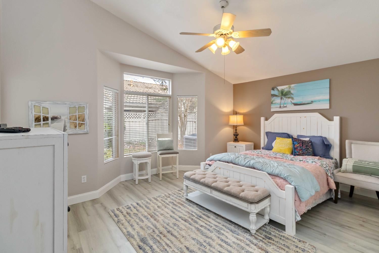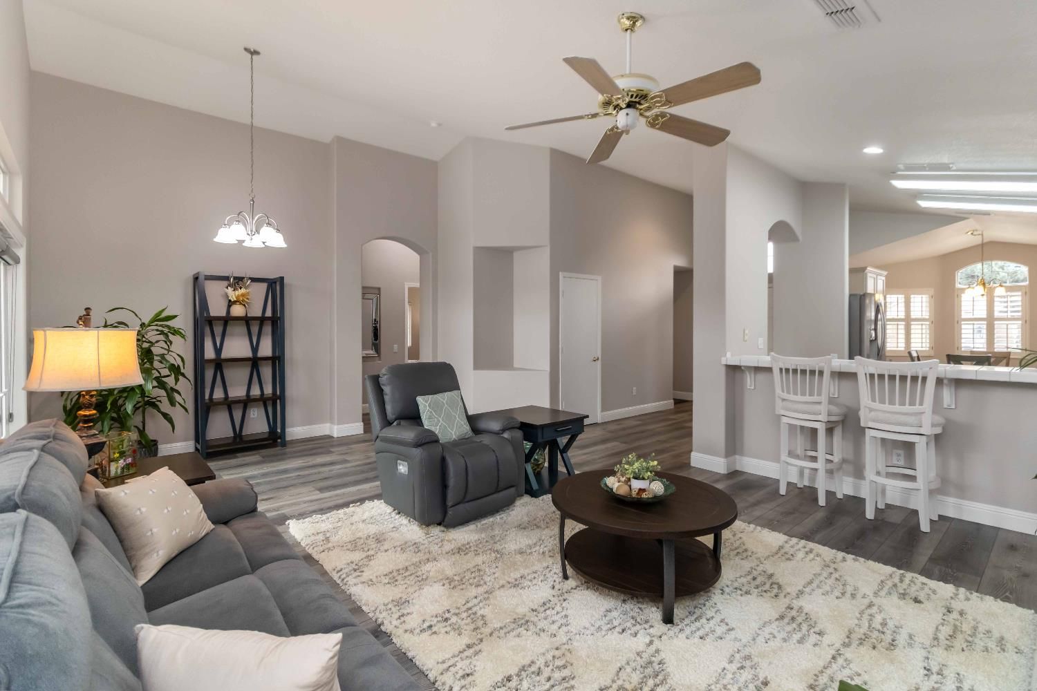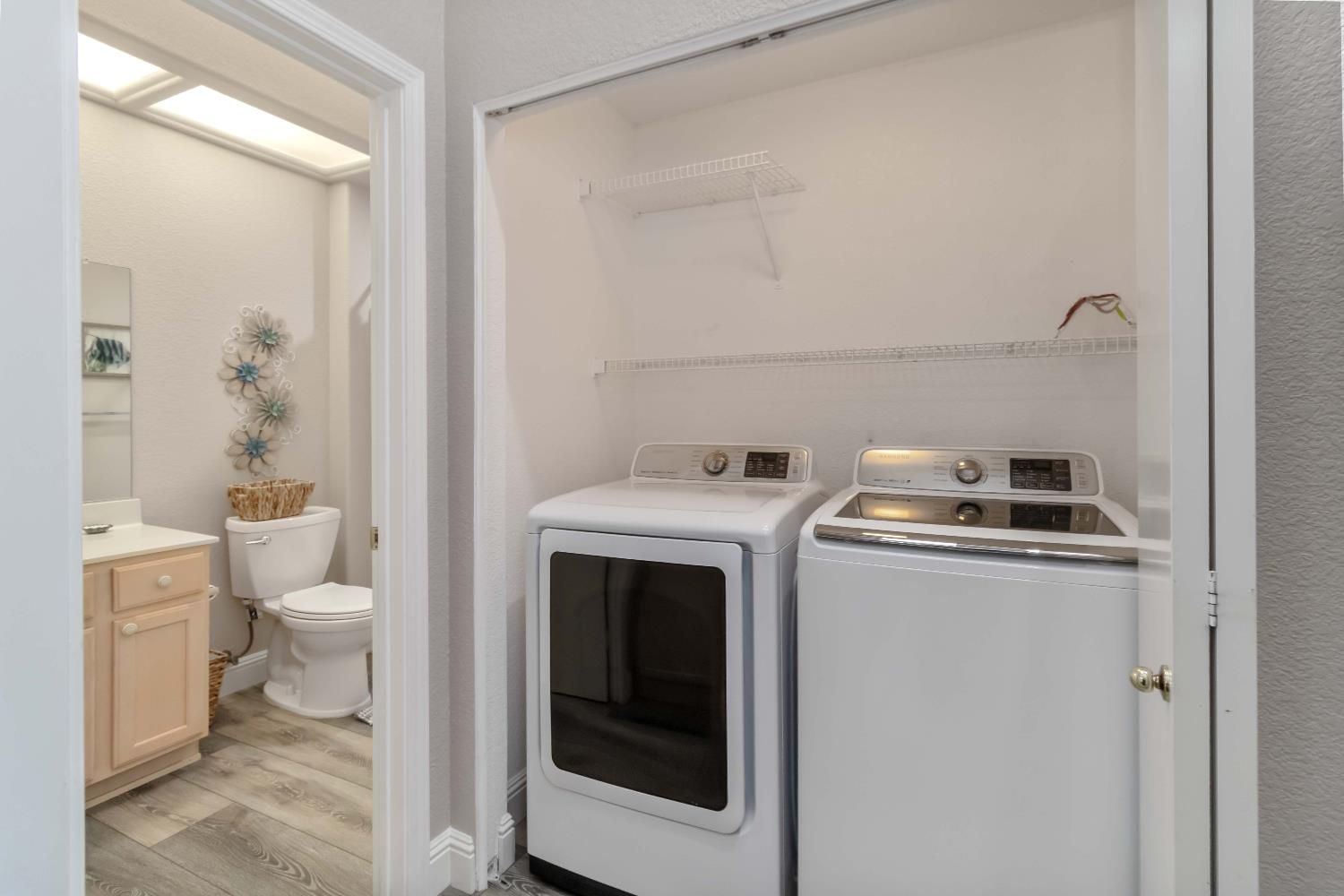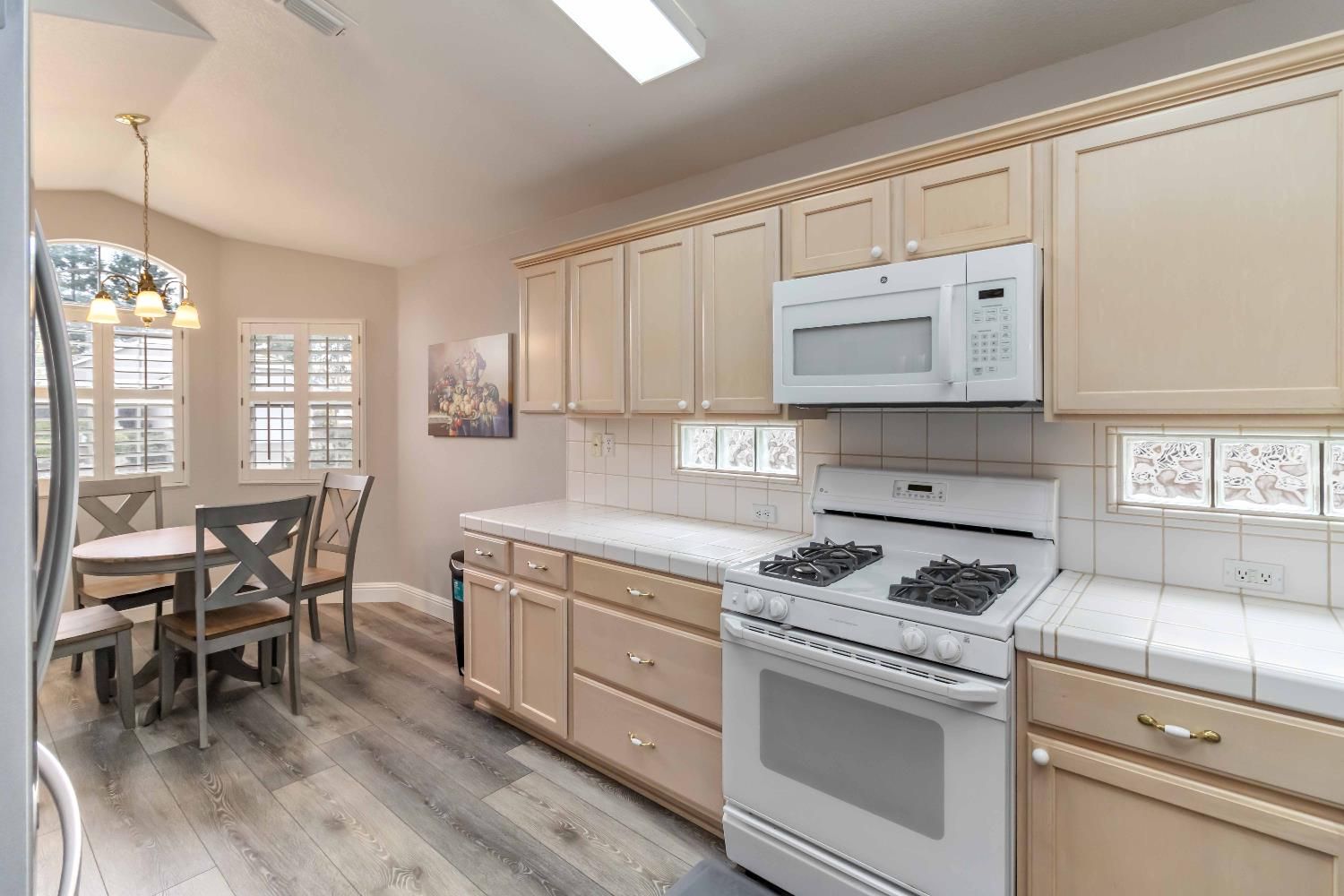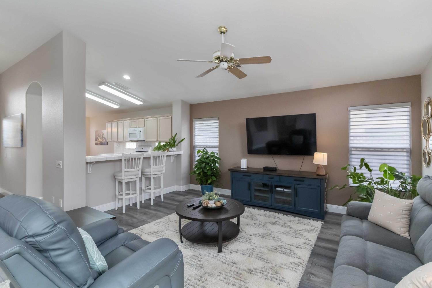 Lovely 2 BR 2 BA Orchard Floorplan with 1334 square feet at a great price for this model! Enjoy the Sun City lifestyle in this low cost, high reward community built by Del Webb! Luxury Vinyl Plank flooring with 5.25 inch baseboards, neutral paint palette, stylish, cascade-style roman shades for most window coverings. Kitchen includes a stainless refrigerator and dishwasher and gas stove with vented microwave. Washer/dryer included with indoor laundry room. Multiple overhead fans/lighting and French doors to rear covered patio. Bryant Heating, Ventilation Air Conditioning system is not original. Easy maintenance front and back yard. Live the Dream with low dues and no Mello Roos Assessments. Virtual tours available upon request.