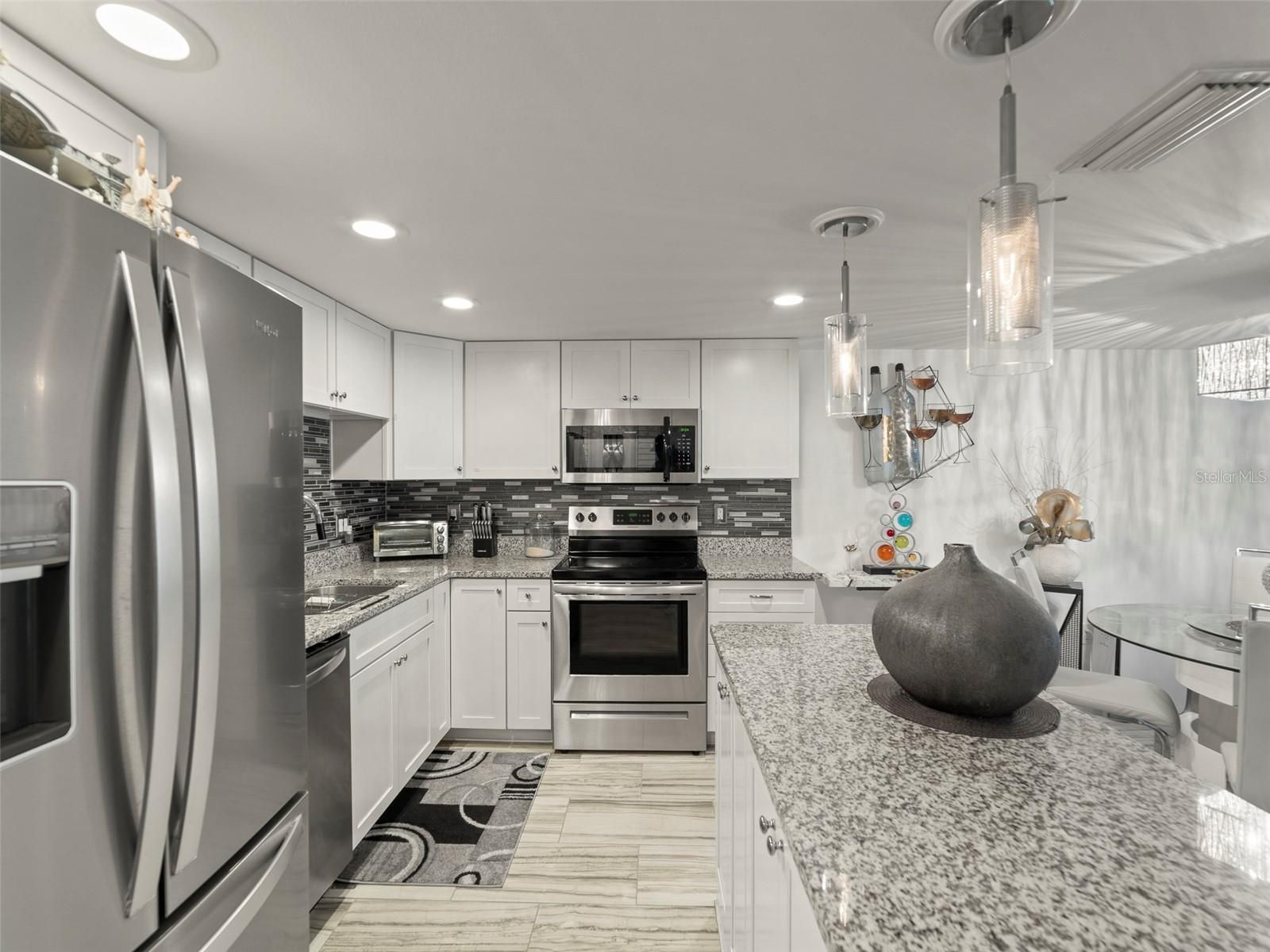 Experience absolutely breathtaking panoramic water views of Boca Ciega Bay and the Gulf of Mexico from this extensively renovated residence in the prestigious Presidential Building at Bay Island — a gated 55+ waterfront community offering 24-hour security and an exceptional resort-style lifestyle. Completely updated from floor to ceiling, this sophisticated coastal retreat showcases quality craftsmanship and designer finishes throughout. The chef-inspired kitchen features soft-close white cabinetry with drawers, gleaming granite countertops, glass tile backsplash, stainless steel appliances, and elegant decorative lighting. Remote-controlled ceiling fans enhance comfort, while ceramic tile flooring flows seamlessly throughout the entire home for a polished, cohesive look. The open-concept living space is framed by impact-rated sliding glass doors leading to the waterfront lanai, where automatic hurricane shutters provide convenience and peace of mind. A built-in Murphy bed offers stylish flexibility for overnight guests. The primary suite is a private sanctuary highlighted by a contemporary gray barn door with glass tile accents, a new double-pane window, and a beautifully appointed en-suite bath featuring a spacious white vanity with drawers, granite countertops, and a walk-in glass shower. The secondary bath is equally refined with a walk-in glass shower and granite-topped vanity. A stackable washer and dryer are conveniently located inside the residence. Additional Features Include: • Elevated building with NO hurricane damage in the Presidential Building • Automatic hurricane shutters on lanai and primary bedroom window • Two private storage areas (lanai + first-floor hall storage) • Water, cable, and exterior maintenance included in HOA • Secure, well-maintained building with strong community pride Residents of Bay Island enjoy over a mile of scenic waterfront sidewalks, heated pool and spa, tiki hut picnic areas with grills, a clubhouse with ballroom available for private events, billiards, ping-pong, dart room, card room, shuffleboard courts, saunas, updated his-and-hers fitness centers, and a dedicated Social Director coordinating dances and community gatherings year-round. Ideally positioned near dining, shopping, and public transportation with the SunRunner at the gated entrance. Just minutes to vibrant downtown St Petersburg, the upscale shops and restaurants at Sundial St Pete, world-class museums, and convenient access to Tampa International Airport and St Pete-Clearwater International Airport. Refined waterfront luxury. Exceptional amenities. Elevated peace of mind. Welcome to your coastal paradise.