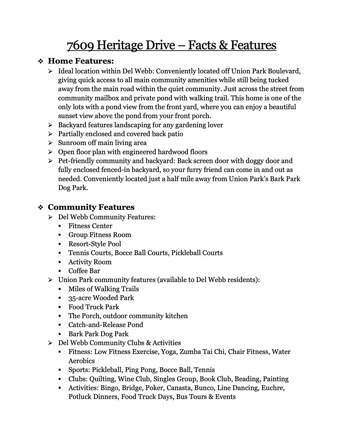 Looking for peaceful, resort-style living with a vibrant social atmosphere and stunning sunset views from your front porch? Welcome to this meticulously maintained home in the highly sought-after 55+ Del Webb at Union Park! Ideally situated on one of the few pond-view lots in the neighborhood, this home offers serene water views right from the front porch—perfect for enjoying breathtaking evening sunsets. Conveniently located just across the street from the community mailbox and private pond with walking trail, the property also provides quick access to Union Park Boulevard and all main community amenities, while remaining tucked away within a quiet interior section of the neighborhood. Inside, you’ll find engineered hardwood floors throughout and an open-concept floorplan designed for easy, comfortable living. The chef’s kitchen features stainless steel appliances, a gas range, and a bright breakfast nook with a view of the pond. This 2-bed 2-bath home features a primary bedroom with backyard views, ensuite bath and spacious walk-in closet. Off the foyer and kitchen is the second bedroom and full bath, perfect for guests. A bonus sunroom off the main living area offers abundant natural light and a peaceful view of the fully fenced backyard—perfect for relaxing, reading, or entertaining guests. Pet lovers will appreciate the enclosed backyard, complete with a screened back door and built-in doggy door for added convenience. The home is located just half a mile from Bark Park Dog Park, making it easy to keep your furry companions active and happy. Del Webb is a vibrant and welcoming community where residents enjoy access to resort-style amenities including a pool, fitness center, sport courts, group fitness classes, clubs, and a full calendar of social activities. This is more than a home—it’s a lifestyle. *Complete list of community features and amenities available in Transaction Desk; Virtual Tour available via MLS & upon request*