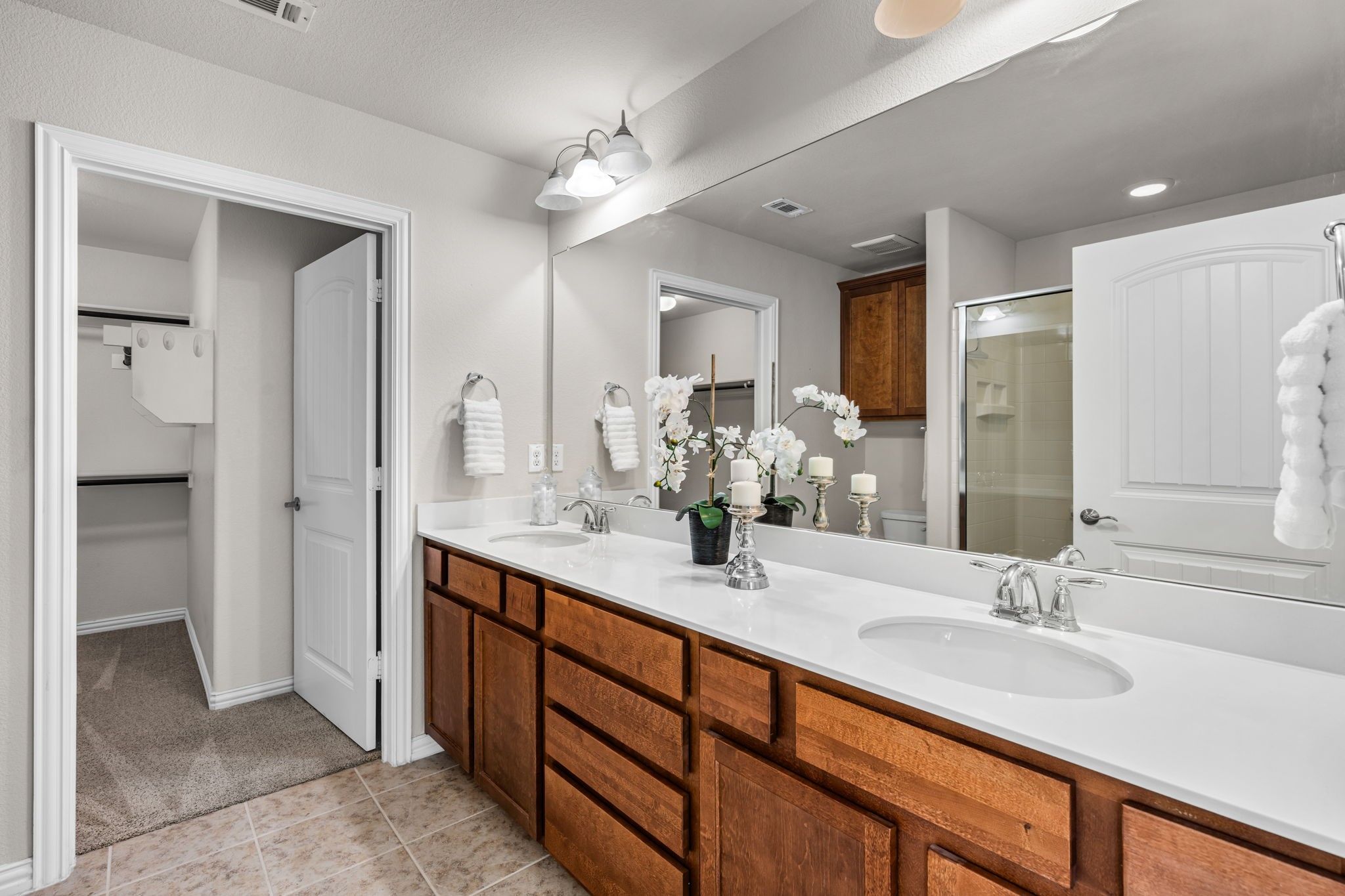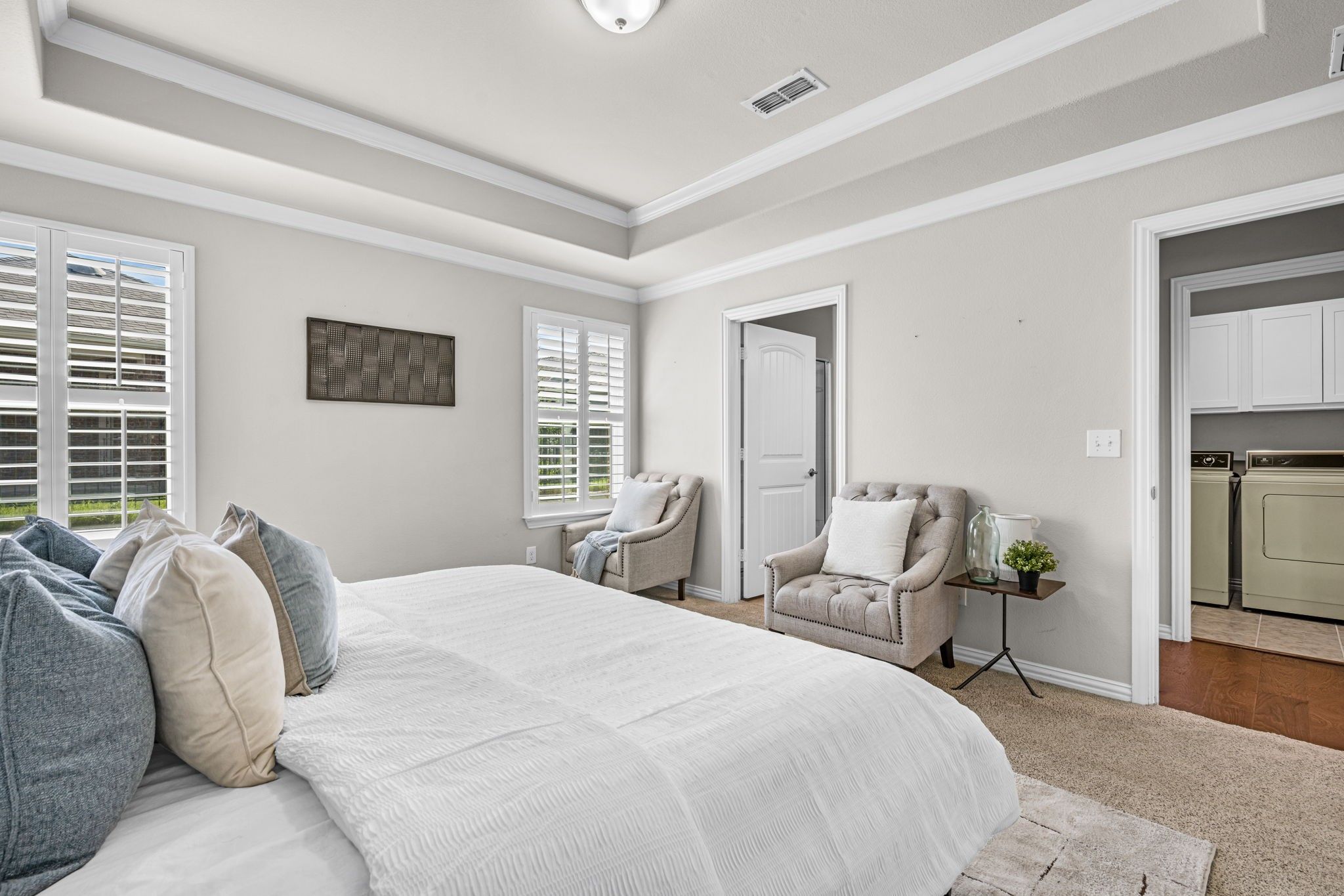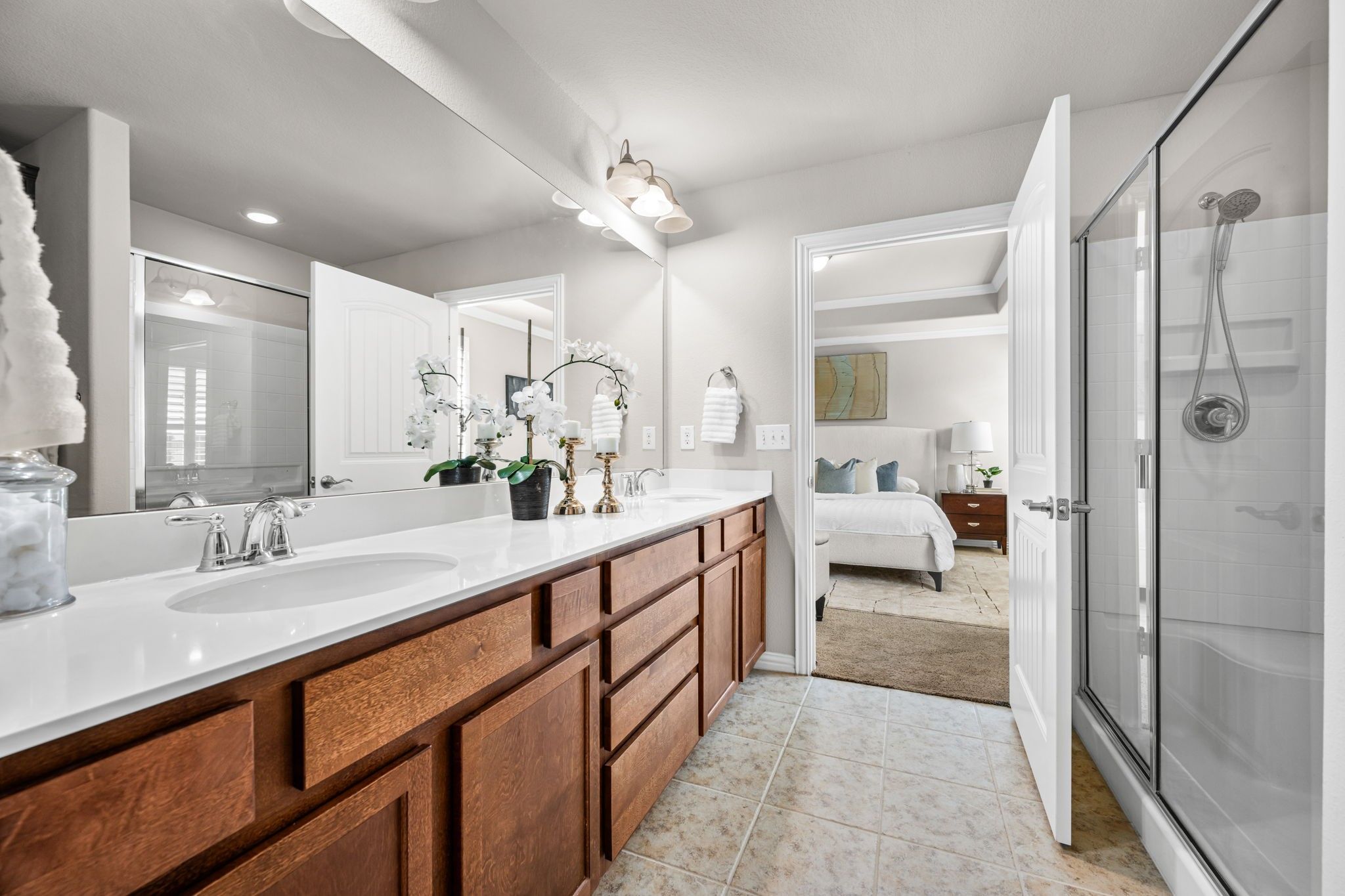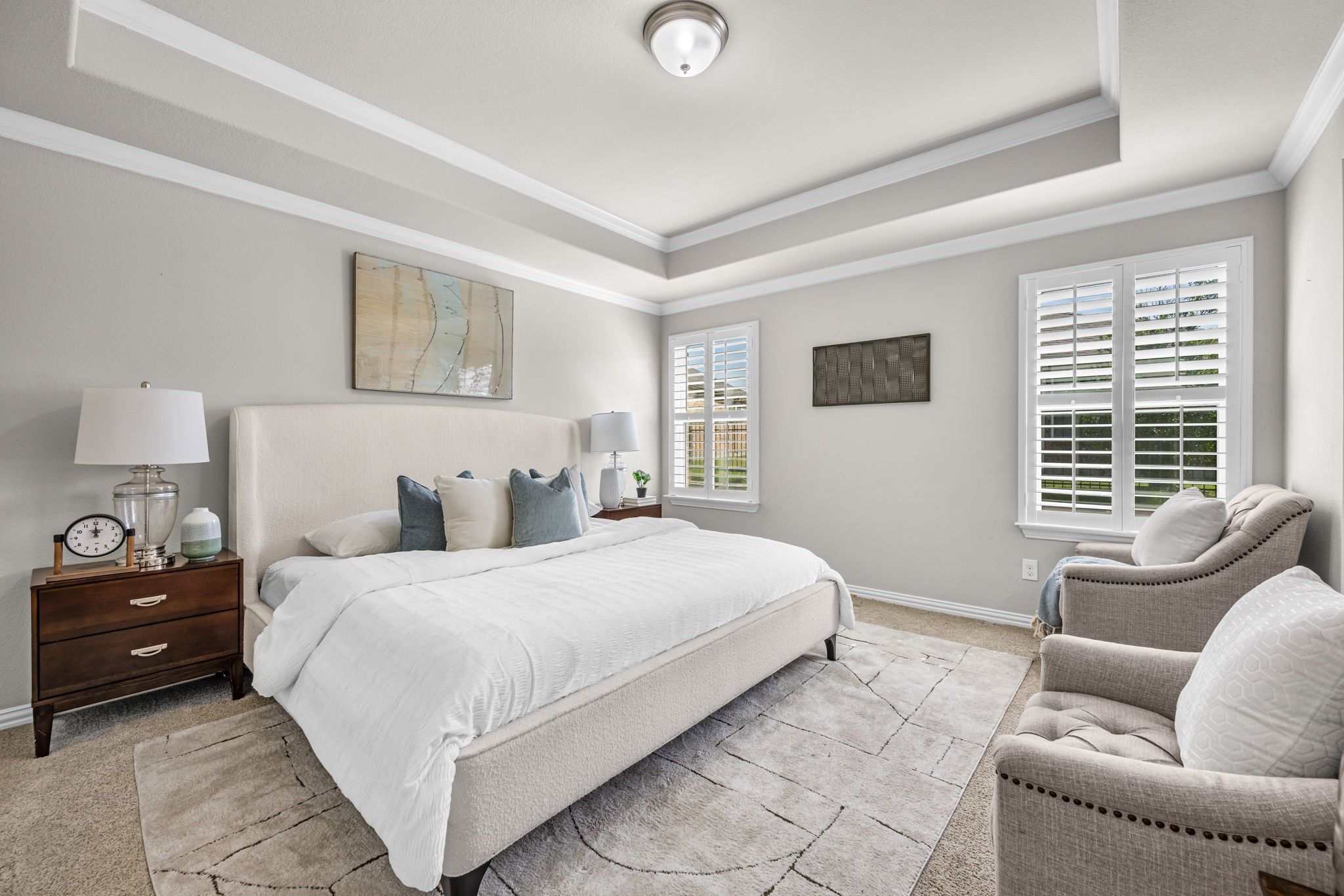 Step into elegance and comfort with this beautifully appointed home located on an oversized homesite near the North Amenity Center at 55+ Frisco Lakes. This Taft Street floorplan, built in 2015, is designed for both relaxation and entertaining. The expansive covered patio, finished in timeless travertine tile, provides the perfect setting for outdoor gatherings while enjoying the privacy of lush, mature landscaping. Inside, you’ll find hardwood floors throughout, plantation shutters, granite countertops, tray ceilings, French doors, and a huge sunroom filled with natural light. This home effortlessly combines luxury finishes with thoughtful design, creating a warm and inviting retreat. Frisco Lakes delivers the resort lifestyle you've dreamed of with access to three exclusive state-of-the-art amenity centers, indoor and outdoor pools for year-round enjoyment, three fitness centers, tennis and pickleball courts, scenic lakeside walking trails along Lake Lewisville, an onsite restaurant bar and grill, an 18-hole golf course, and vibrant social scene with over 150 clubs and activities to explore!