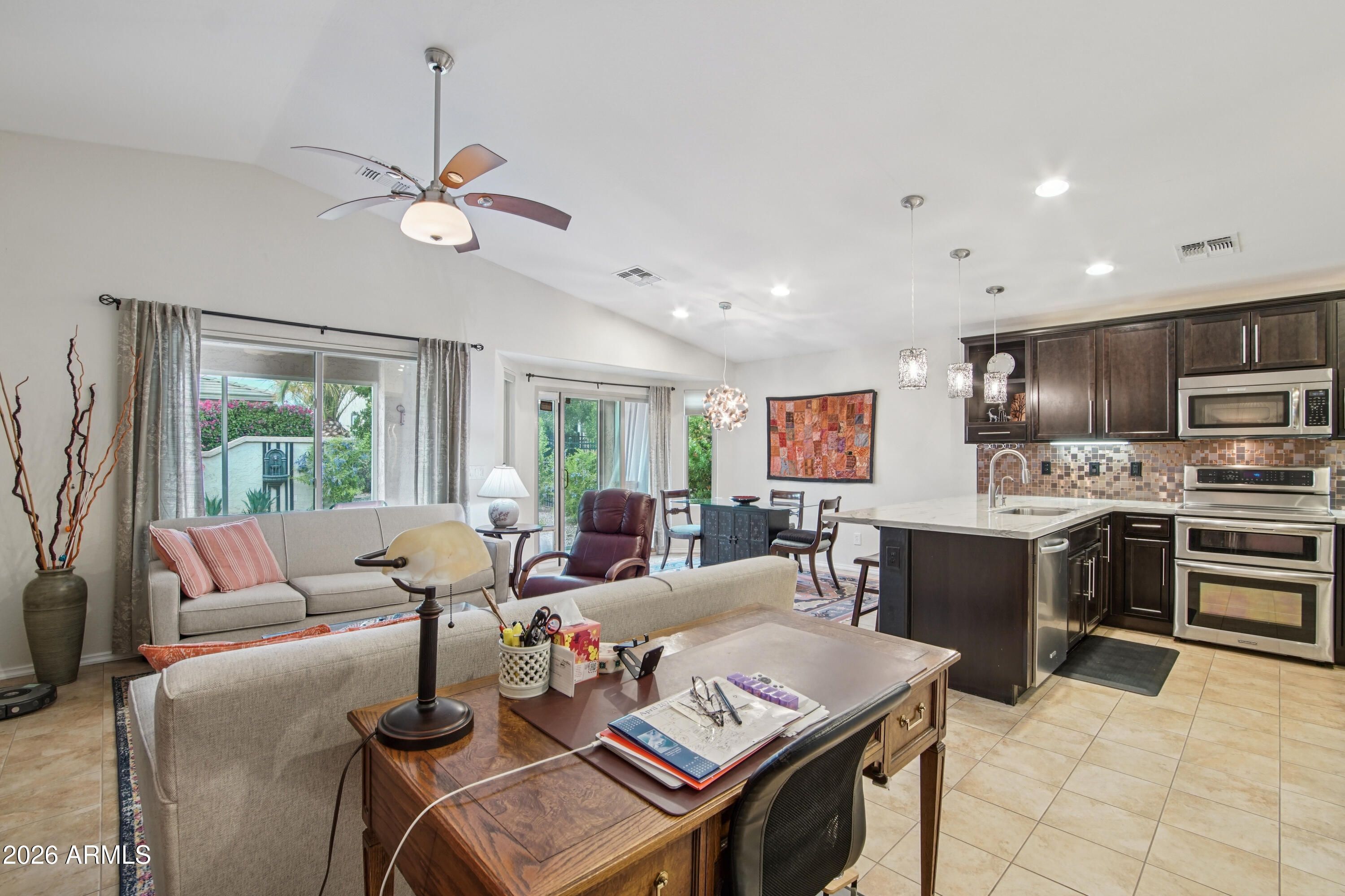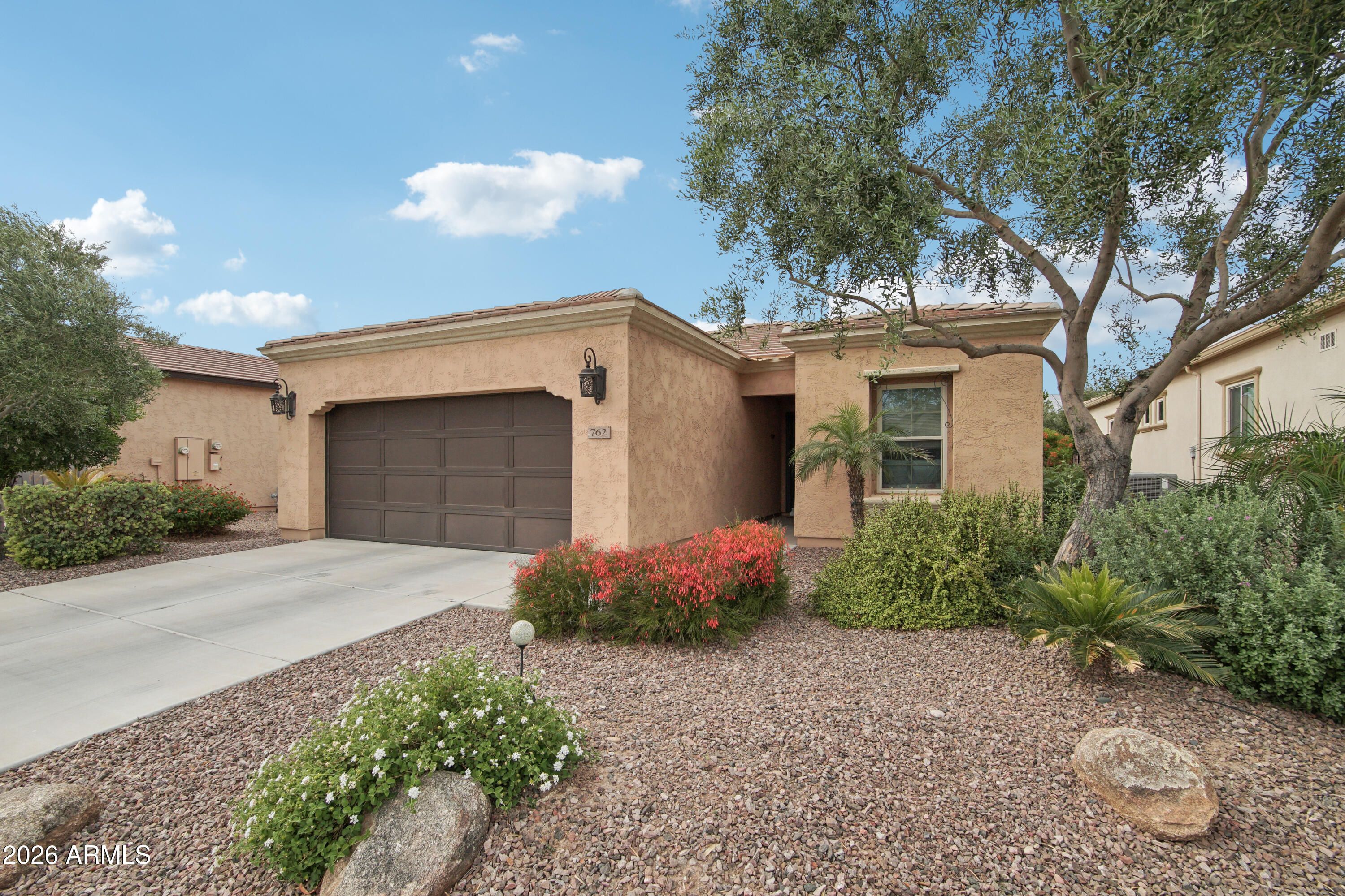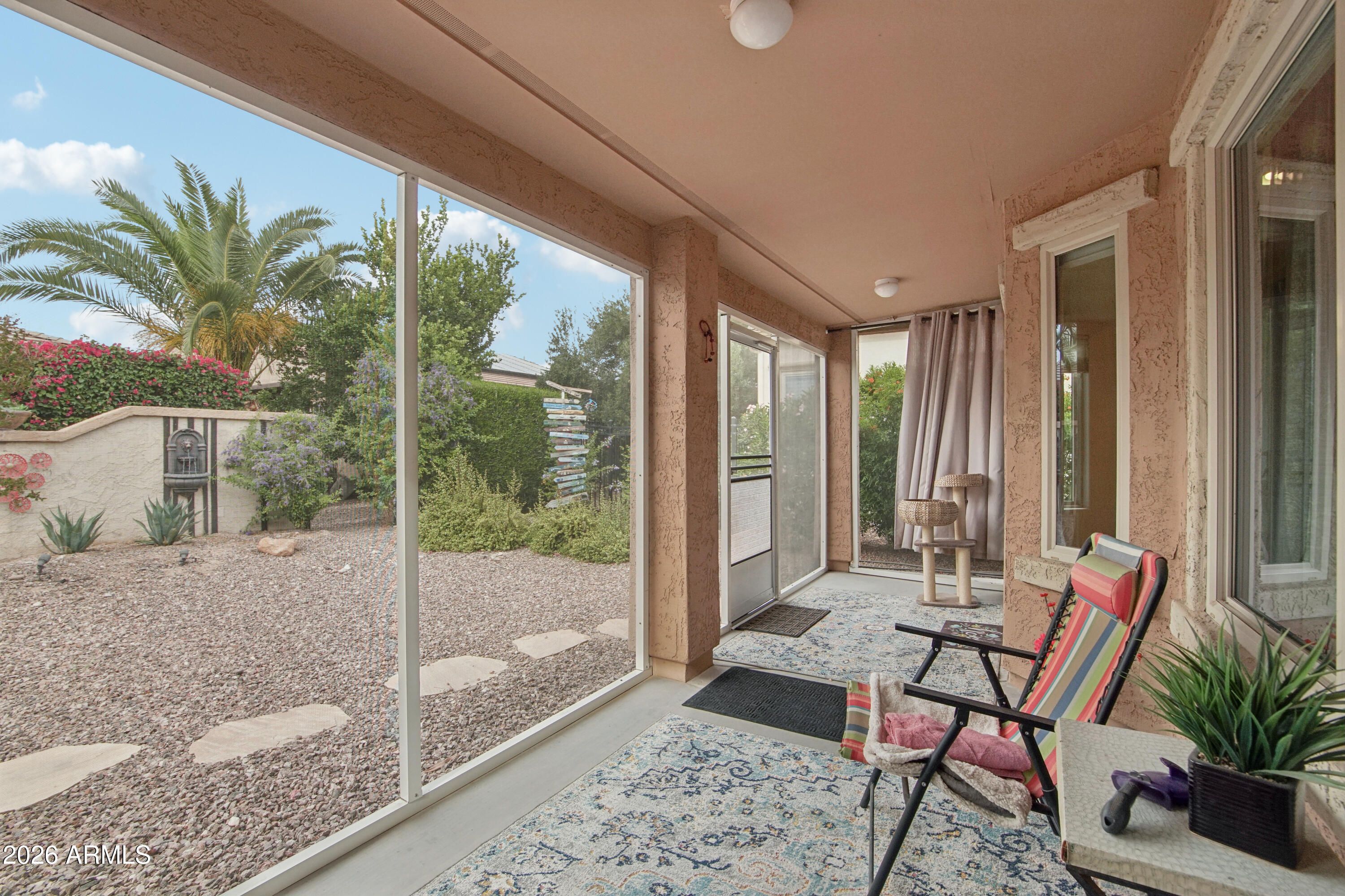 Welcome to this beautifully upgraded residence in the highly sought-after 55+ Encanterra community, where thoughtful improvements, energy efficiency, and quality craftsmanship come together in a well-designed single-level layout. From the moment you arrive, the attention to detail and extensive upgrades throughout the property create a true move-in ready opportunity. Inside, the home features an open-concept great room anchored by an electric fireplace and enhanced with sound-deadening double wall construction between the living area and primary suite. The kitchen has been extensively updated with KitchenAid stainless steel appliances, including a double oven range, dishwasher, and microwave, along with custom cabinetry, added upper cabinets, a custom copper backsplash, quartzite countertops, under-mount sinks, and upgraded lighting with custom copper fixtures and pendants. The layout flows seamlessly into the dining area, highlighted by a custom copper chandelier, creating a cohesive and elevated living space. The split primary suite offers a private retreat with a fully updated bath featuring quartzite countertops, under-mount sinks, new faucets, and a spacious walk-in closet. Additional interior improvements include new luxury vinyl flooring in the primary bedroom, updated toilets, cleaned air ducts, and recently serviced systems for peace of mind. Major system upgrades include a new HVAC system installed in 2022, a new furnace, water softener, and reverse osmosis system added in 2026, along with a prepaid solar energy system providing long-term efficiency and cost savings. The home also features new garage door springs, termite treatment, and a recent roof repair, reflecting ongoing care and maintenance. The outdoor space has been extensively enhanced with a two-zone automatic drip irrigation system, mature landscaping including a crepe myrtle tree, an orchid tree, a built partial wall for added privacy, and a backyard fountain feature. The patio has been extended and screened in, creating a comfortable and functional outdoor living area designed for year-round enjoyment. Located within the gated Encanterra community, residents enjoy access to a resort-style lifestyle with golf, multiple pools, fitness facilities, dining, walking paths, and a wide range of recreational amenities, all within a beautifully maintained master-planned setting in Queen Creek.