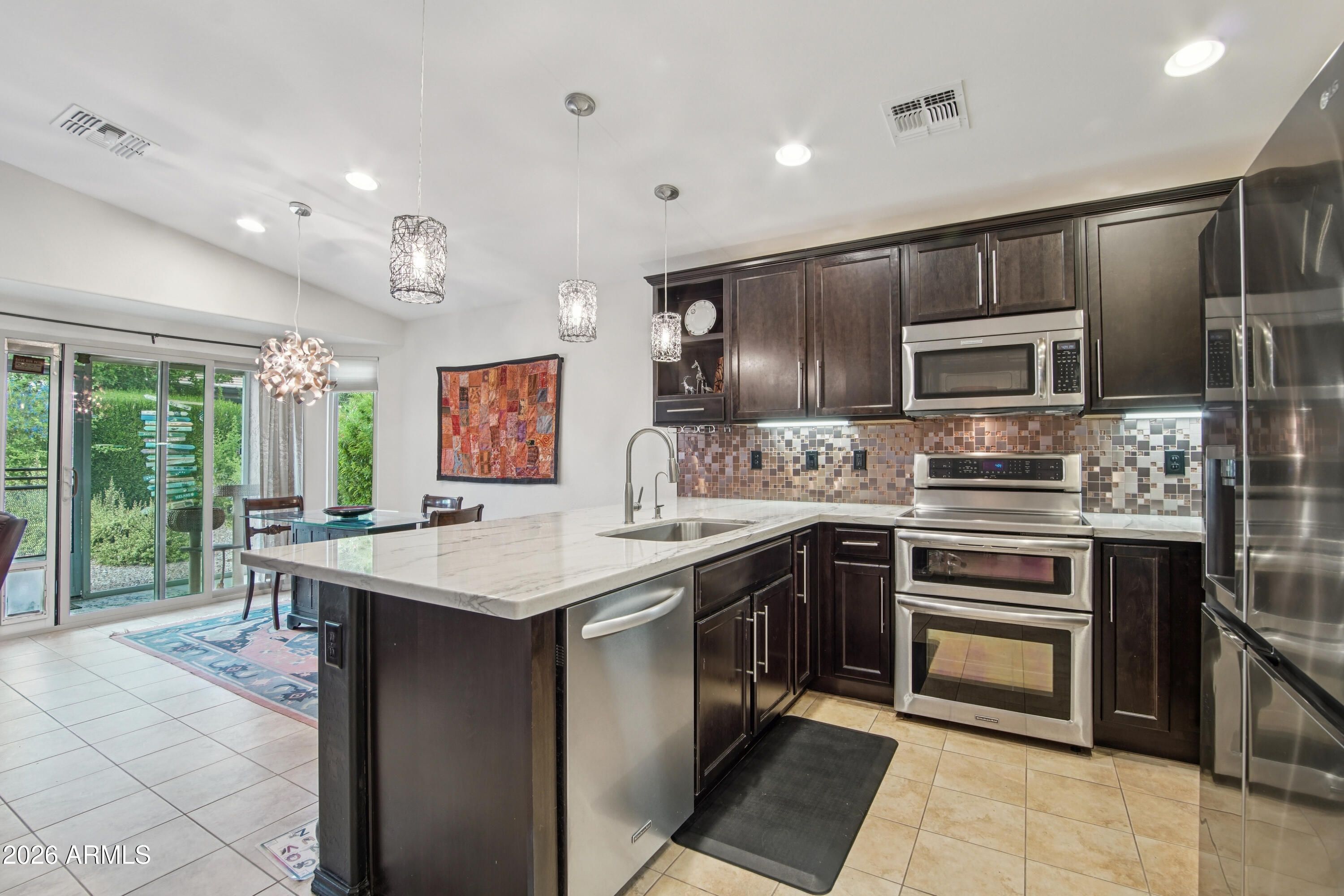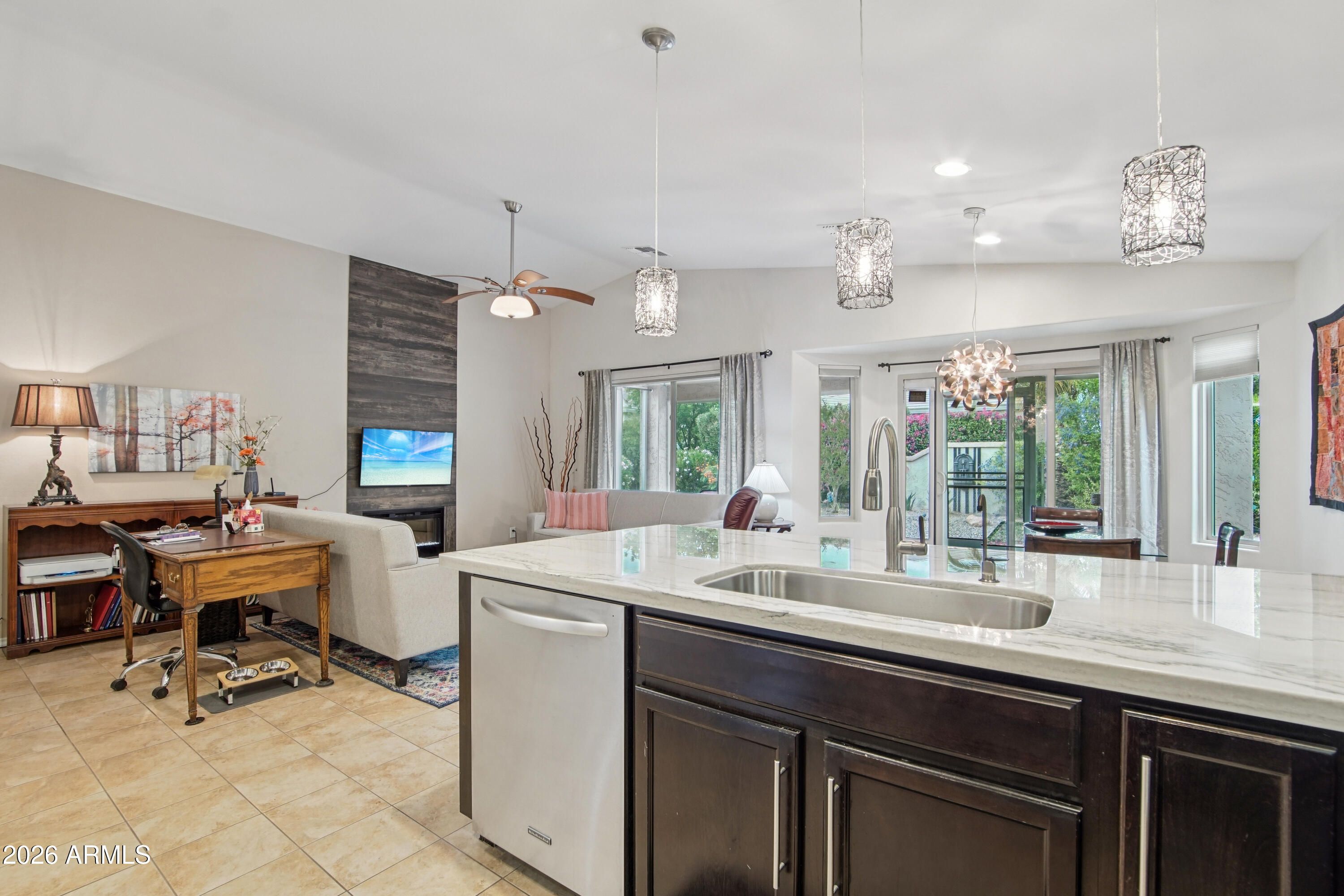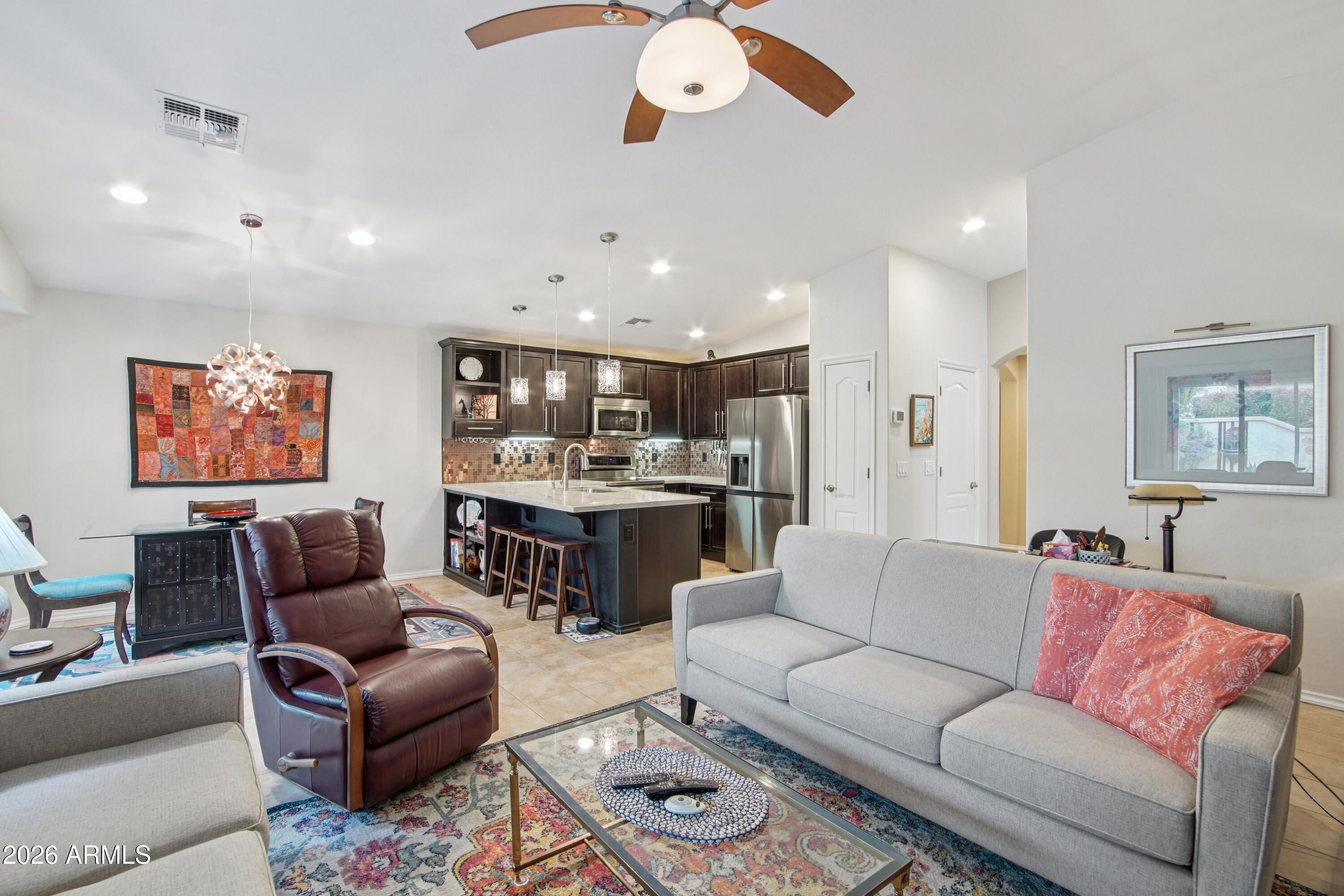 Welcome to this beautifully upgraded residence in the highly sought-after 55+ Encanterra community, where thoughtful improvements, energy efficiency, and quality craftsmanship come together in a well-designed single-level layout. From the moment you arrive, the attention to detail and extensive upgrades throughout the property create a true move-in ready opportunity. Inside, the home features an open-concept great room anchored by an electric fireplace and enhanced with sound-deadening double wall construction between the living area and primary suite. The kitchen has been extensively updated with KitchenAid stainless steel appliances, including a double oven range, dishwasher, and microwave, along with custom cabinetry, added upper cabinets, a custom copper backsplash, quartzite countertops, under-mount sinks, and upgraded lighting with custom copper fixtures and pendants. The layout flows seamlessly into the dining area, highlighted by a custom copper chandelier, creating a cohesive and elevated living space. The split primary suite offers a private retreat with a fully updated bath featuring quartzite countertops, under-mount sinks, new faucets, and a spacious walk-in closet. Additional interior improvements include new luxury vinyl flooring in the primary bedroom, updated toilets, cleaned air ducts, and recently serviced systems for peace of mind. Major system upgrades include a new HVAC system installed in 2022, a new furnace, water softener, and reverse osmosis system added in 2026, along with a prepaid solar energy system providing long-term efficiency and cost savings. The home also features new garage door springs, termite treatment, and a recent roof repair, reflecting ongoing care and maintenance. The outdoor space has been extensively enhanced with a two-zone automatic drip irrigation system, mature landscaping including a crepe myrtle tree, an orchid tree, a built partial wall for added privacy, and a backyard fountain feature. The patio has been extended and screened in, creating a comfortable and functional outdoor living area designed for year-round enjoyment. Located within the gated Encanterra community, residents enjoy access to a resort-style lifestyle with golf, multiple pools, fitness facilities, dining, walking paths, and a wide range of recreational amenities, all within a beautifully maintained master-planned setting in Queen Creek.