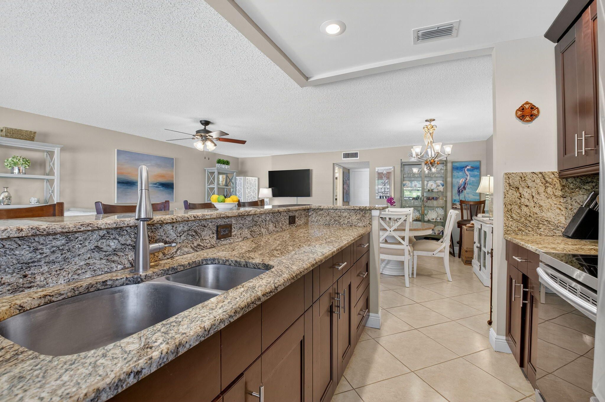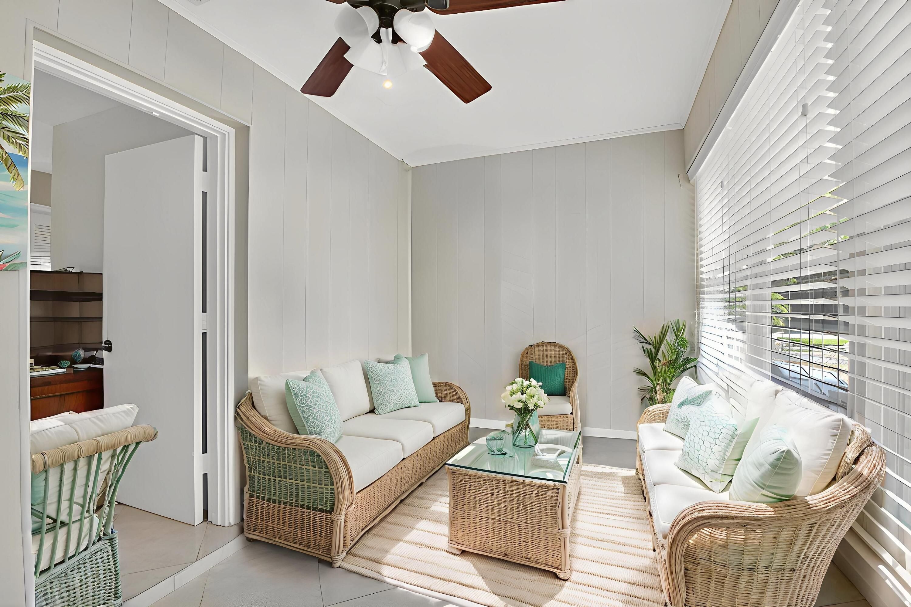 This remodeled Villa offers approximately 912 square feet of living space with 1BR/1.5BA. The property features a newer water heater installed in 2025 and newer windows, both of which enhance energy efficiency. The tile flooring throughout creates a clean, low-maintenance aesthetic, while the open-concept kitchen features granite countertops and soft-close cabinets, offering an inviting, functional space for cooking and entertaining. The property is situated in a 55+ community that offers a serene, welcoming environment for residents. The spacious, bright interior creates a comfortable, airy ambiance, and the recent installation of a new front patio enhances the home's curb appeal.
