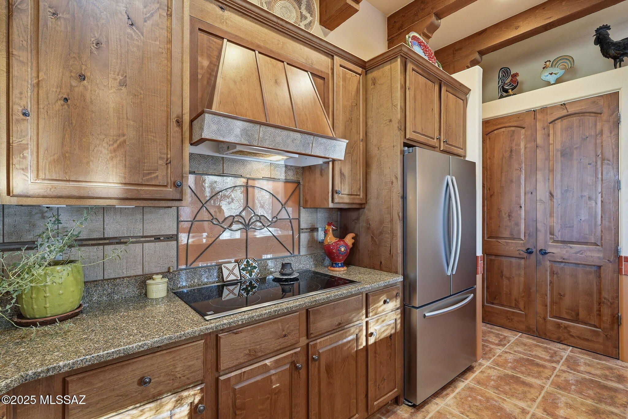 Peaceful Custom Home on Over an Acre in the Gated Alamos Estates!! Experience the beauty of desert living located in a gated community. The moment you walk in, you're greeted by tall ceilings, exposed wood beams, and a kiva fireplace that creates a sense of comfort and Southwest charm. The dining room has wood beams and rope pillars where it gives it the perfect touch of southern style. The kitchen is beautiful, featuring a custom glass backsplash, detailed hood design, and a large mesquite island with a wine fridge where it makes a perfect gathering space. With a guest bedroom that includes a full bath, family and friends will always feel welcome.