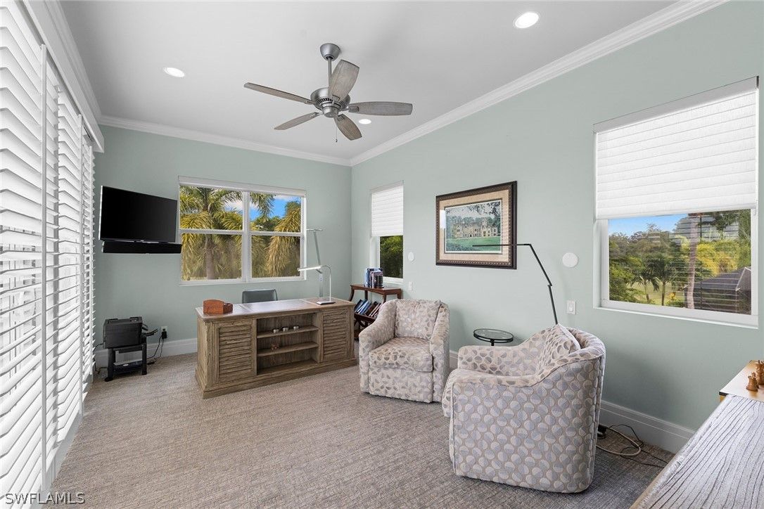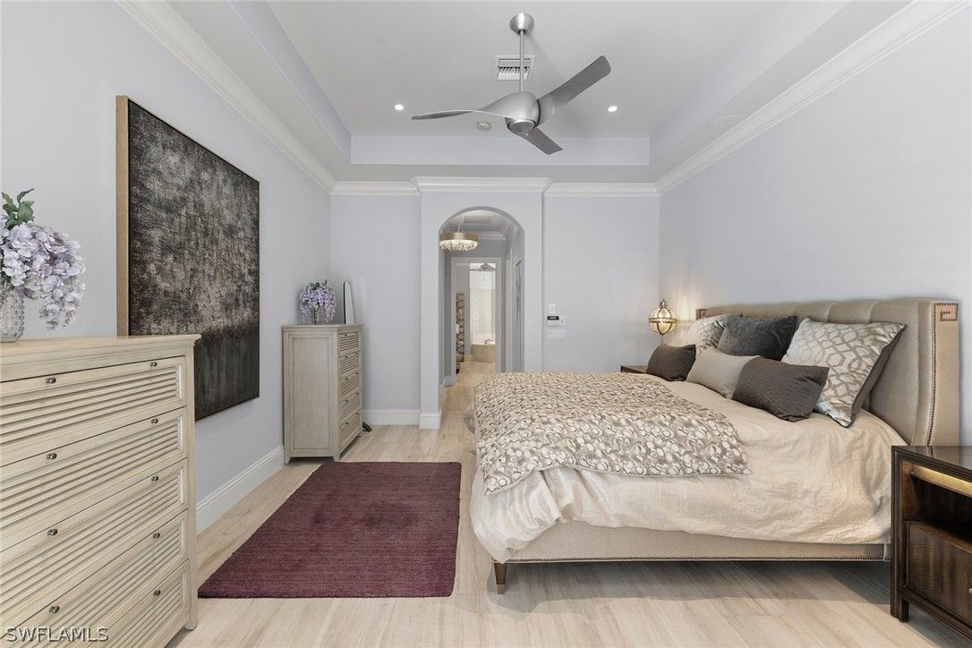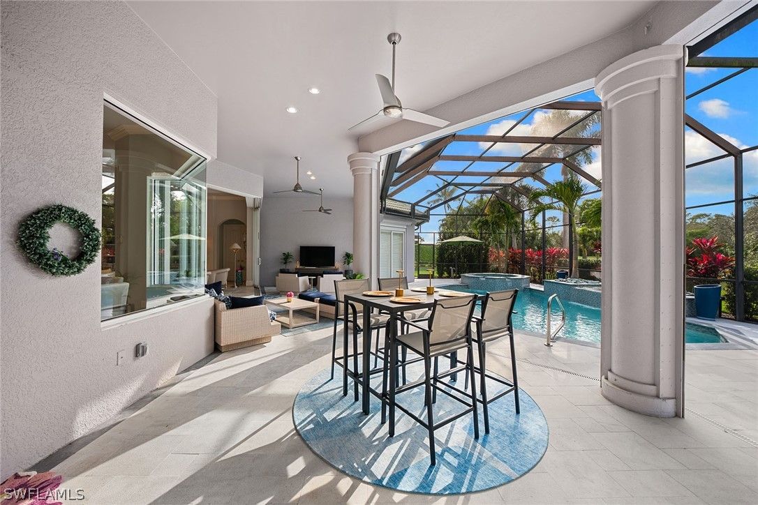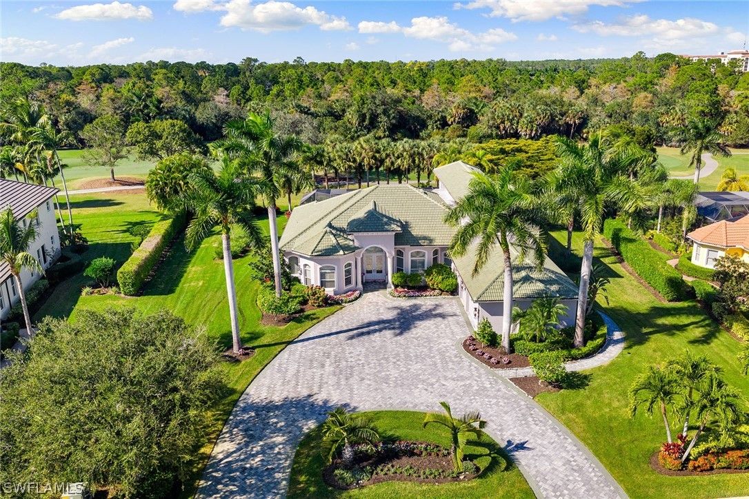 Enjoy elegance at its finest in this custom-built estate home on a quiet cul-de-sac within The Classics neighborhood, a gated, 24-hour security-protected community, in Lely Resort. On one of the largest lots in the neighborhood, this home features a grand circular driveway with abundant parking for guests. French beveled glass doors invite entry into a light-filled open floor plan with soaring 14-foot ceilings, custom crown molding, chandeliers, and plantation shutters with Sunburst arches that create an atmosphere of timeless sophistication. The ambiance of the bright Florida Coastal design (2015 complete house renovation) blends luxury and livability with views of the lanai, pool, palm trees and 17th Fairway of The Classics Golf Club. The kitchen showcases quartz waterfall counters, glass-tile backsplash, custom cabinetry, Wolf dual-range stove/oven, Sub-Zero refrigerator, Bosch dishwasher, two built-in pantries, a Butler’s Nook, and new Ca’Lefort wine cooler. A versatile upstairs, enhanced throughout with new carpeting, introduces a double owner's suite including a fourth bedroom (used as an office), a full bath, walk-in closet, spacious sitting/game room and private balcony. Two first-floor guest en suites include built-in cabinetry with custom storage, while the primary suite serves as a retreat, featuring crown molding, a soaking tub, a large shower with body jets and a custom Carrera-tile double vanity. The screened lanai offers a private sanctuary featuring a gas-heated pool and spa, lush landscaping, and multiple seating areas ideal for quiet relaxation or entertaining (with 15 in-ceiling speakers ready for surround sound and multi-room zone audio). Upgrades in 2020 include a new roof, new driveway and walkway pavers, new lanai deck, and new pool and spa resurfacing. Membership opportunities abound, with no waitlist at The Classics Golf Club, which offers access to three championship golf courses (two public, one private) and optional Players Club membership offering tennis, bocce, dining, wellness center, spa and three resort-style pools. This exceptional estate harmonizes luxury, lifestyle and location, a rare opportunity to experience the best of Lely Resort and Naples living.