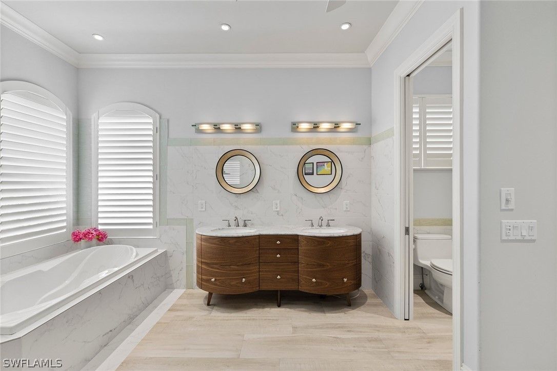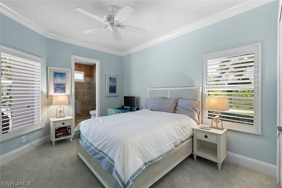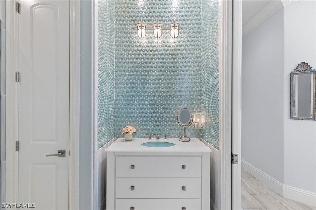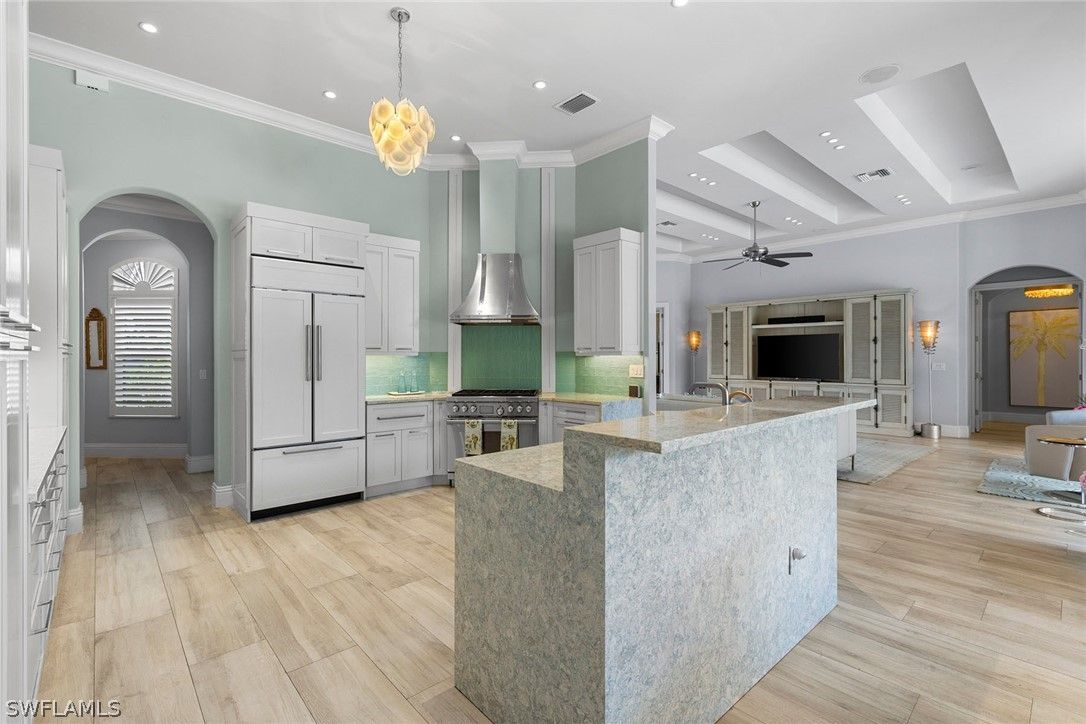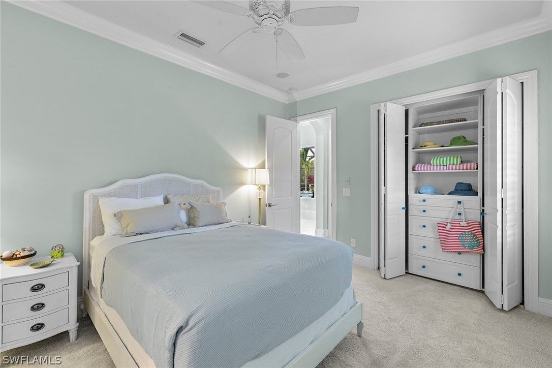 Enjoy elegance at its finest in this custom-built estate home on a quiet cul-de-sac within The Classics neighborhood, a gated, 24-hour security-protected community, in Lely Resort. On one of the largest lots in the neighborhood, this home features a grand circular driveway with abundant parking for guests. French beveled glass doors invite entry into a light-filled open floor plan with soaring 14-foot ceilings, custom crown molding, chandeliers, and plantation shutters with Sunburst arches that create an atmosphere of timeless sophistication. The ambiance of the bright Florida Coastal design (2015 complete house renovation) blends luxury and livability with views of the lanai, pool, palm trees and 17th Fairway of The Classics Golf Club. The kitchen showcases quartz waterfall counters, glass-tile backsplash, custom cabinetry, Wolf dual-range stove/oven, Sub-Zero refrigerator, Bosch dishwasher, two built-in pantries, a Butler’s Nook, and new Ca’Lefort wine cooler. A versatile upstairs, enhanced throughout with new carpeting, introduces a double owner's suite including a fourth bedroom (used as an office), a full bath, walk-in closet, spacious sitting/game room and private balcony. Two first-floor guest en suites include built-in cabinetry with custom storage, while the primary suite serves as a retreat, featuring crown molding, a soaking tub, a large shower with body jets and a custom Carrera-tile double vanity. The screened lanai offers a private sanctuary featuring a gas-heated pool and spa, lush landscaping, and multiple seating areas ideal for quiet relaxation or entertaining (with 15 in-ceiling speakers ready for surround sound and multi-room zone audio). Upgrades in 2020 include a new roof, new driveway and walkway pavers, new lanai deck, and new pool and spa resurfacing. Membership opportunities abound, with no waitlist at The Classics Golf Club, which offers access to three championship golf courses (two public, one private) and optional Players Club membership offering tennis, bocce, dining, wellness center, spa and three resort-style pools. This exceptional estate harmonizes luxury, lifestyle and location, a rare opportunity to experience the best of Lely Resort and Naples living.