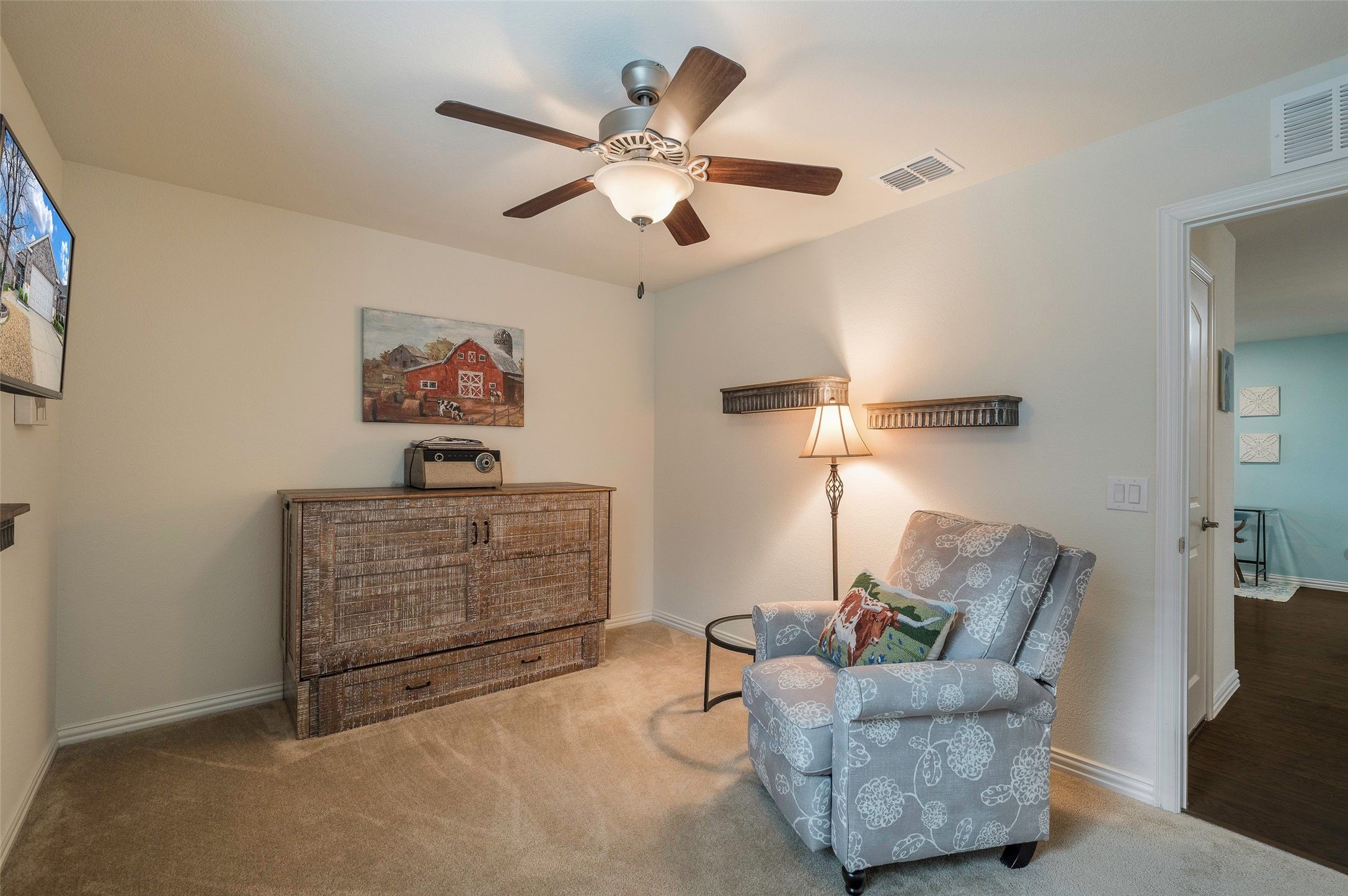 Start each day with lake views and peaceful walks along the trail just beyond your backyard, then enjoy the ease of resort-style living in this vibrant 55+ community. Life here is about choice-morning fitness classes, afternoons by the pool, or a friendly game of tennis, pickleball, or bocce. Evenings unfold on your patio with motorized shades, or gathering with neighbors at the coffee bar, food truck park, or open-air pavilion. Sunlight fills the hardwood-floored interior, where the Living Room opens to a bright sunroom. The eat-in kitchen anchors daily life with a large island, breakfast bar, granite countertops, pendant lighting, stainless steel Whirlpool appliances, gas range, and double-door pantry- perfect for casual meals or entertaining. The sun room overlooks the lake, creating a calm retreat at day’s end.