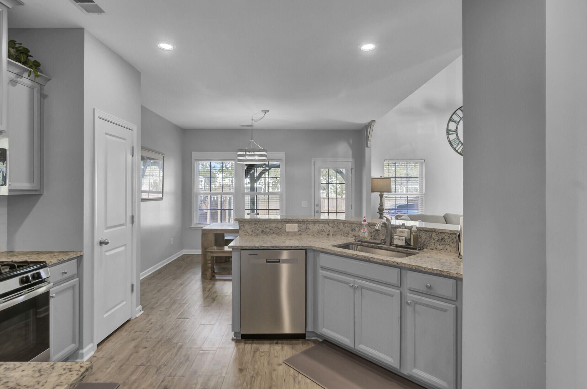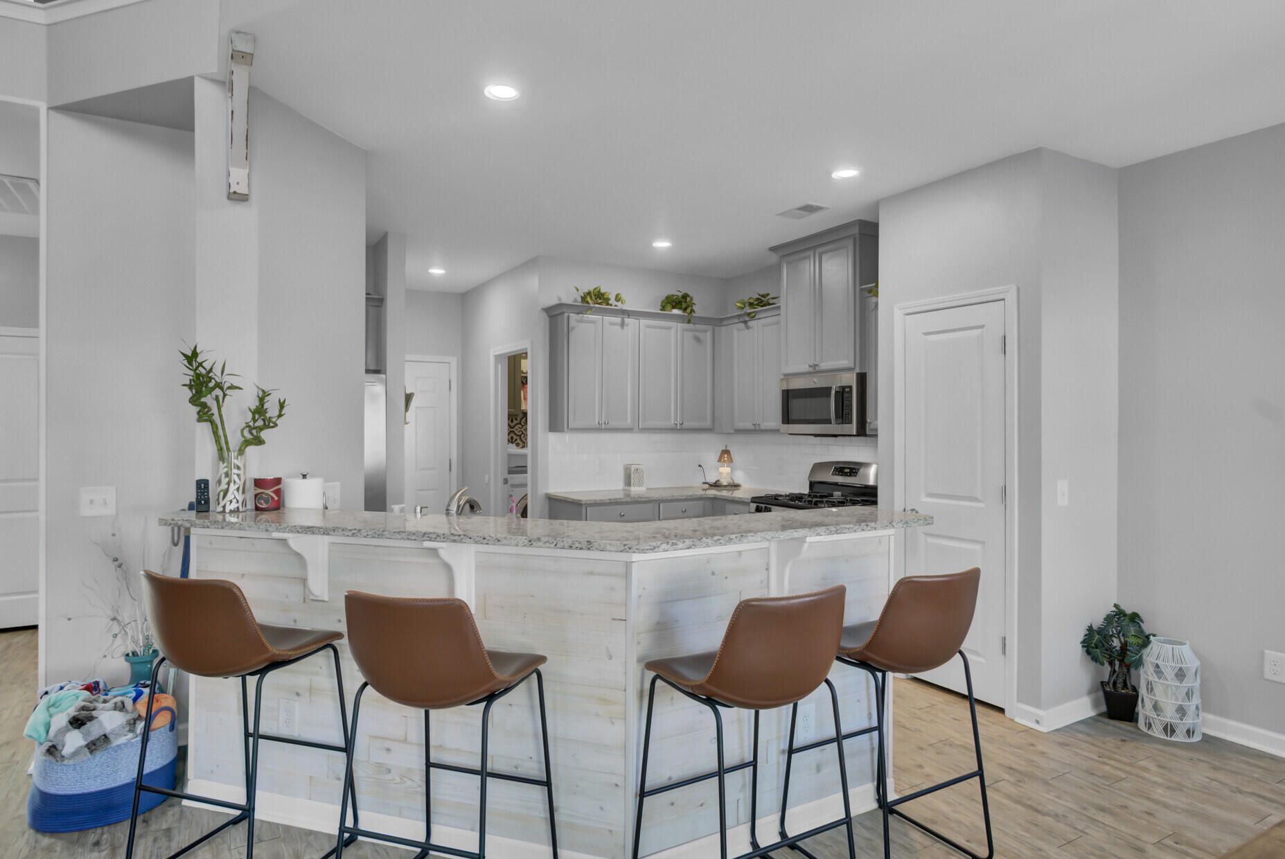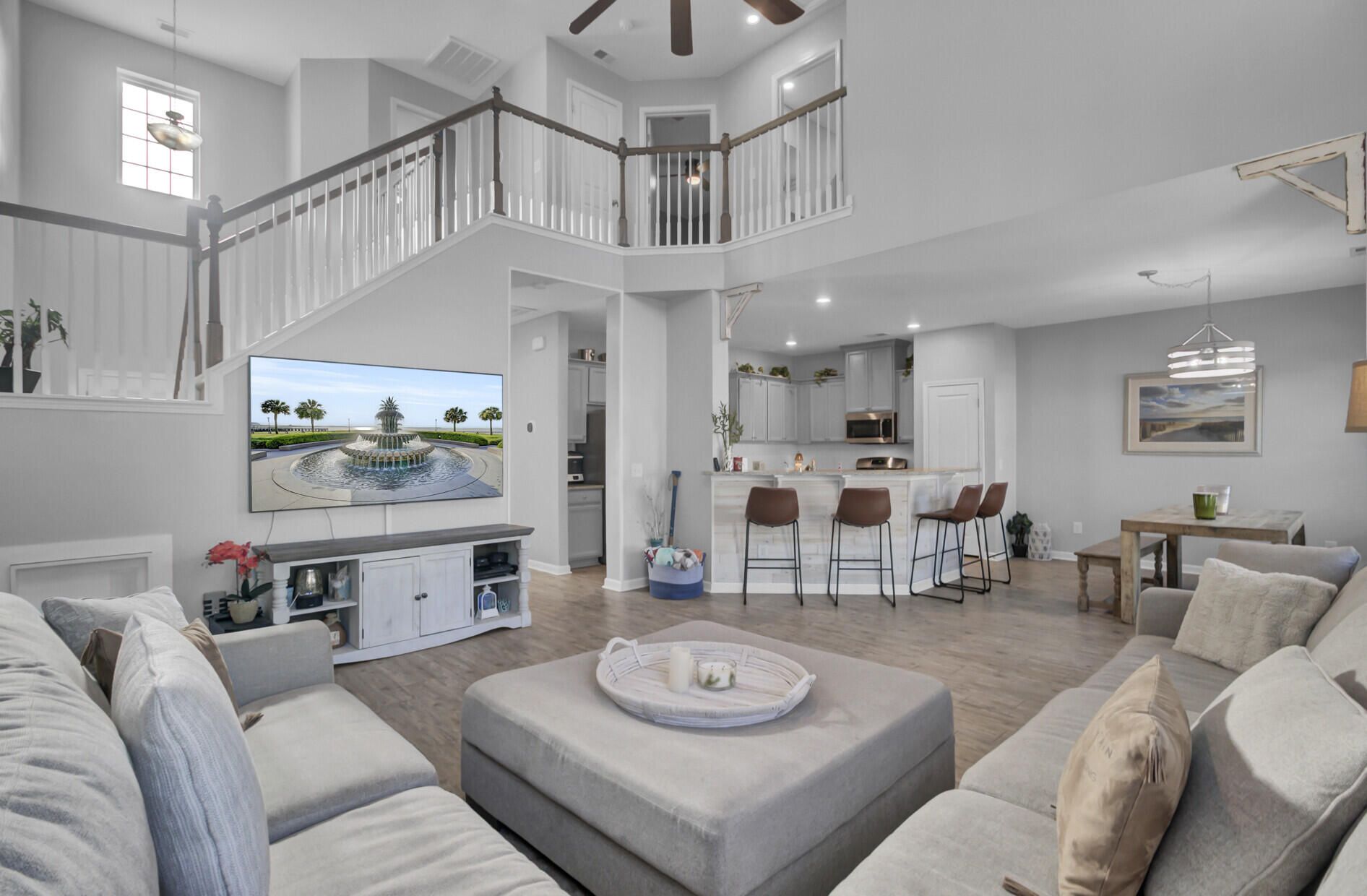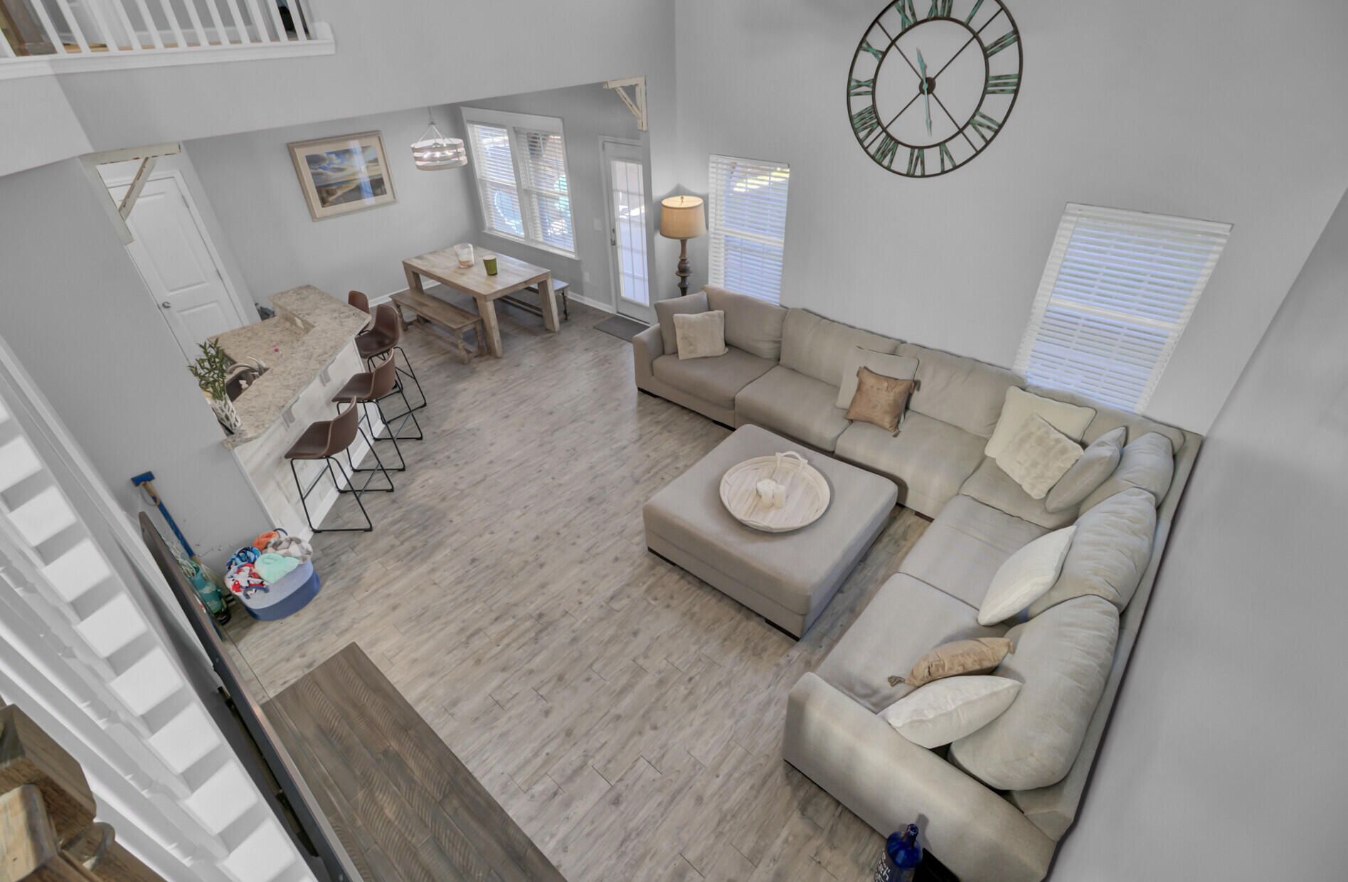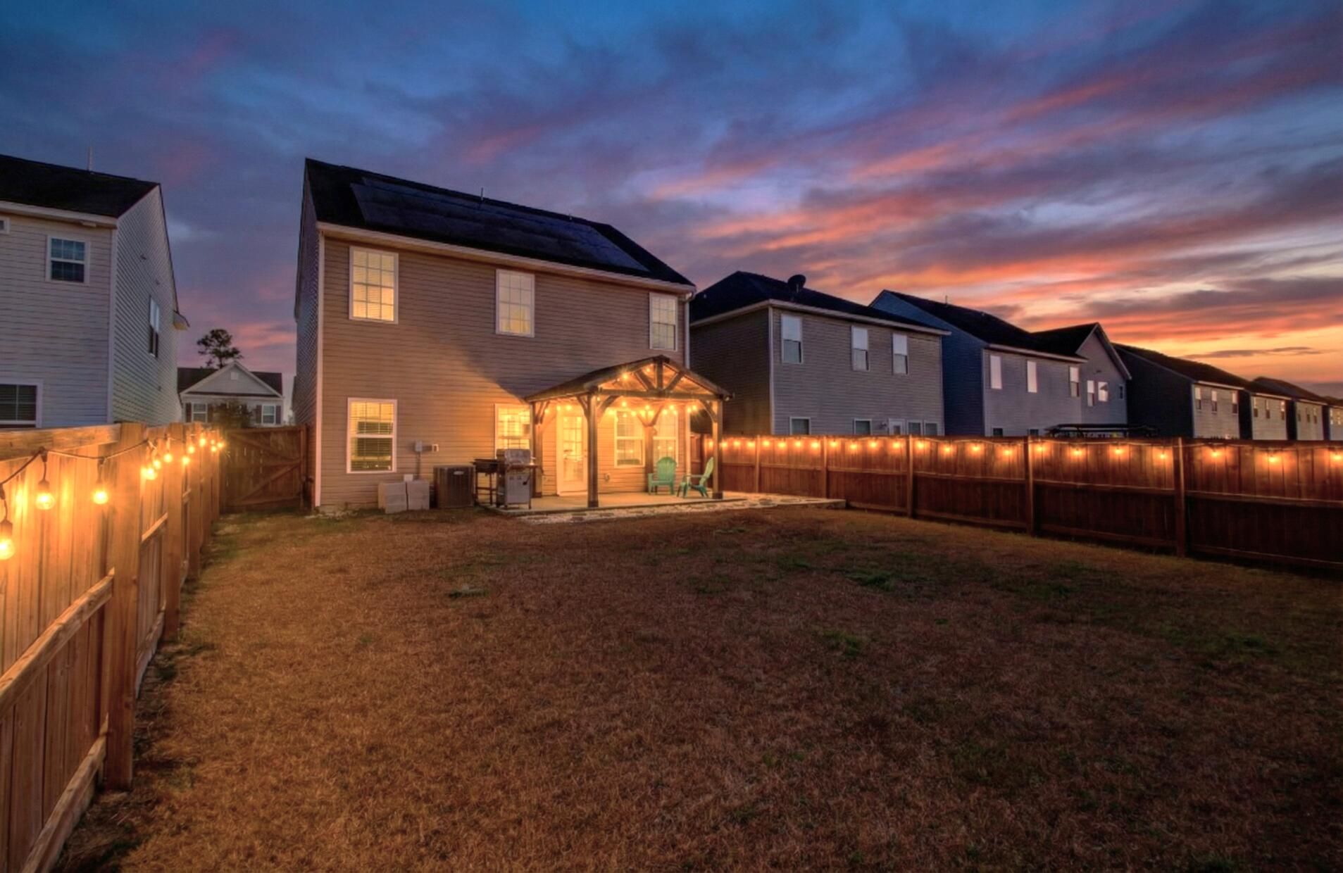 Welcome home to this beautifully maintained 3-bedroom, 2.5-bath residence in Cane Bay Plantation, offering an open, airy layout, stylish upgrades, and energy-efficient features.Step into the impressive two-story family room, filled with abundant natural light and highlighted by a stunning open staircase with a stained oak handrail and crisp white pickets. The open floor plan flows seamlessly into the dining area, enhanced by warm luxury vinyl plank flooring and gorgeous shiplap accents throughout the main living spaces, adding charm and character.The kitchen is ideal for entertaining, opening to both the family room and dining area. It features ample cabinet and counter space, granite countertops, stainless steel appliances, a pantry, and a convenient breakfast bar.The primary suite offers a relaxing retreat with a tray ceiling, dual closets, a double vanity, a large soaking tub, and a separate shower. Two equally sized secondary bedrooms share access to the second full bath, providing comfort and functionality for family or guests. Step outside to enjoy the extended backyard patio, partially covered by a pergola, offering the perfect space for outdoor dining and relaxation. A fully fenced backyard completes this inviting outdoor area. The fully finished two-car garage includes a bar area, ideal for entertaining or additional flex space. An added bonus is the fully paid-off solar panel system, delivering energy efficiency and long-term savings. Residents of Cane Bay Plantation enjoy outstanding amenities including community pools, miles of walking and jogging trails, and a dog park. Conveniently located near everyday conveniences, this home is just a quick golf cart ride to schools, restaurants, and shopping. This move-in-ready home blends comfort, style, and sustainabilityschedule your showing today! Use preferred lender to buy this home and receive an incentive towards your closing costs!