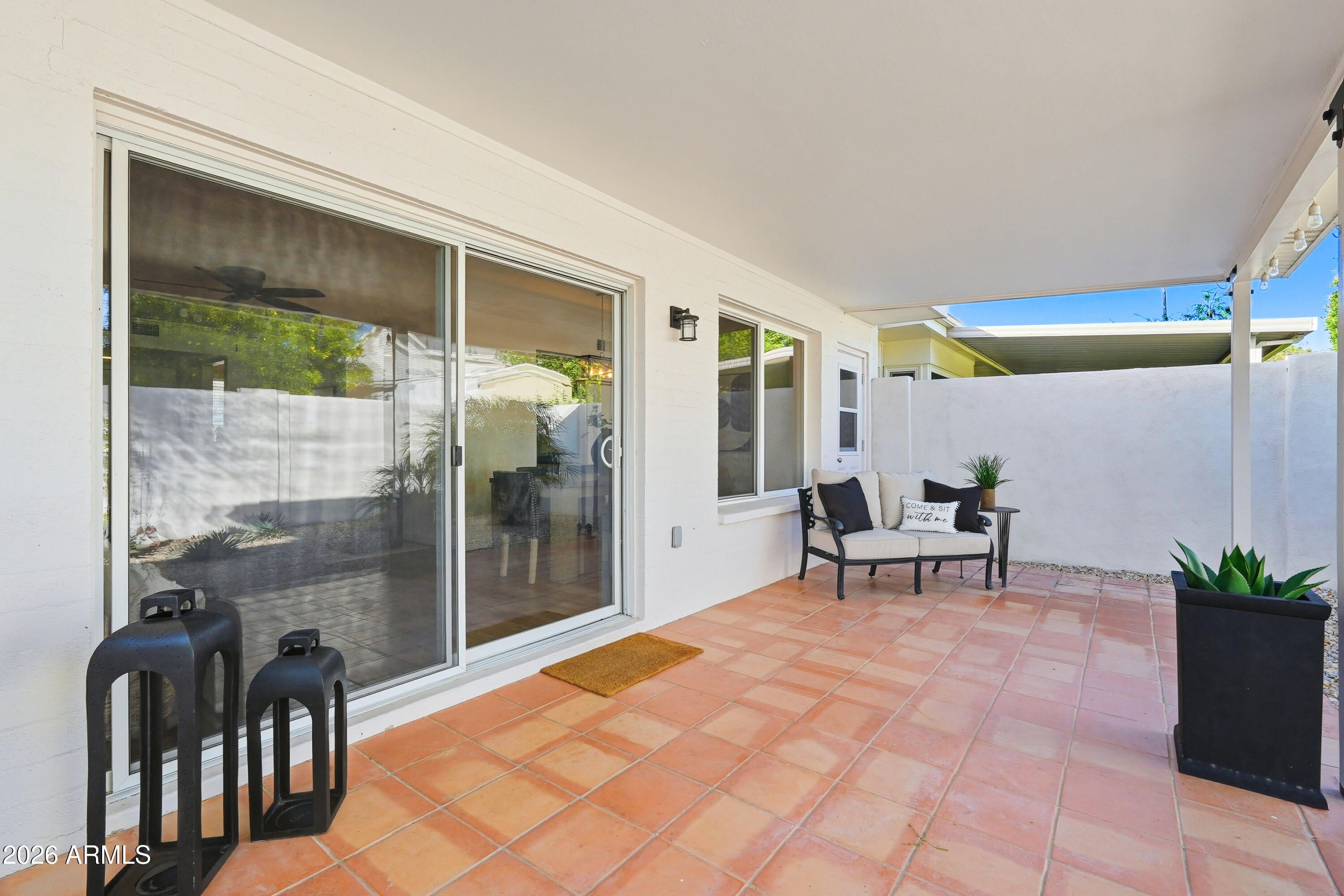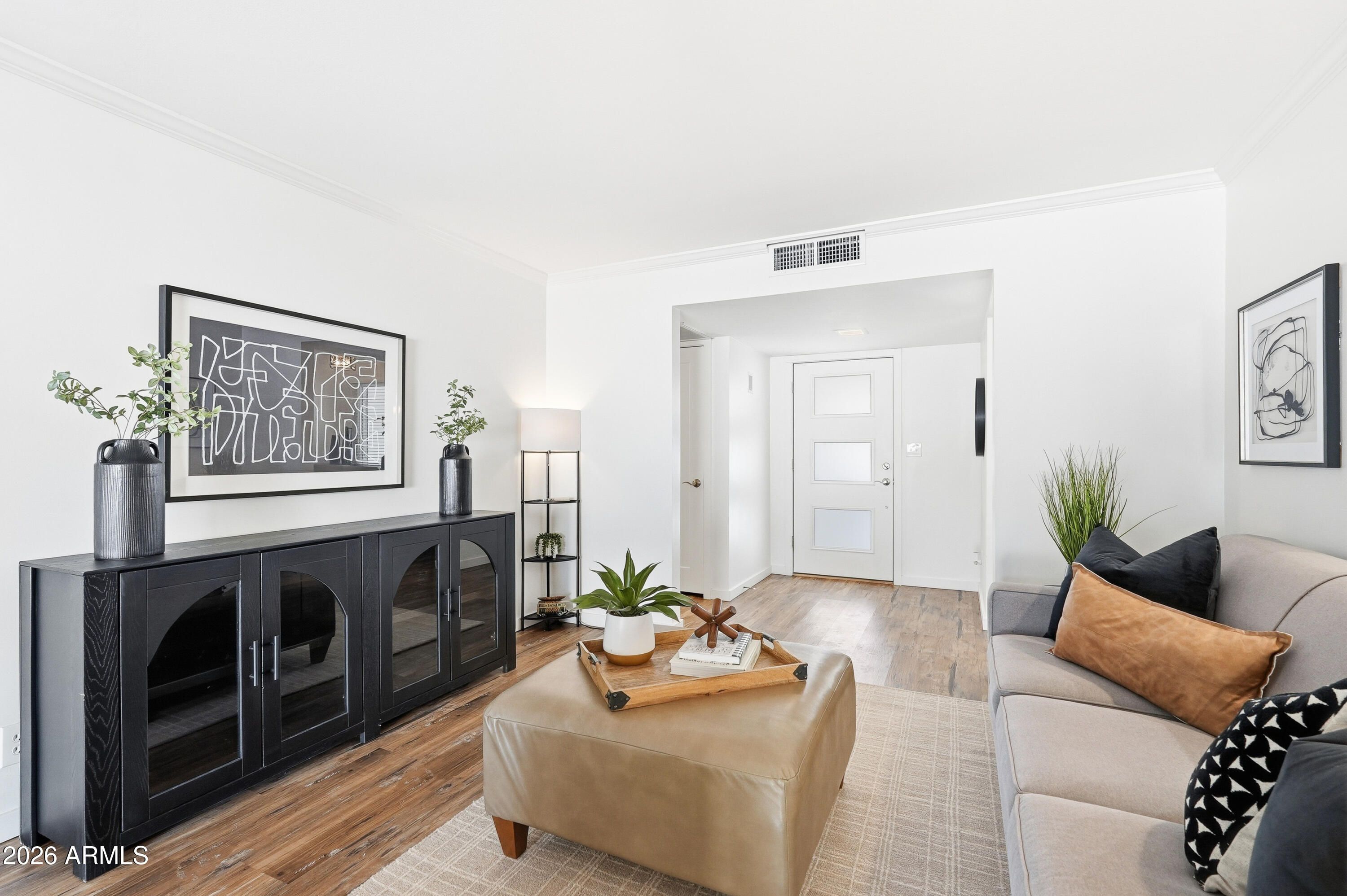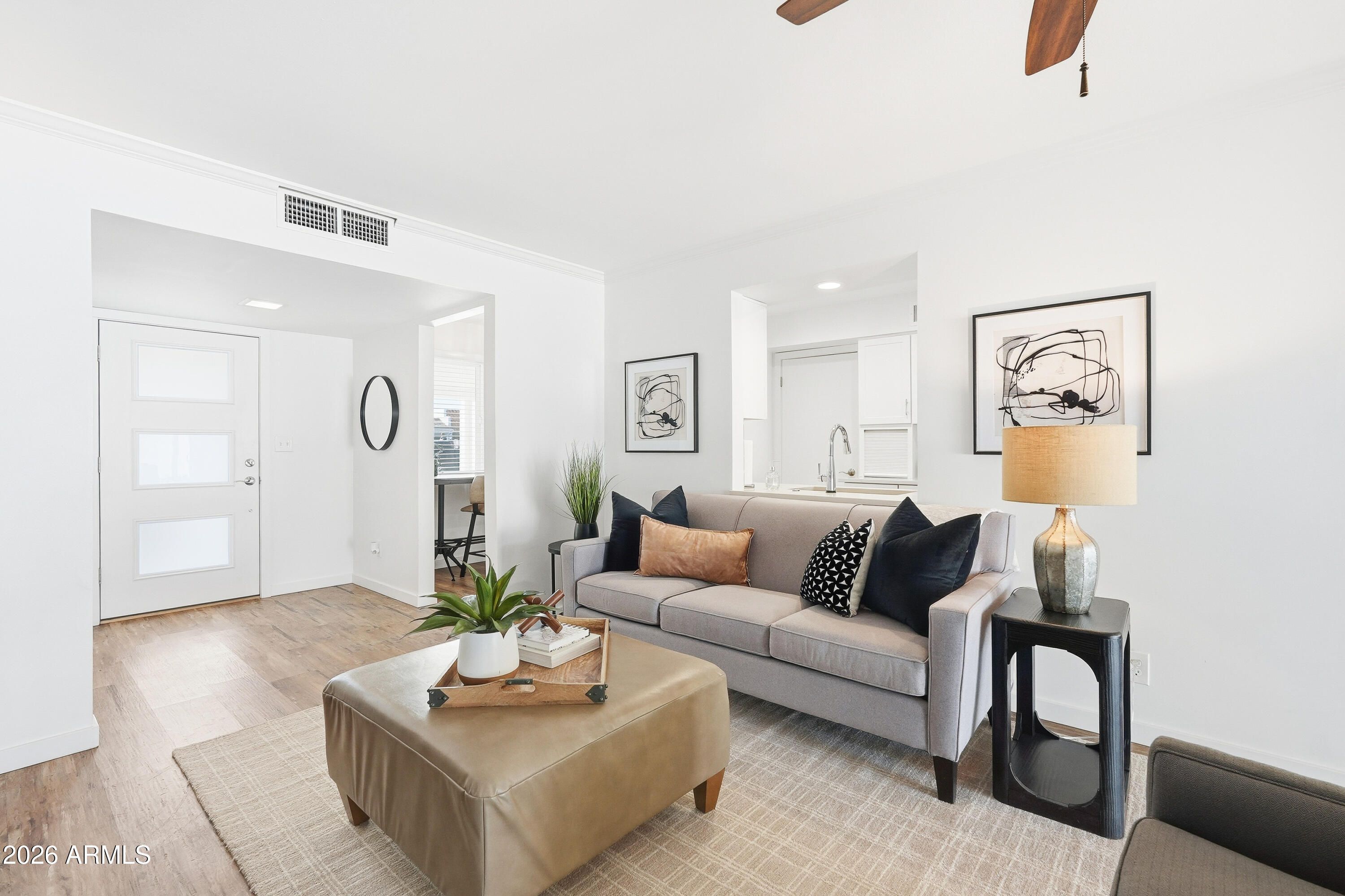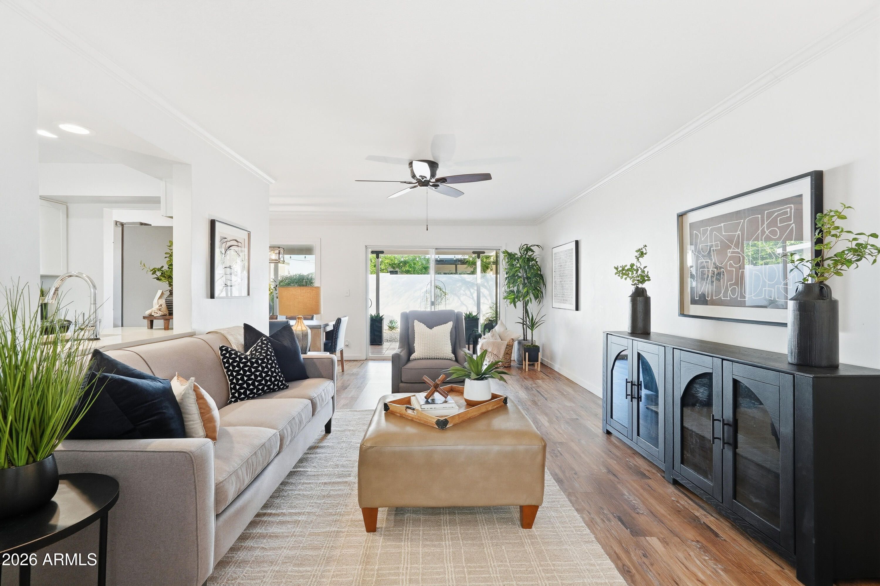 Remodeled 2-bedroom, 2-bath townhome located in the highly sought-after Villa Monterey, a Historic Preservation Community showcasing iconic architecture and exuding charm! This thoughtfully updated residence welcomes you with a beautiful living room featuring wood-look flooring and a neutral, timeless palette that complements any style of furnishings. The galley kitchen offers crisp white cabinetry, stainless steel appliances, and ample prep space—perfect for everyday living and entertaining. Both bedrooms are generously sized and paired with beautifully updated bathrooms featuring modern vanities and finishes. Step outside to your private, low-maintenance landscaped yard, an ideal spot to relax. Heated community pool and spa. Short walk to Old Town Scottsdale, where you can enjoy world-class dining, shopping, galleries, and entertainment. A rare opportunity to own a move-in-ready home in one of Scottsdale's most beloved historic and walkable communities.