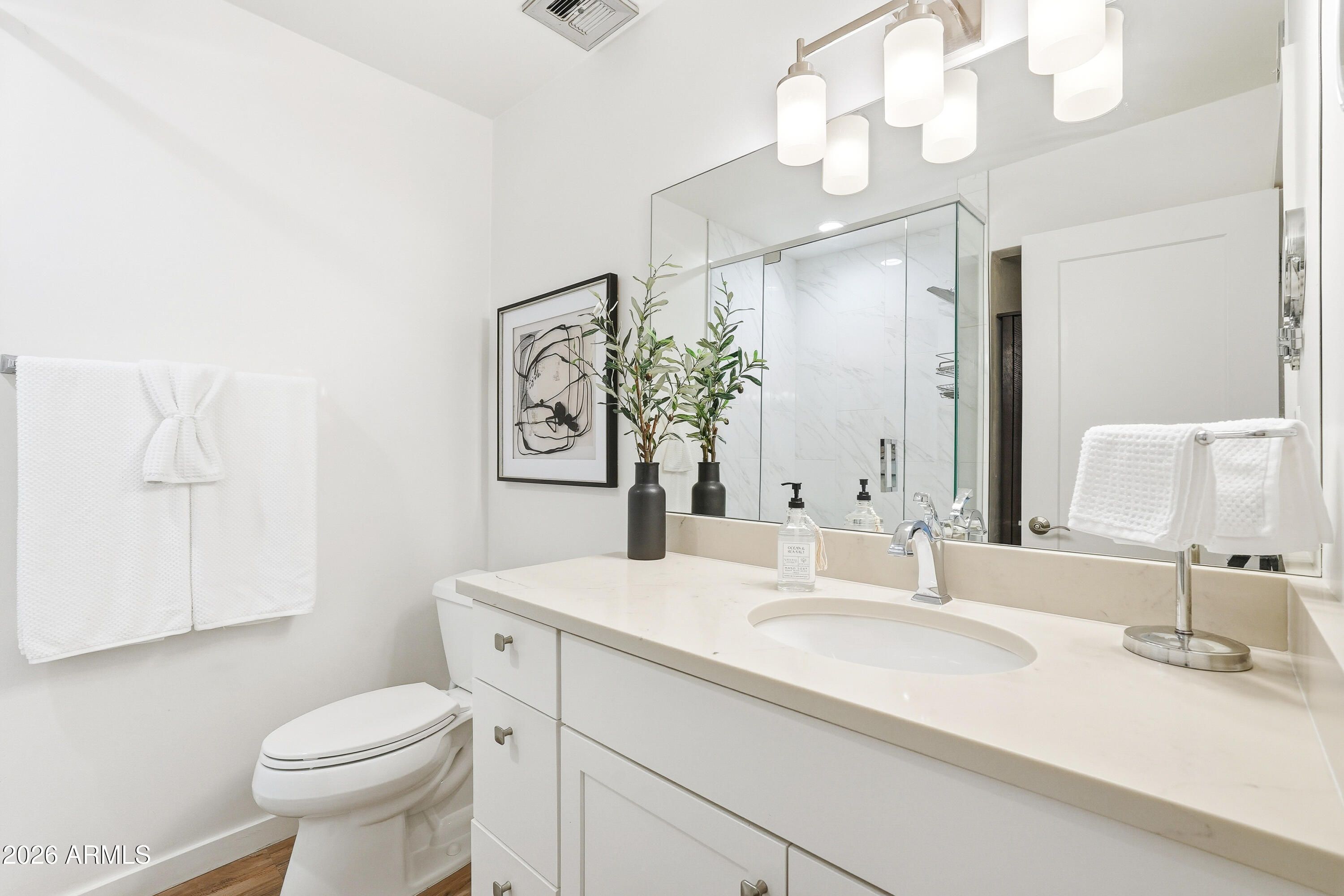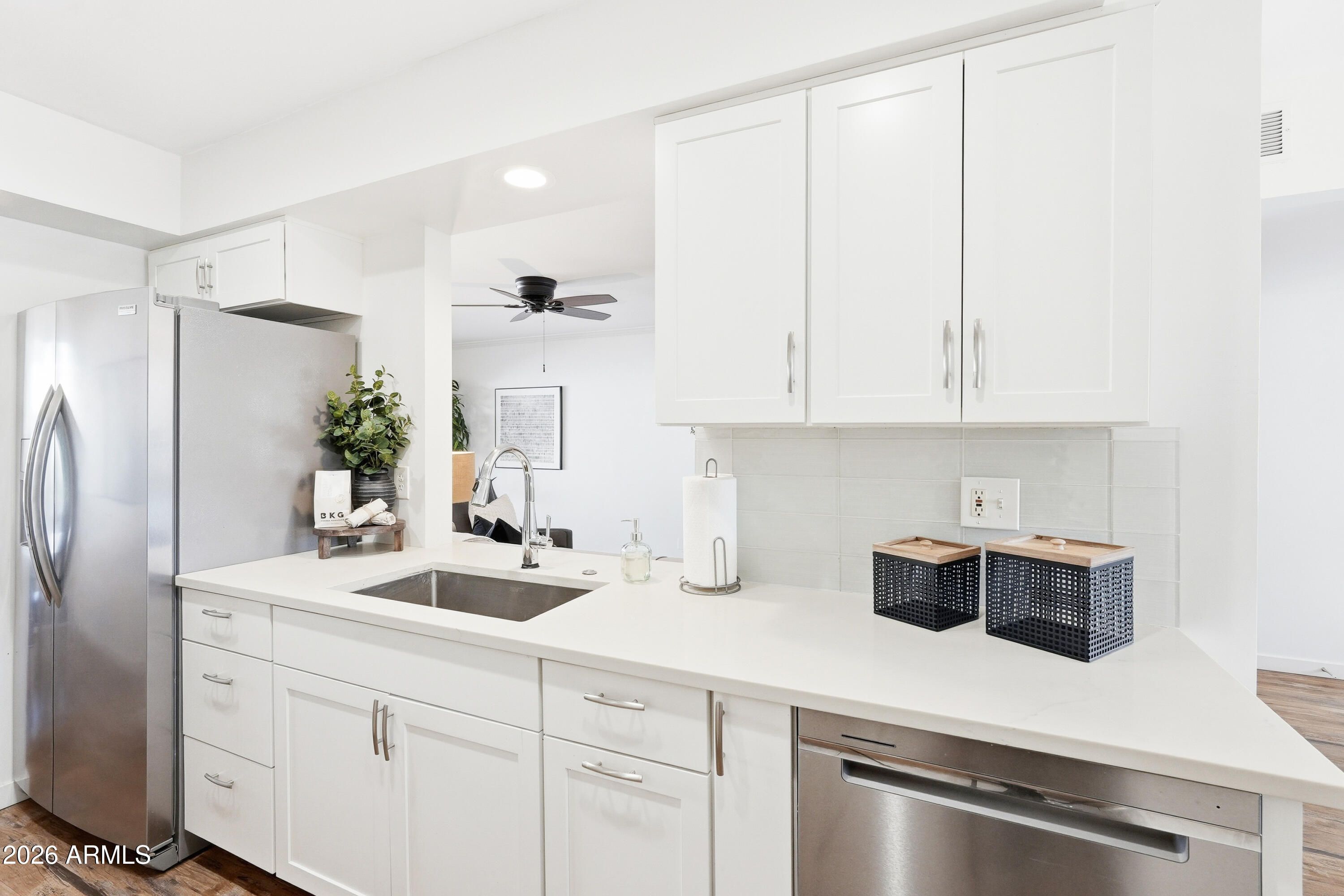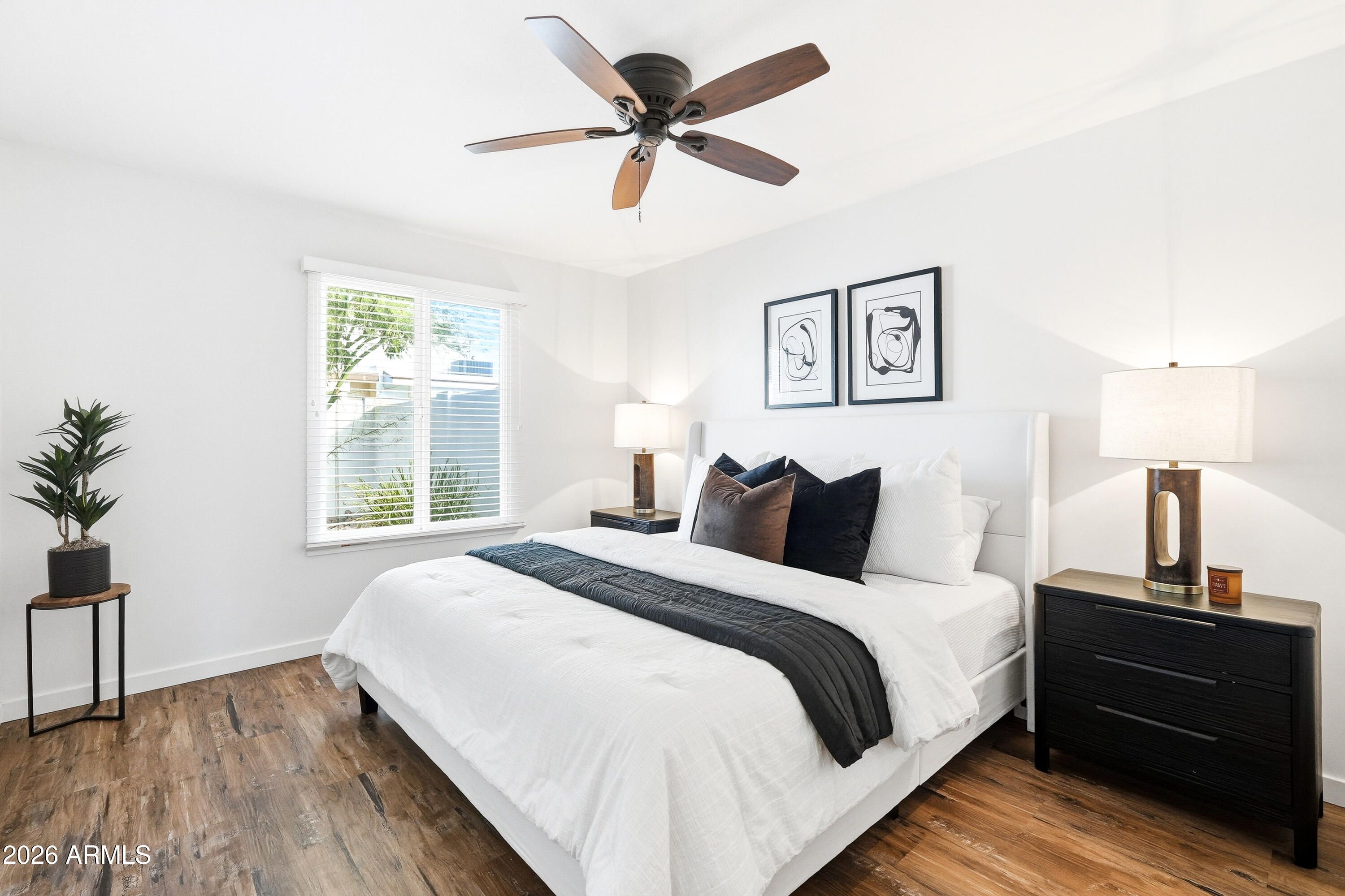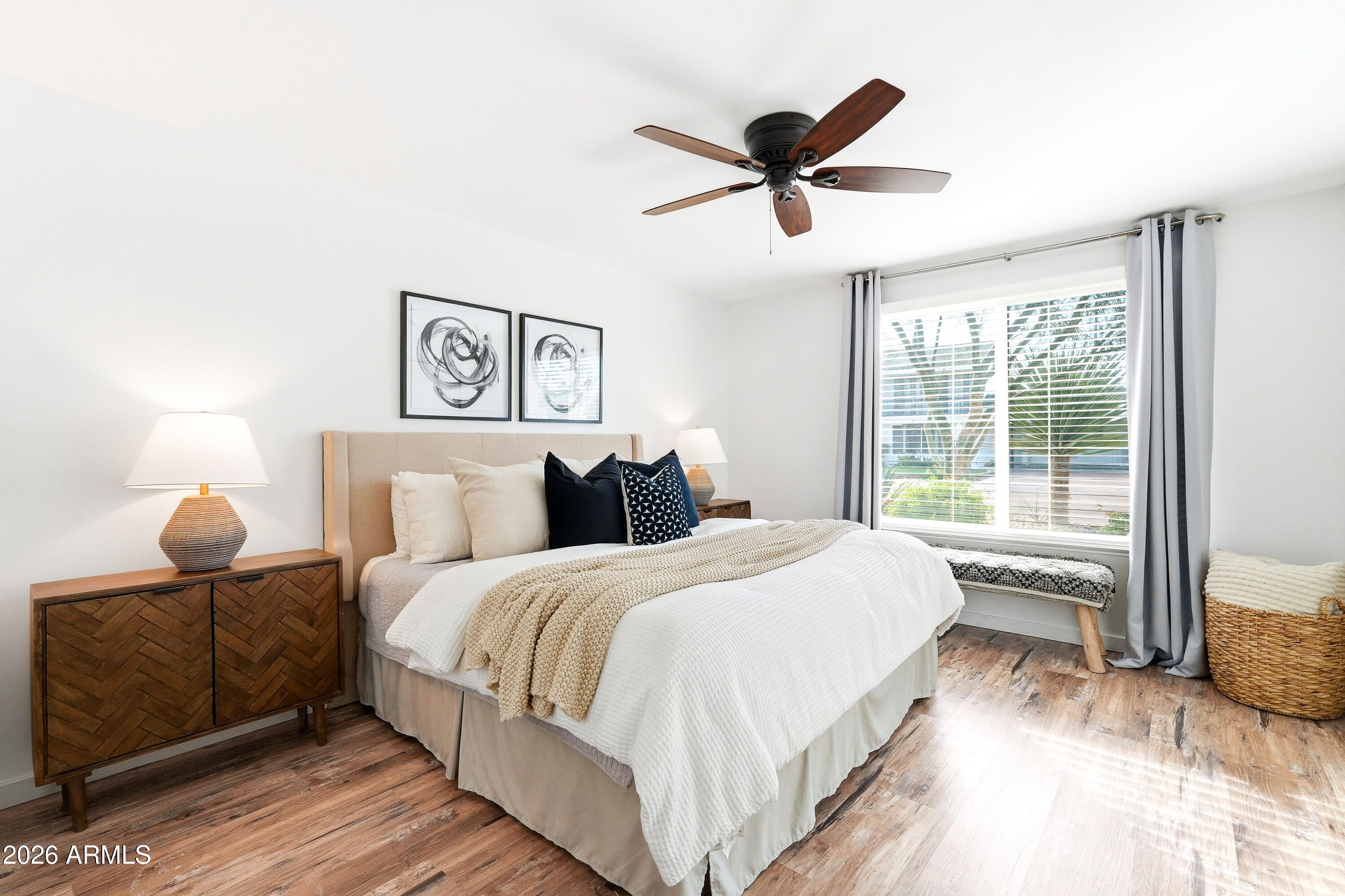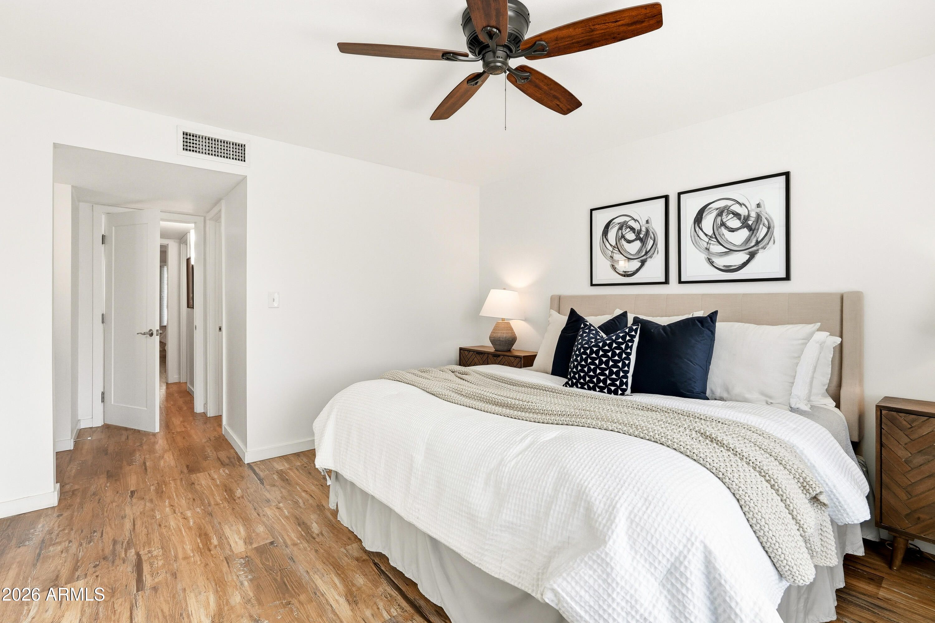 Remodeled 2-bedroom, 2-bath townhome located in the highly sought-after Villa Monterey, a Historic Preservation Community showcasing iconic architecture and exuding charm! This thoughtfully updated residence welcomes you with a beautiful living room featuring wood-look flooring and a neutral, timeless palette that complements any style of furnishings. The galley kitchen offers crisp white cabinetry, stainless steel appliances, and ample prep space—perfect for everyday living and entertaining. Both bedrooms are generously sized and paired with beautifully updated bathrooms featuring modern vanities and finishes. Step outside to your private, low-maintenance landscaped yard, an ideal spot to relax. Heated community pool and spa. Short walk to Old Town Scottsdale, where you can enjoy world-class dining, shopping, galleries, and entertainment. A rare opportunity to own a move-in-ready home in one of Scottsdale's most beloved historic and walkable communities.
