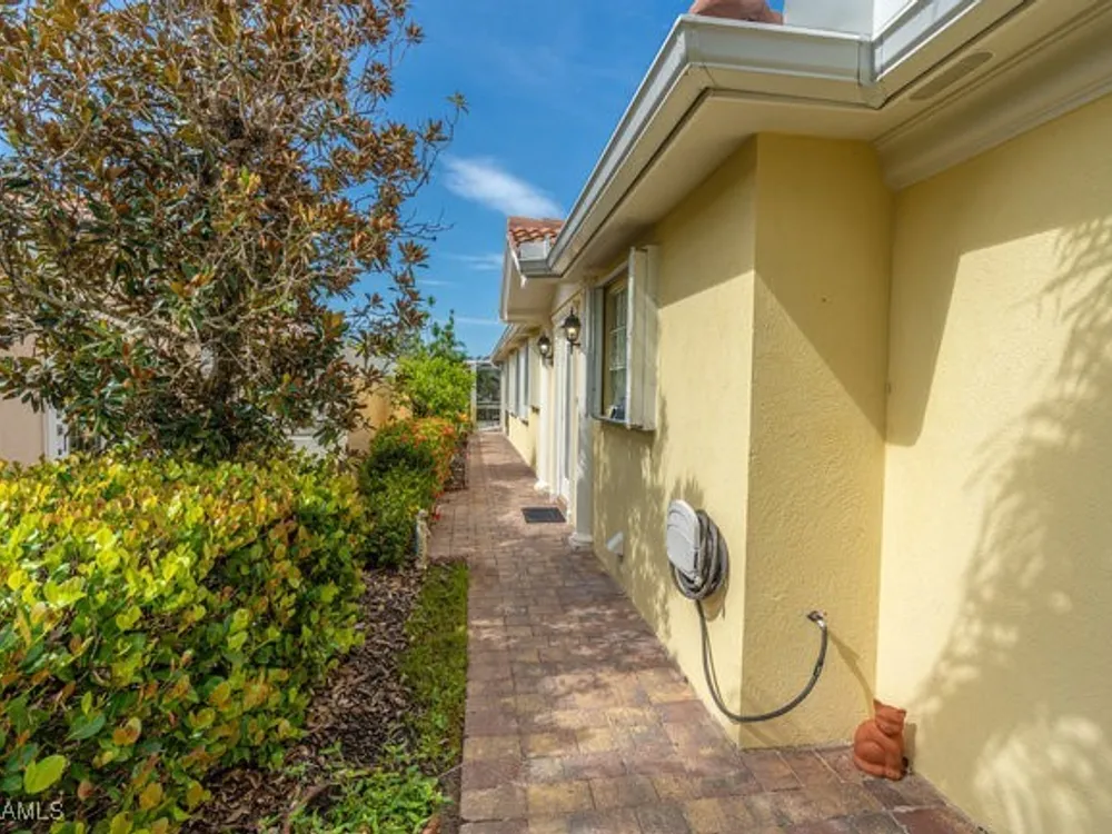 Just listed in the gated community of VeronaWalk is this partially furnished, two bedrooms with den/two bath Capri attached villa. A welcoming side path leads to a glass entry door and into the vaulted ceiling home. The centrally located kitchen has an abundance of cupboards and expansive counters with a great breakfast bar for informal dining. Floors are tile in much of the home with carpet in the living room area and bedrooms. Ample storage extends into the full laundry room with more cabinetry and a large pantry closet. Access to an attached two car garage is from the laundry for ease of entry. The split bedroom floorplan locates the two-bedroom suites on opposite ends of the unit with each having their own full bath and walk-in closet. This home has a New Roof. A tremendous upgrade leaving you worry free for years to come. Windows have accordion shutters making storm preparation almost effortless. Upon exiting from a bank of sliding doors is a covered lanai that opens into a screen enclosure with an inviting rectangular pool. A six-foot concrete wall is a buffer on both sides of the patio for privacy when relaxing poolside or entertaining. A meandering waterway can be enjoyed from your outdoor space.