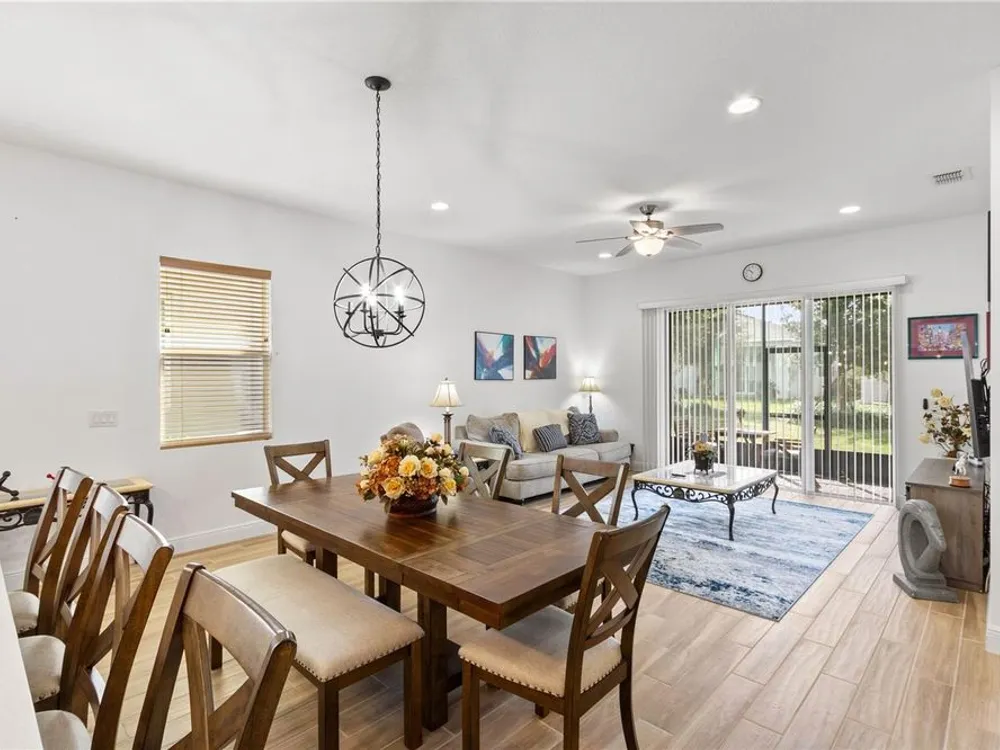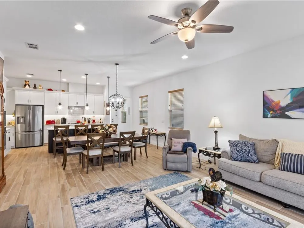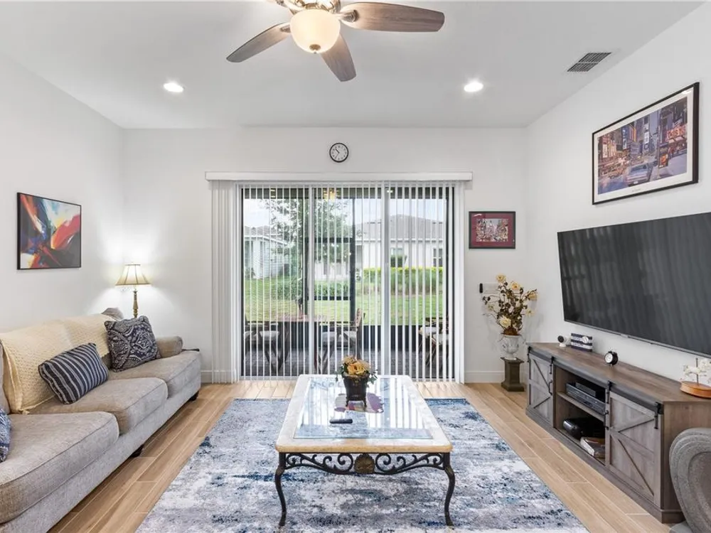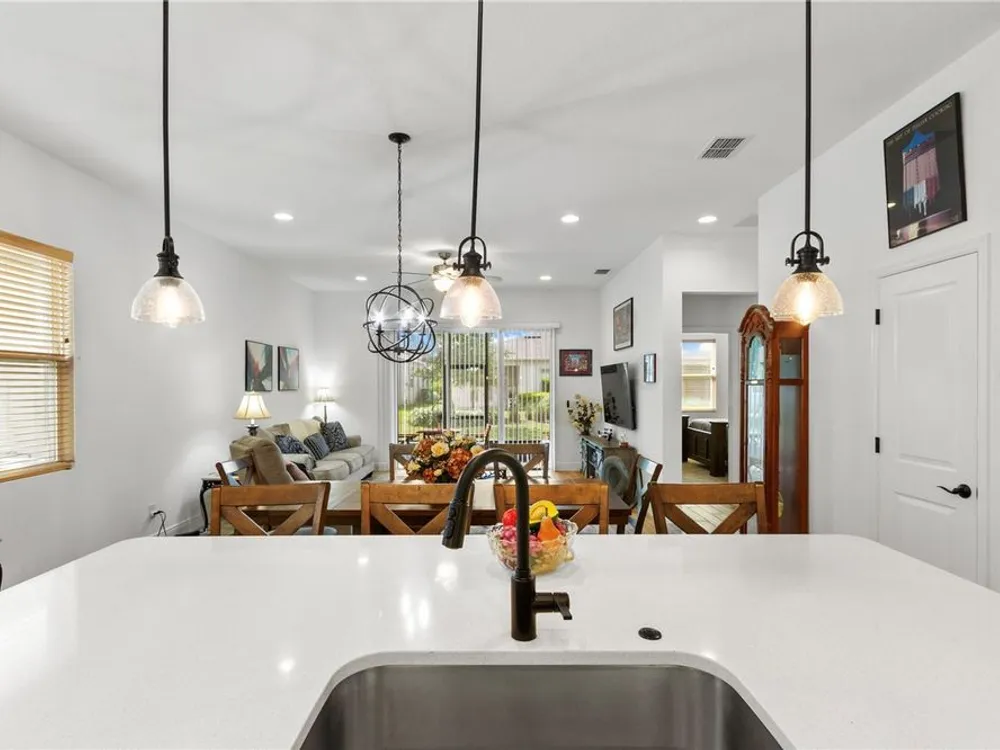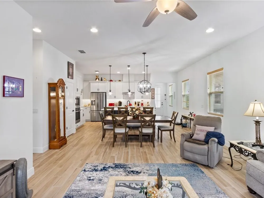 Located in the 55+ community of Four Seasons at Orlando in Kissimmee, this beautifully upgraded 2-bedroom, 2-bath home offers modern comfort, thoughtful design, and effortless Florida living. The open-concept floorplan is highlighted by wood-look tile flooring throughout the main living areas, stylish upgraded lighting, and a stunning kitchen featuring two-tone cabinetry, quartz countertops, a large center island, and elegant pendant lights. The spacious great room is enhanced by 7-foot upgraded multi-slide glass doors that open to the rear patio, creating a seamless indoor-outdoor flow perfect for relaxing or entertaining. Enjoy outdoor living year-round with both a screened front entryway and a screened rear patio, offering fresh air and comfort while keeping pests out. Inside, the owner’s suite provides a private retreat with plush carpet, a large walk-in closet, and a luxurious bathroom featuring quartz countertops, an oversized walk-in shower with bench seating, and safety grab bars thoughtfully installed for convenience. The guest bedroom and upgraded second bathroom are perfect for visitors, while the dedicated laundry room includes a top-of-the-line Samsung front-load washer and dryer with storage pedestals. Every detail of this home reflects quality and comfort, making it a standout in a community known for its resort-style amenities, including a heated pool and spa, tennis and pickleball courts, fitness center, golf, clubhouse, billiards, bocce ball, ballroom, and full-time Activities Director—all within a guard-gated neighborhood minutes from Orlando dining, shopping, and entertainment. This is the Florida lifestyle at its finest.