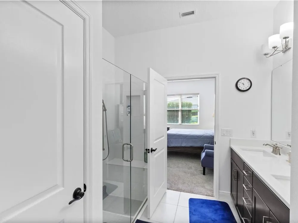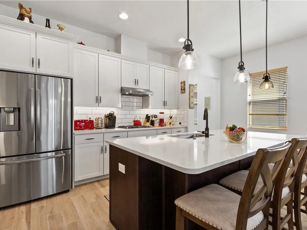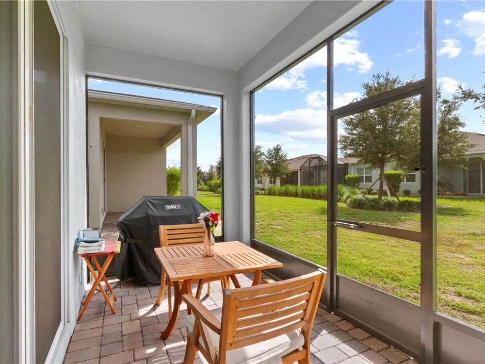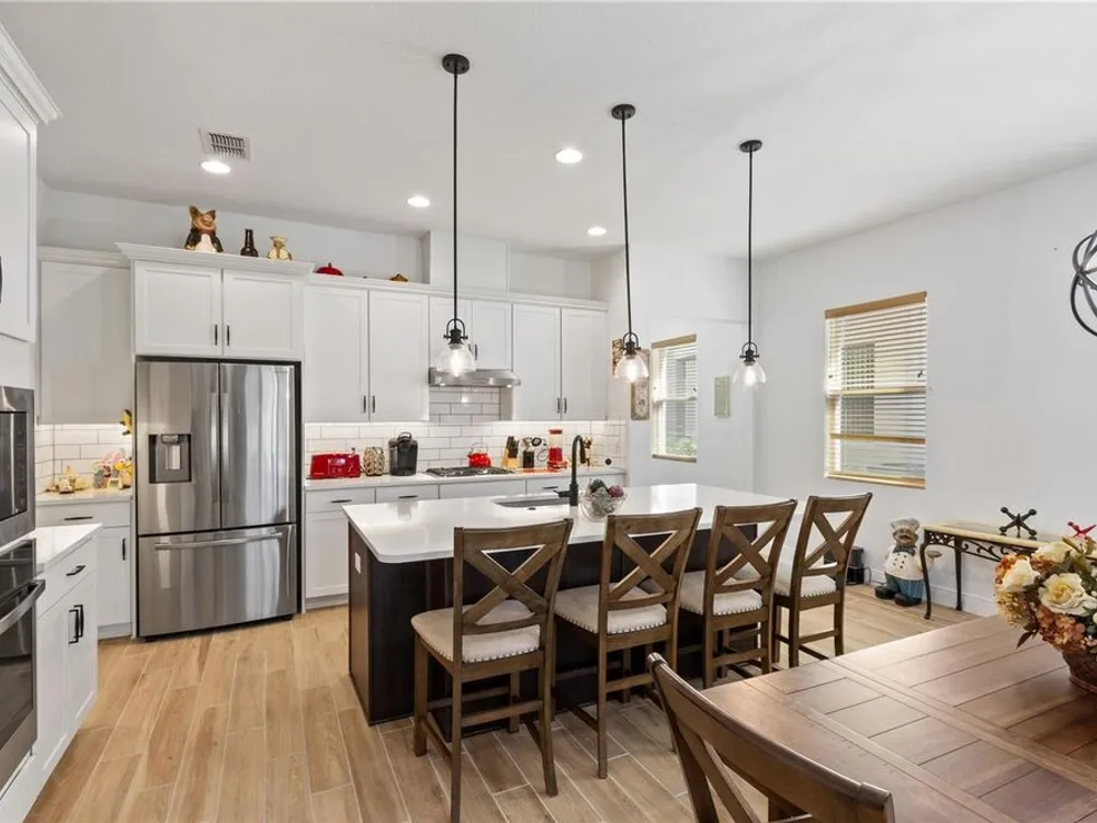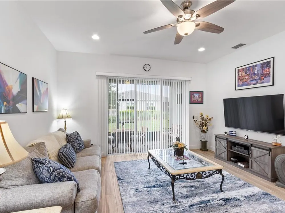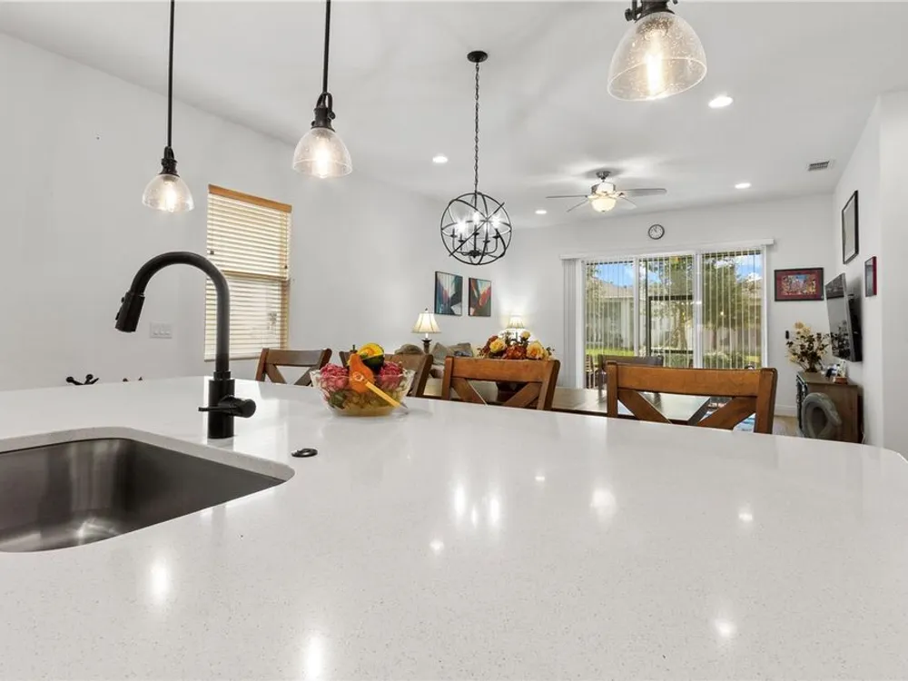 Located in the 55+ community of Four Seasons at Orlando in Kissimmee, this beautifully upgraded 2-bedroom, 2-bath home offers modern comfort, thoughtful design, and effortless Florida living. The open-concept floorplan is highlighted by wood-look tile flooring throughout the main living areas, stylish upgraded lighting, and a stunning kitchen featuring two-tone cabinetry, quartz countertops, a large center island, and elegant pendant lights. The spacious great room is enhanced by 7-foot upgraded multi-slide glass doors that open to the rear patio, creating a seamless indoor-outdoor flow perfect for relaxing or entertaining. Enjoy outdoor living year-round with both a screened front entryway and a screened rear patio, offering fresh air and comfort while keeping pests out. Inside, the owner’s suite provides a private retreat with plush carpet, a large walk-in closet, and a luxurious bathroom featuring quartz countertops, an oversized walk-in shower with bench seating, and safety grab bars thoughtfully installed for convenience. The guest bedroom and upgraded second bathroom are perfect for visitors, while the dedicated laundry room includes a top-of-the-line Samsung front-load washer and dryer with storage pedestals. Every detail of this home reflects quality and comfort, making it a standout in a community known for its resort-style amenities, including a heated pool and spa, tennis and pickleball courts, fitness center, golf, clubhouse, billiards, bocce ball, ballroom, and full-time Activities Director—all within a guard-gated neighborhood minutes from Orlando dining, shopping, and entertainment. This is the Florida lifestyle at its finest.