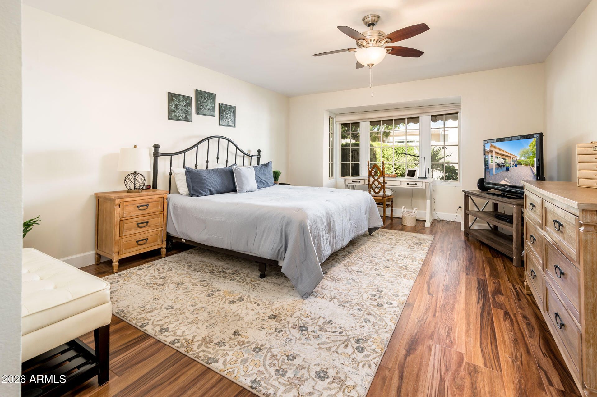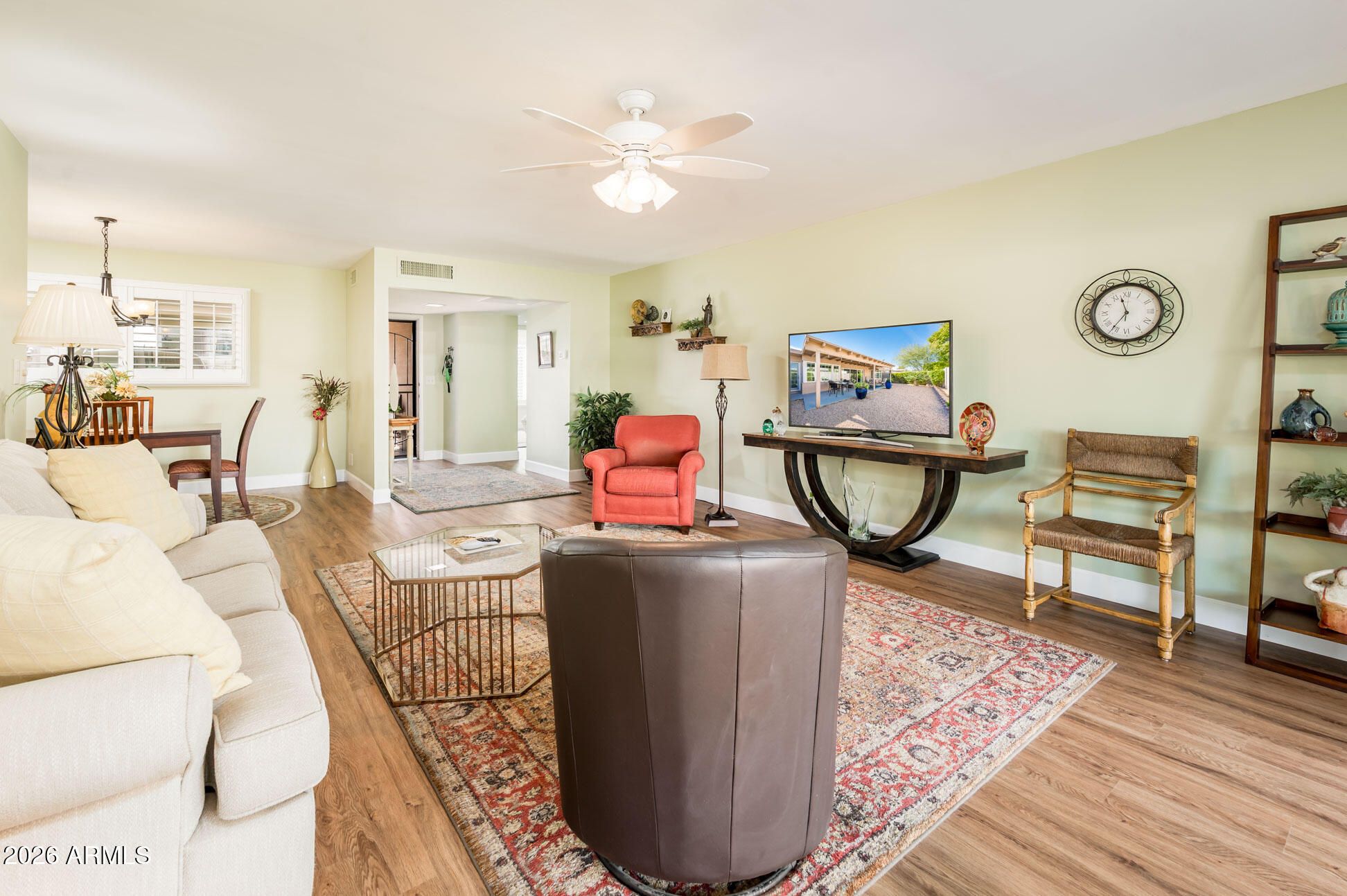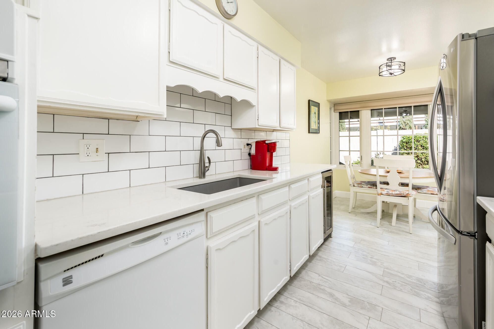 Hurry to see this charming, well-maintained property in the highly sought-after retirement community (age 55+) and historic destination of Villa Monterey. This upgraded home is bright and inviting, featuring north-south exposure, soft-toned two-tone paint, skylights, and plenty of natural light. One of the most popular floor plans includes two spacious bedrooms, two bathrooms, a large living room, a formal dining area, and a two-car, covered parking area. Both the primary suite and the kitchen feature bay windows. The kitchen is equipped with updated appliances, quartz countertops, a tile backsplash, a wine refrigerator, and a wonderful kitchen eat-in area. The refrigerator, washer, and dryer are included with the home. Numerous updates have been made throughout the property, including renovations to both bathrooms, base molding, shutters, beautiful flooring, a patio glass slider, ceiling fans, and more. The easy-maintenance front and backyard landscaping is immaculate and features a relaxing north-facing covered patio. Located in a desirable area of Scottsdale, this home is conveniently near Old Town Scottsdale, spring training baseball, the Scottsdale Fashion Mall, freeways, parks, golf courses, bike paths, restaurants, and Talking Stick Casino.