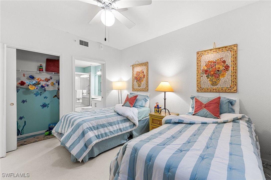 Prepare to be stunned by the sensational water views from this "Pebble Creek" condo! You will walk by a charming guest bedroom, and a Flex room that can be made into a 3rd bedroom, an office or a dining room and on to a lovely open contemporary kitchen with Stainless appliances, to the living area. The large Primary Bedroom also faces the lake and amply sized lanai. With private underground garages, and a short walk to one of 3 tram-to-beach stations, the community also boasts a beautiful clubhouse/pool/fitness/social building positioned right in the middle of the lake. The unit also has a private staircase to the community sidewalk, making a short walk to the pool even easier! The condo has only had one owner, was never rented and has been meticulously cared for. In fact, the condo has a brand new HVAC system, newer Hot Water Heater, newer smoke detectors and Roofs replaced in recent years. Looking to just move in? The furnishings are available as well, as a Turnkey offering.