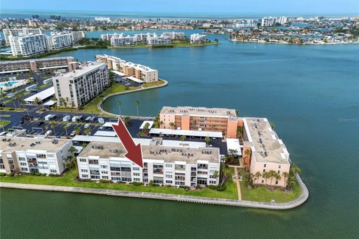 Welcome to Bay Island, a desirable 55+, GATED, waterfront community just minutes from St. Pete Beach and downtown St. Petersburg. This DIRECT BAYFRONT 1BR/1BA condo offers east-facing views of Bay Island Cove and Boca Ciega Bay from a private balcony equipped with a hurricane-rated electric shutter with manual override. The interior features granite countertops, stainless steel appliances, a breakfast bar, updated cabinetry, tile flooring in the living areas and bathroom, and carpet in the bedroom. The spacious primary suite accommodates a king-size bed and includes two closets—one walk-in—plus balcony access and WATER VIEWS. The bathroom includes beadboard wainscoting, a granite vanity, and a walk-in tiled shower with a built-in granite bench. RECENT UPGRADES include high-impact double-pane windows, a new A/C system, and a new water heater—all installed in 2017. A same-floor storage closet and nearby laundry facilities on the 4th floor add convenience. Bay Island offers six heated pools, multiple spas, tennis and pickleball courts, a marina with boat docks (first-come, first-serve), his and hers fitness centers, and a clubhouse with a ballroom, billiards, card room, and craft room. Outdoor amenities include BBQ grills, tiki huts, a 1.5-mile waterfront walking trail, and a waterfront car wash station. The community is walkable to Corey Avenue Market, shops, and restaurants, with public transportation access to the beach. Approximately 15 minutes to downtown St. Pete and 45 minutes to Tampa International Airport. Ideal for full-time or seasonal living.