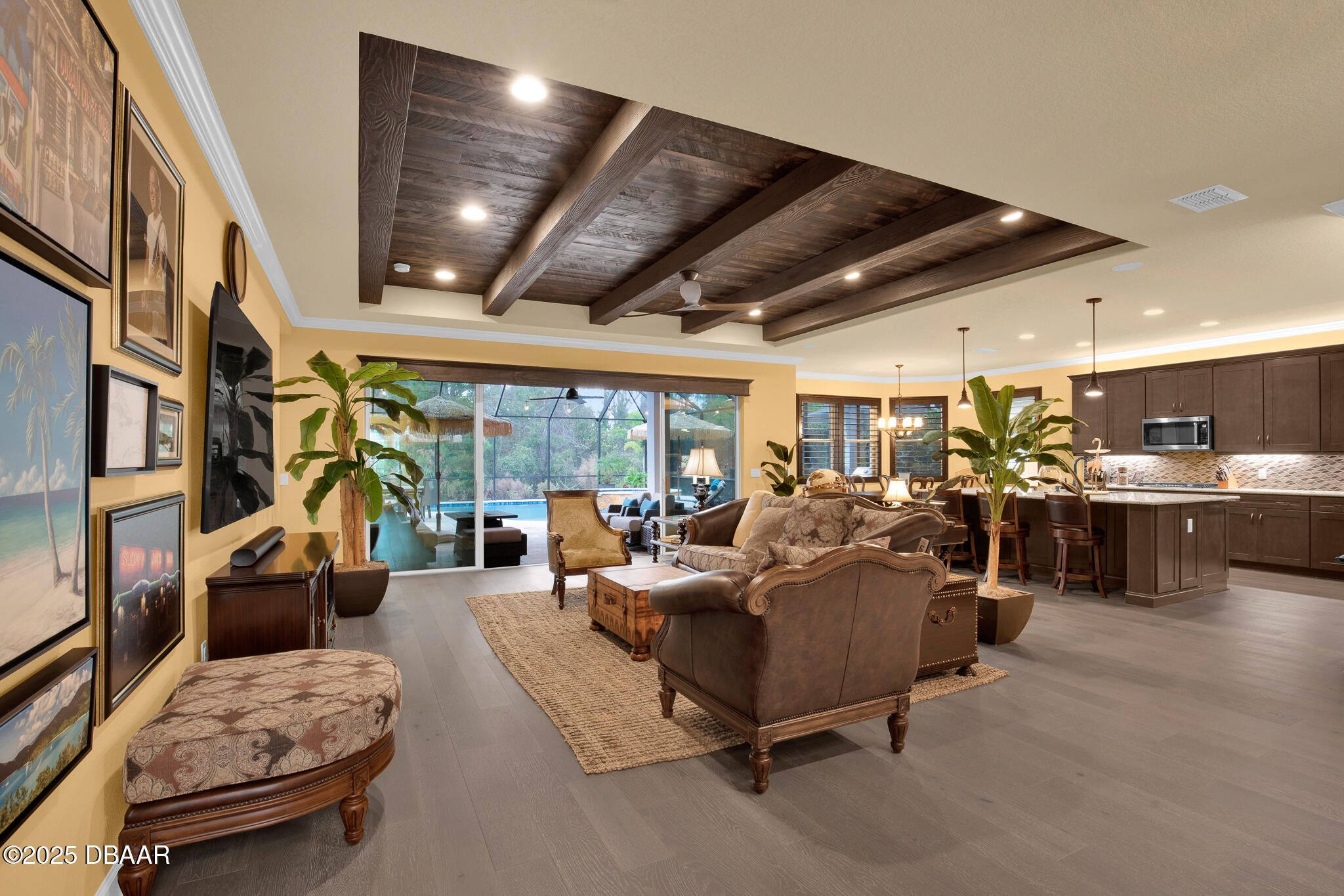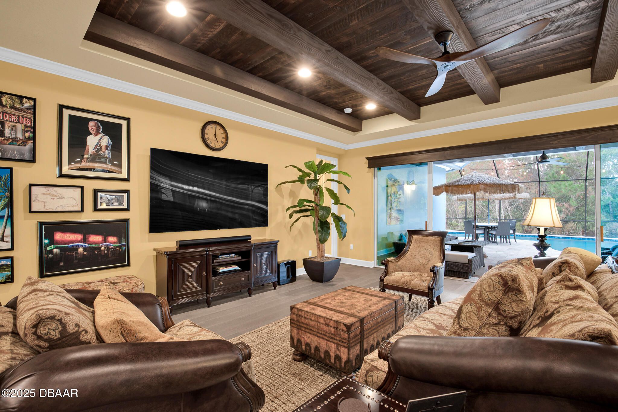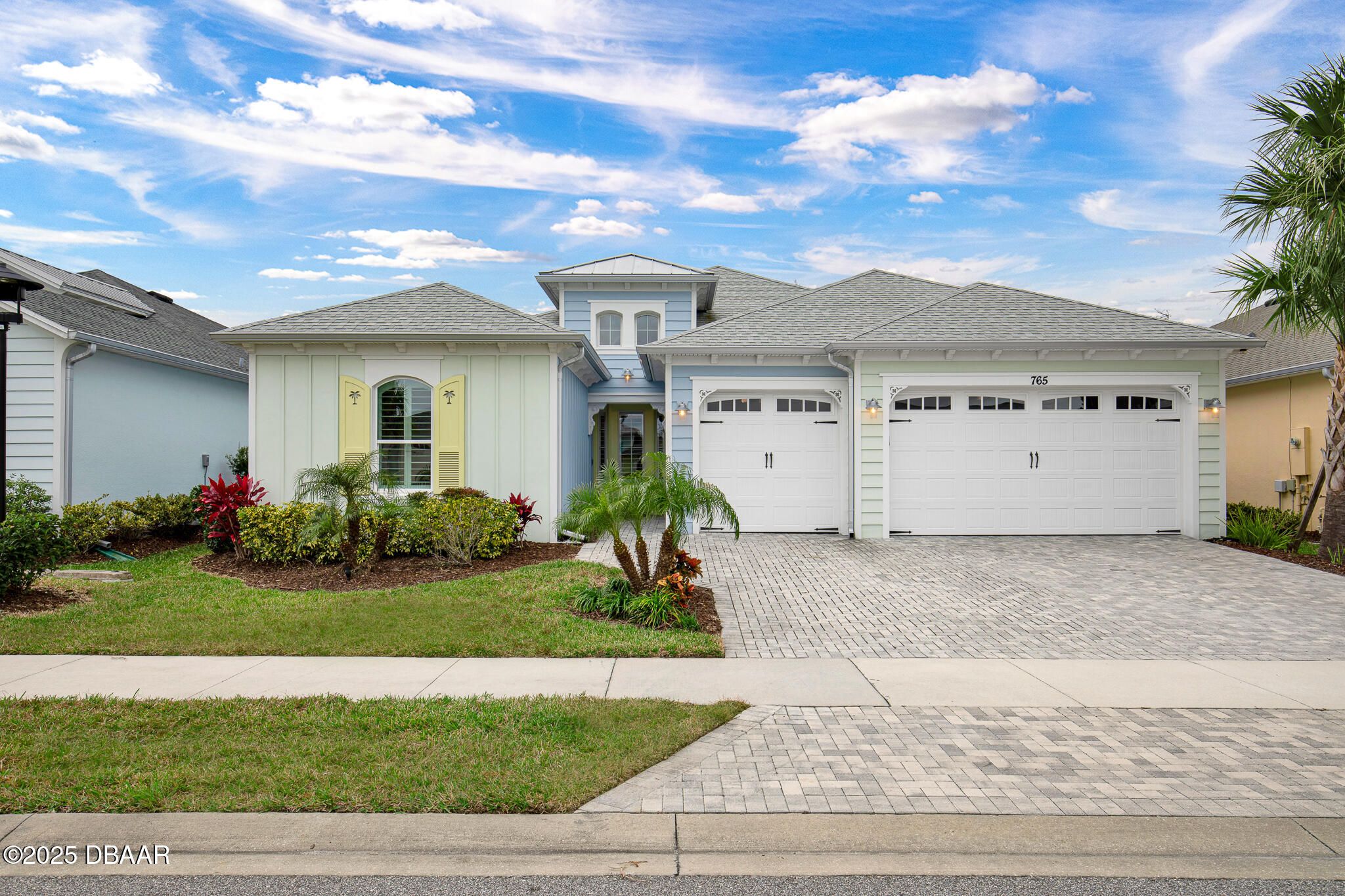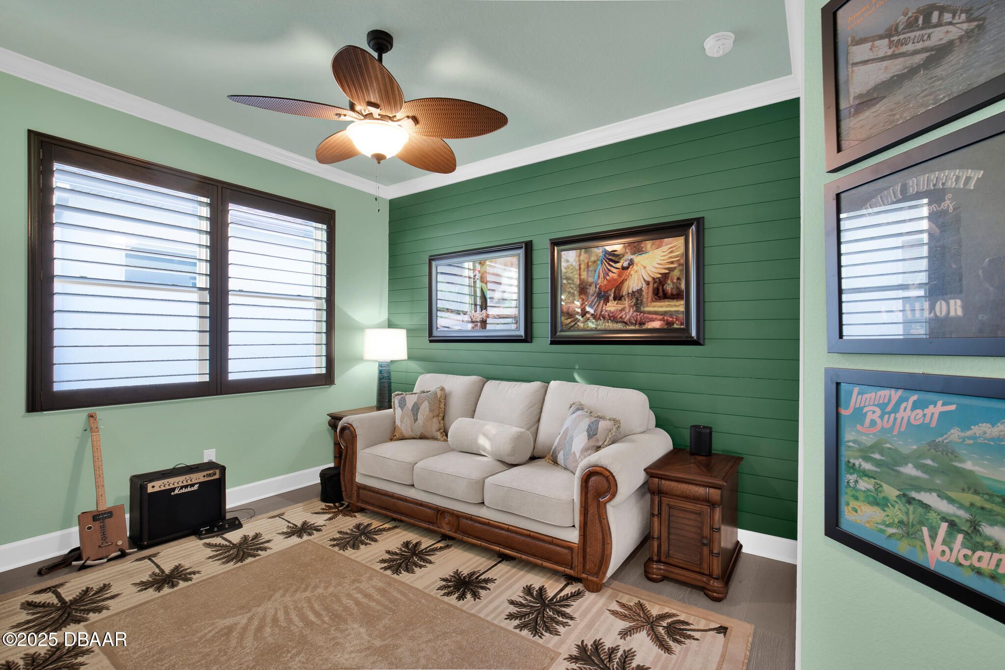 Spectacular Designer Island Collection home with heated pool & spa. This outstanding St. Bart home is finished with a West Indies Island flair and Hemmingway's style. Rich engineered hardwood floors and dark solid wood tongue and groove ceilings with matching beams accent the foyer, Great Room, Library and Master Bedroom. Solid wood Plantation Shutters accent the style of this home. Library features elegant floor to ceiling wood shelving and cabinets. Dining room and guest rooms boast shiplap accent walls. Doors are 8' tall, cabinets are top of the line quality with 42'' uppers. Laundry room is finished with abundant cabinets and a sink. Sliding glass doors lead to a covered lanai with unique ceiling treatment and pool with heat pump, gas heater and cooling system. Generac whole house backup generator. Built in speakers. With Latitude Margaritaville's world class amenities this home has it all.
