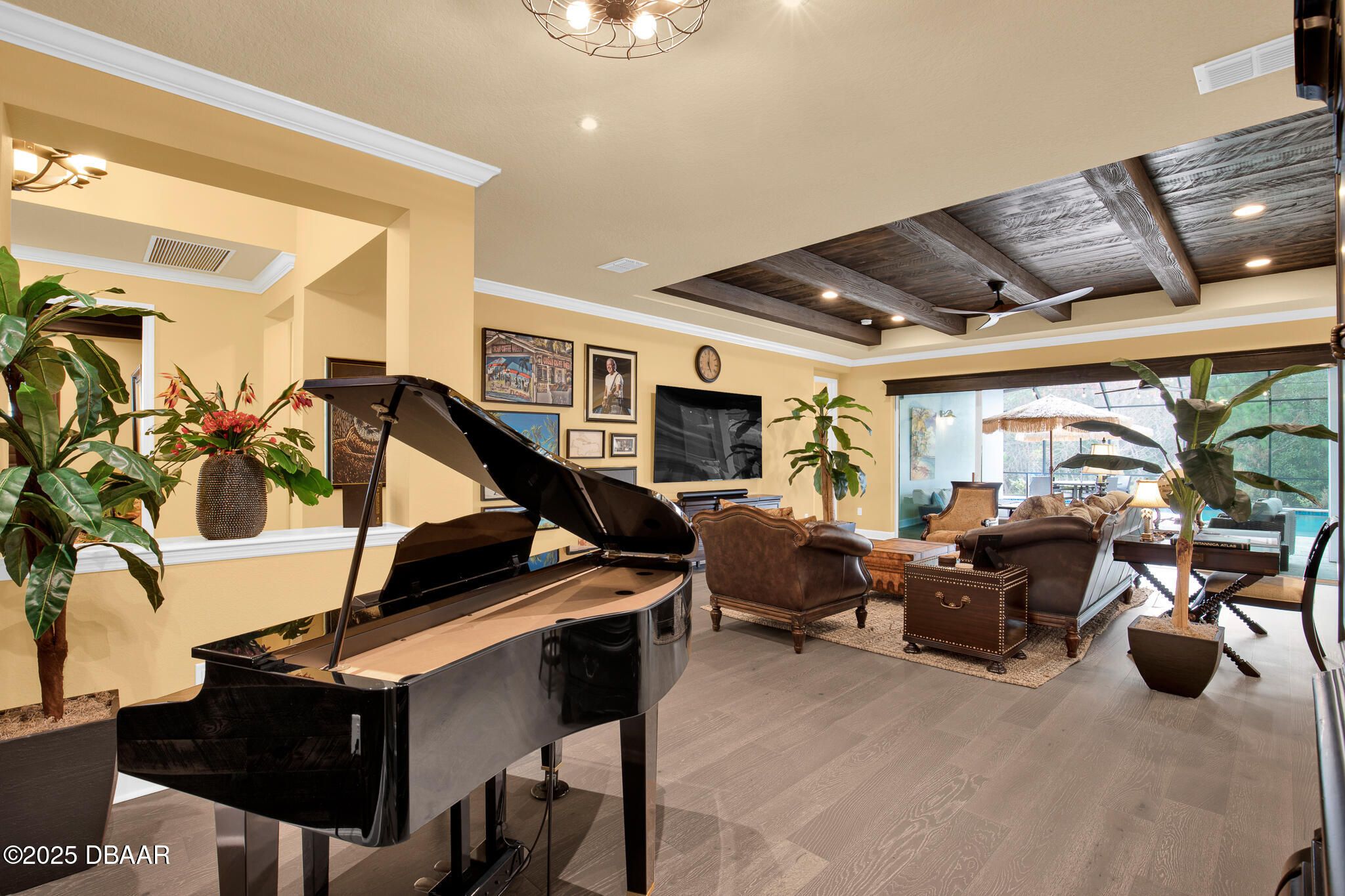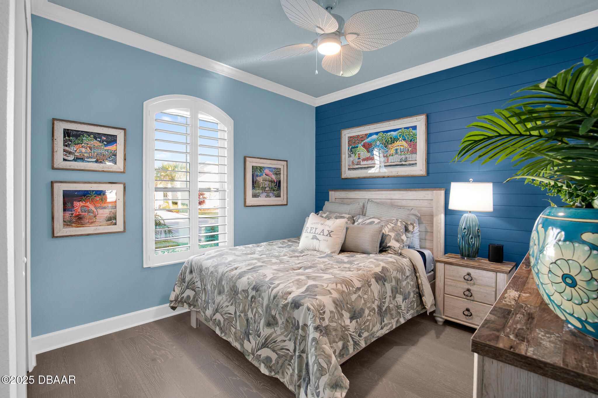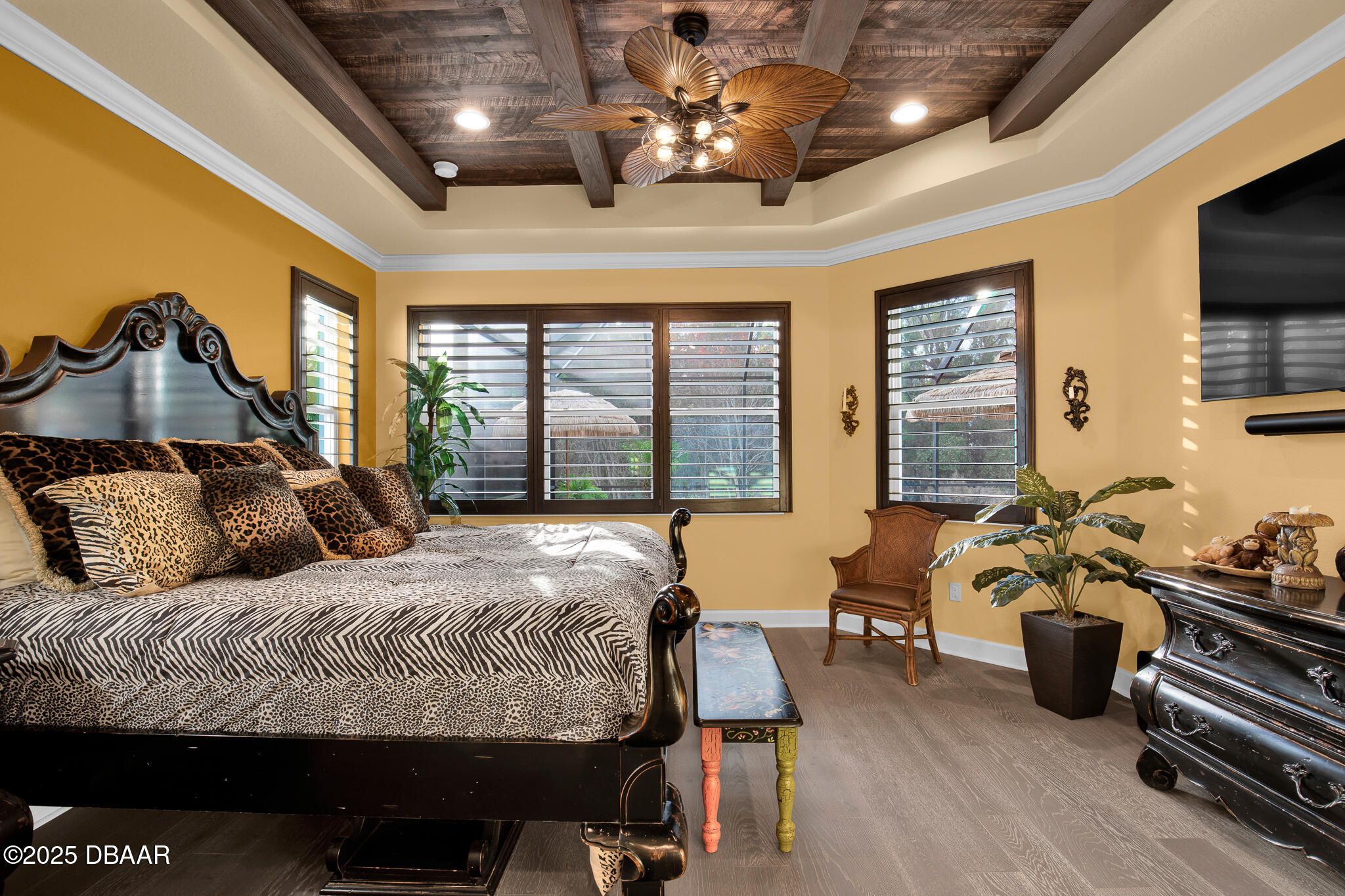 Spectacular Designer Island Collection home with heated pool & spa. This outstanding St. Bart home is finished with a West Indies Island flair and Hemmingway's style. Rich engineered hardwood floors and dark solid wood tongue and groove ceilings with matching beams accent the foyer, Great Room, Library and Master Bedroom. Solid wood Plantation Shutters accent the style of this home. Library features elegant floor to ceiling wood shelving and cabinets. Dining room and guest rooms boast shiplap accent walls. Doors are 8' tall, cabinets are top of the line quality with 42'' uppers. Laundry room is finished with abundant cabinets and a sink. Sliding glass doors lead to a covered lanai with unique ceiling treatment and pool with heat pump, gas heater and cooling system. Generac whole house backup generator. Built in speakers. With Latitude Margaritaville's world class amenities this home has it all.