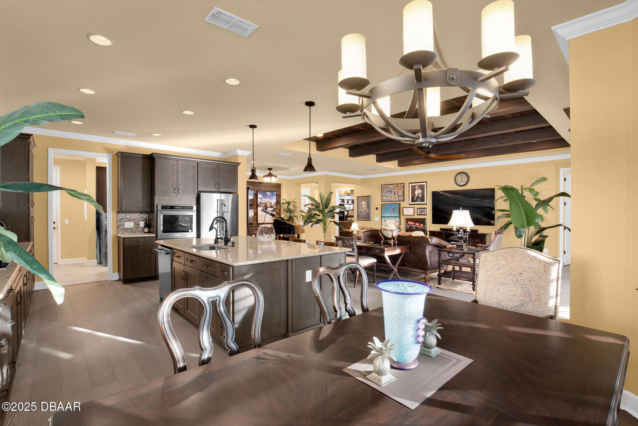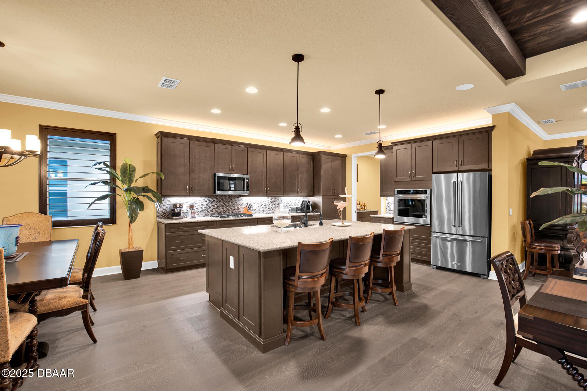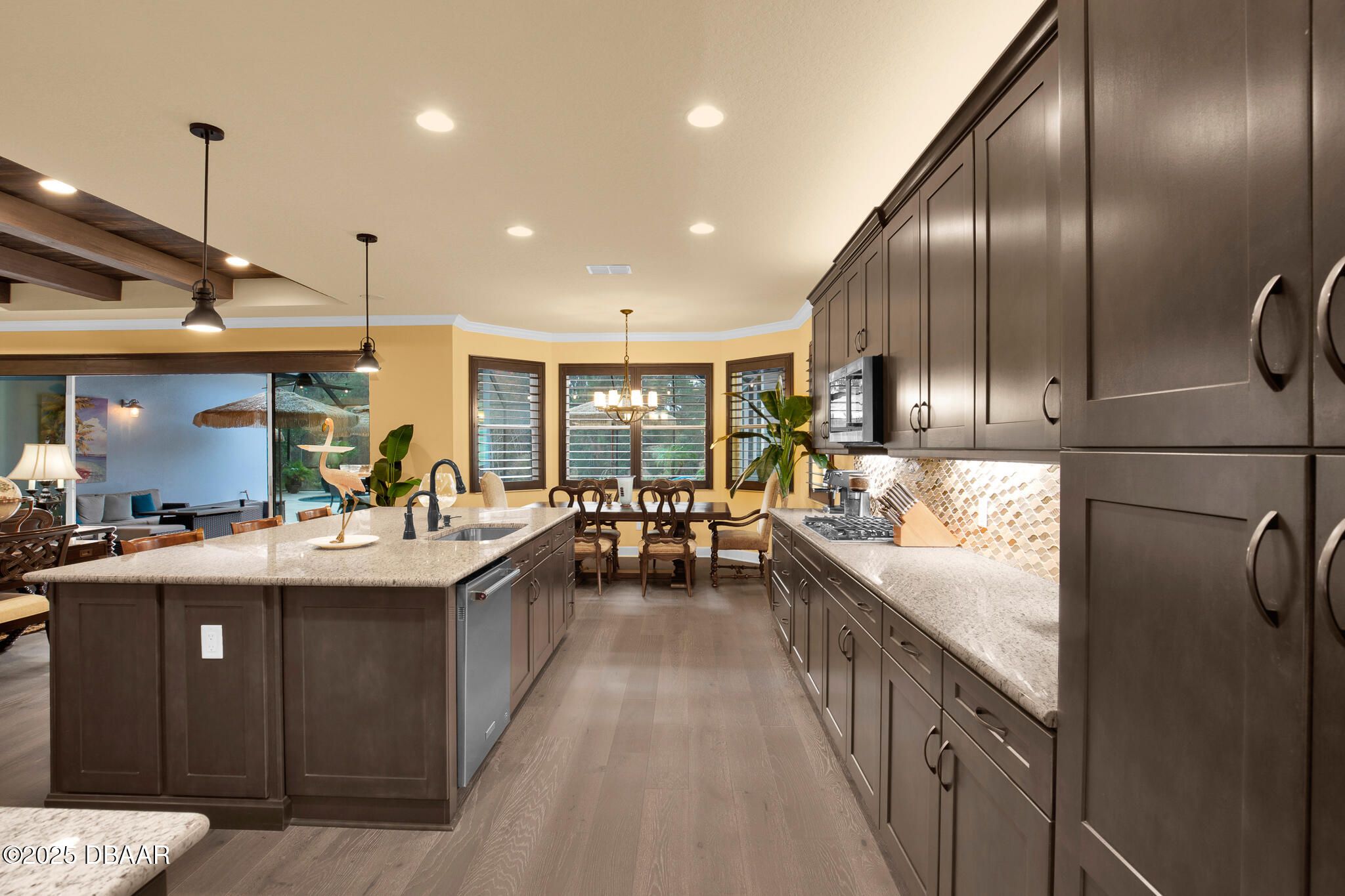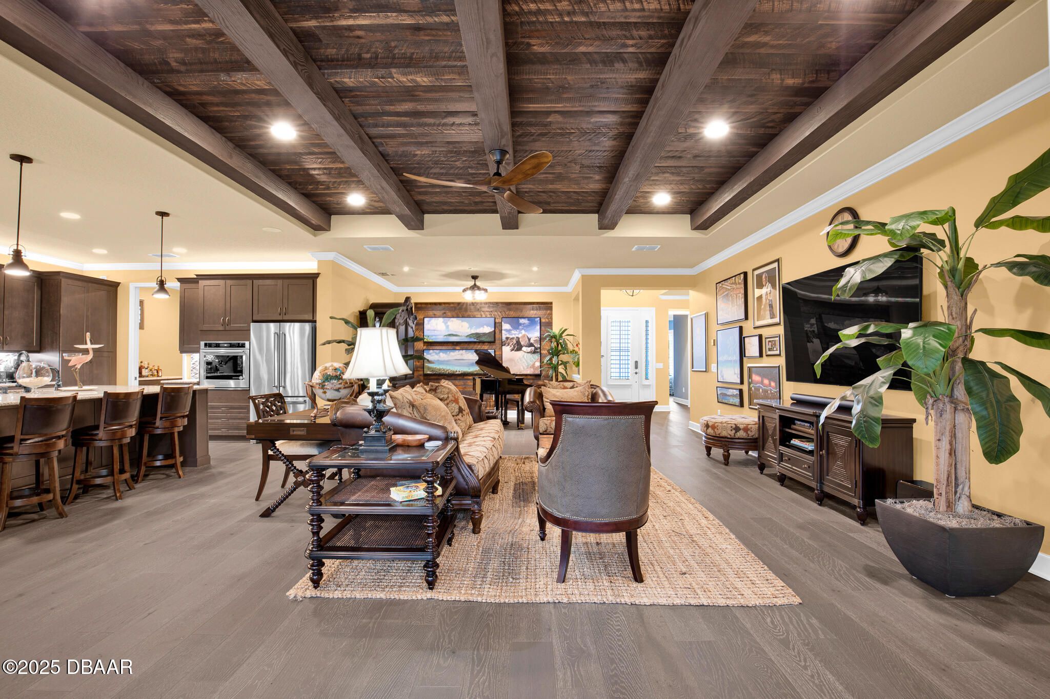 Spectacular Designer Island Collection home with heated pool & spa. This outstanding St. Bart home is finished with a West Indies Island flair and Hemmingway's style. Rich engineered hardwood floors and dark solid wood tongue and groove ceilings with matching beams accent the foyer, Great Room, Library and Master Bedroom. Solid wood Plantation Shutters accent the style of this home. Library features elegant floor to ceiling wood shelving and cabinets. Dining room and guest rooms boast shiplap accent walls. Doors are 8' tall, cabinets are top of the line quality with 42'' uppers. Laundry room is finished with abundant cabinets and a sink. Sliding glass doors lead to a covered lanai with unique ceiling treatment and pool with heat pump, gas heater and cooling system. Generac whole house backup generator. Built in speakers. With Latitude Margaritaville's world class amenities this home has it all.