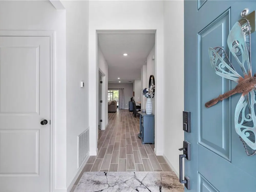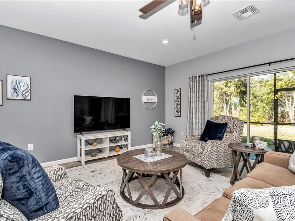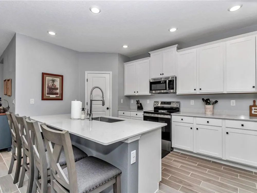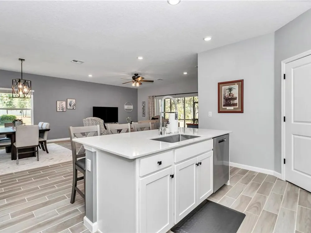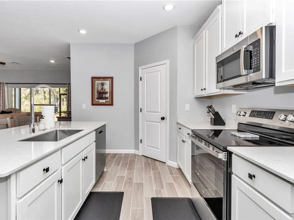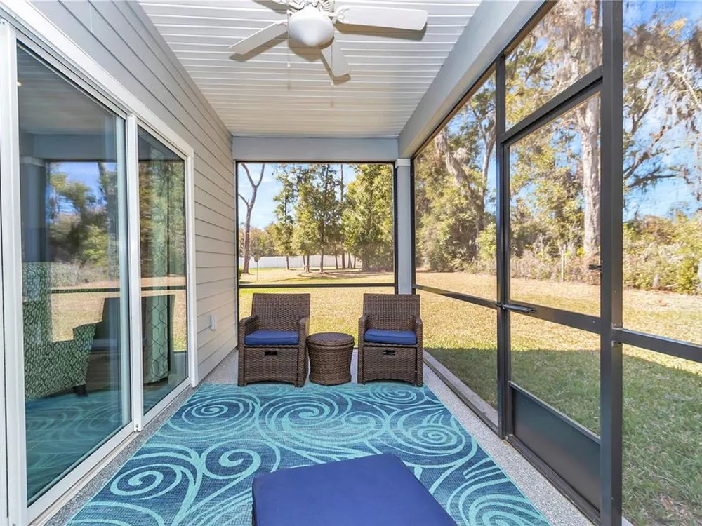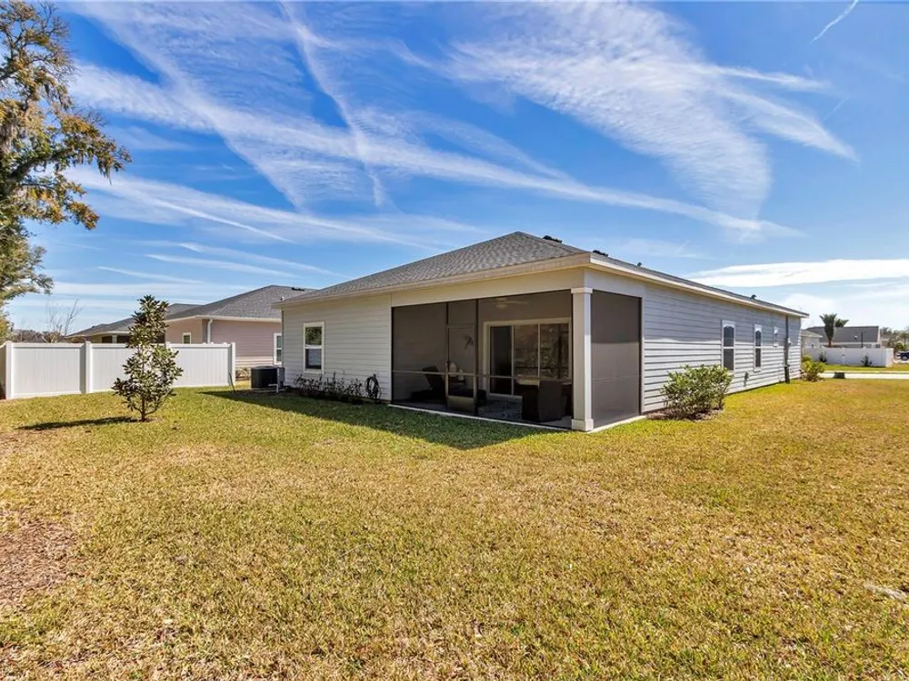 This beautifully upgraded home exudes style and comfort, perfect for those seeking a blend of elegance and functionality. Upon entering, you're greeted by white 42" cabinets with crown molding, complemented by quartz countertops and an island, creating an ideal space for entertaining guests. Transition seamlessly through the rolling wall to the covered, screened lanai, offering a serene retreat with no rear neighbors. Inside, the home boasts gorgeous wood-inspired tile throughout all living areas, adding warmth and sophistication. With four bedrooms and three full baths, including a primary bedroom featuring two closets. There's ample space for relaxation and privacy. Seller has added many upgrades that include GE appliances, upgraded lighting and ceiling fans, modern black hardware, Epoxy coating in the garage and lanai, pull down attic stair for additional storage. Over head garage storage, additional outlets in garage, softener and master bedroom closet organization. Oversized premium lot provides ample space for relaxation and privacy. Residents can enjoy the soon to be opening covered pavilion, community pool, and recreational amenities such as bocce, pickleball, and shuffleboard, promising endless opportunities for leisure and socializing. Conveniently located near restaurants and shopping, and just fifteen minutes from the prestigious World Equestrian Center, this home offers a lifestyle of convenience and luxury in a vibrant community setting. (4th Bedroom is shown as den option with no closet) YOUR NEXT CHAPTER STARTS HERE!