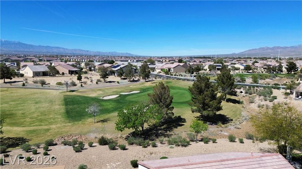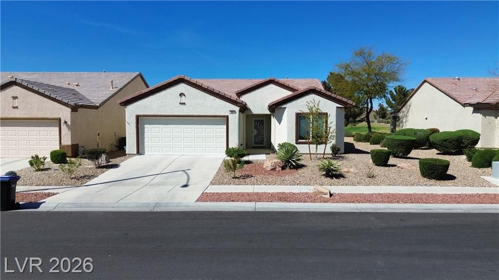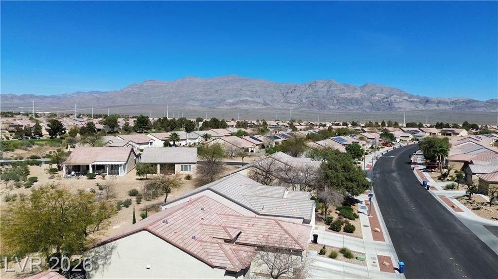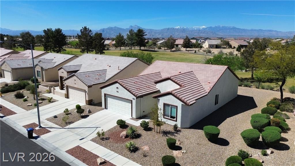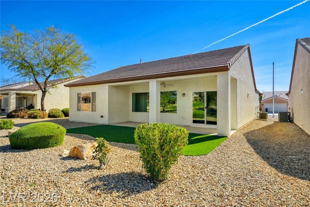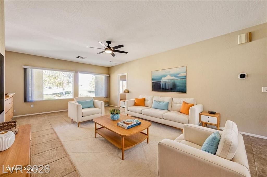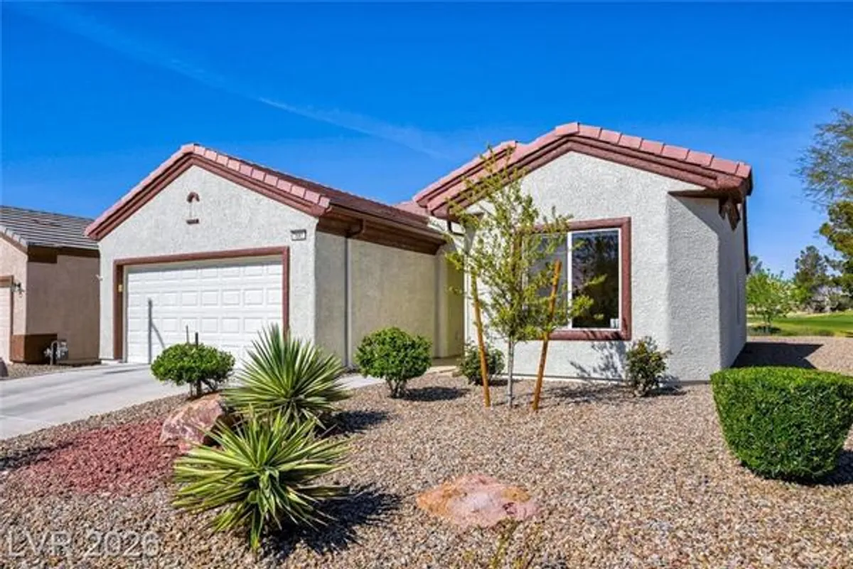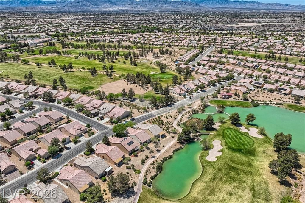 Are you looking for a move-in-ready home? Enjoy breathtaking views of the 5th green, fairway, and Mt. Charleston from your own backyard in this beautiful Cedar model, offering 1,718 SF, fresh exterior paint, and a well-designed open floor plan. Tile flooring runs throughout the main living areas, with carpet in all three bedrooms. The spacious layout includes a separate dining area, perfect for entertaining. The kitchen features white-on-white appliances, tile flooring, and a separate nook. The primary suite offers a double sink vanity and a walk-in closet. Step outside to your extended covered patio and take in the scenery from your easy-maintenance yard. Experience resort-style living in Sun City Aliante, with an indoor pool and spa, fitness center, tennis, basketball, and pickleball courts. Close to Aliante Casino, shopping, VA Hospital, and Freeway.
