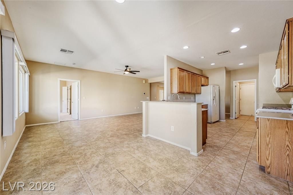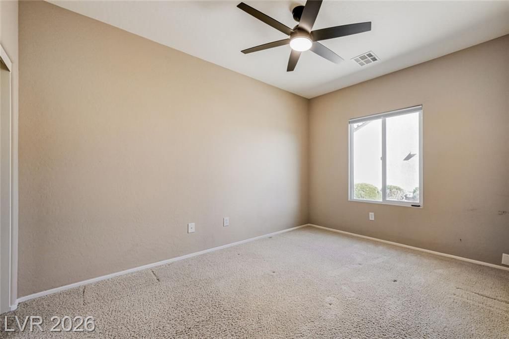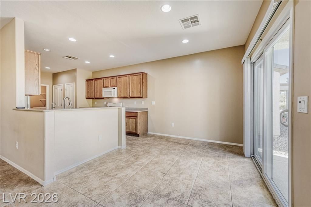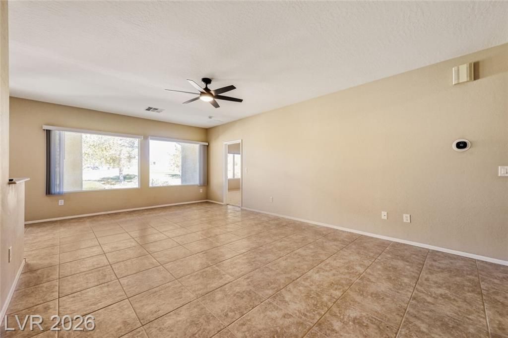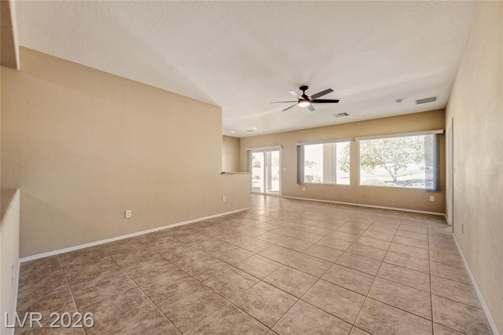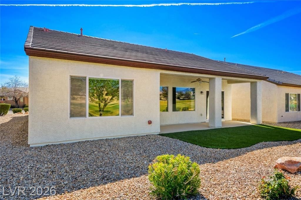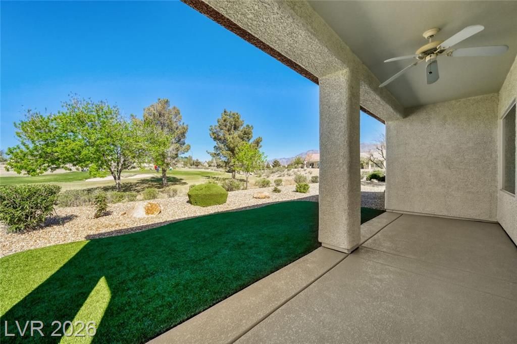 Are you looking for a move-in-ready home? Enjoy breathtaking views of the 5th green, fairway, and Mt. Charleston from your own backyard in this beautiful Cedar model, offering 1,718 SF, fresh exterior paint, and a well-designed open floor plan. Tile flooring runs throughout the main living areas, with carpet in all three bedrooms. The spacious layout includes a separate dining area, perfect for entertaining. The kitchen features white-on-white appliances, tile flooring, and a separate nook. The primary suite offers a double sink vanity and a walk-in closet. Step outside to your extended covered patio and take in the scenery from your easy-maintenance yard. Experience resort-style living in Sun City Aliante, with an indoor pool and spa, fitness center, tennis, basketball, and pickleball courts. Close to Aliante Casino, shopping, VA Hospital, and Freeway.